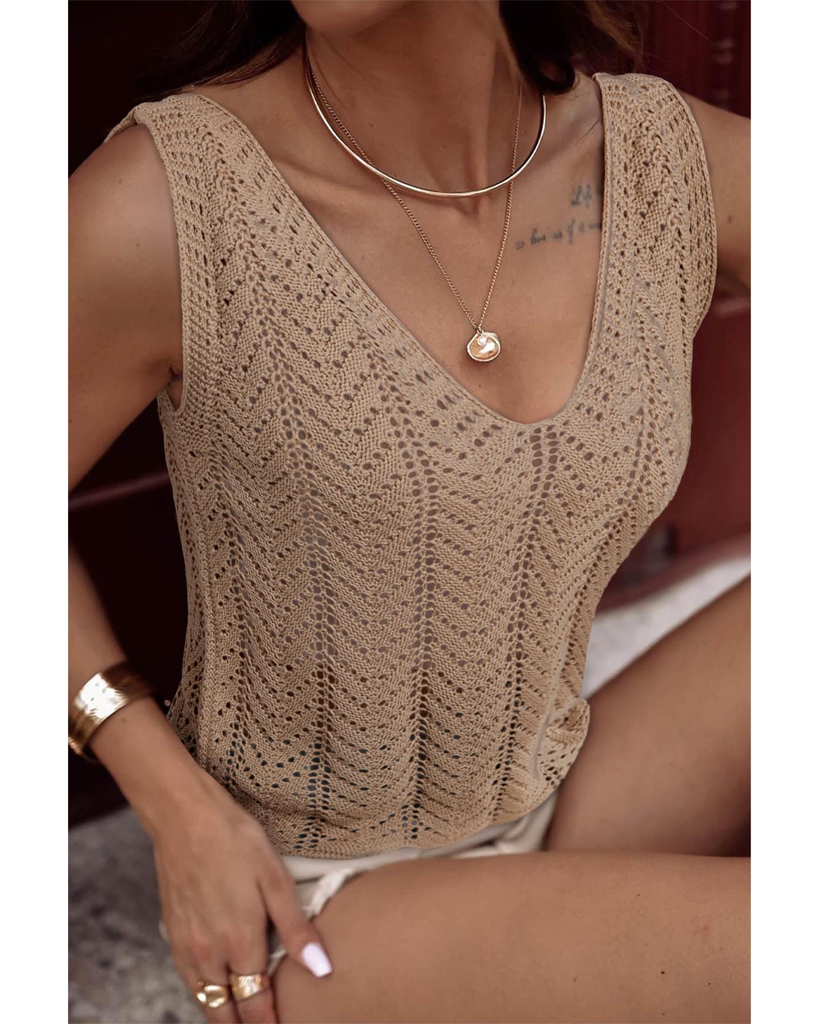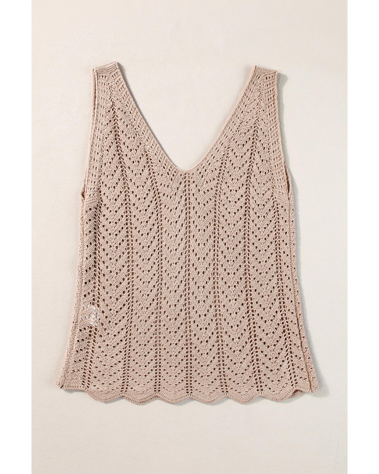 Pale Khaki Scalloped Hem V Neck Crochet Knit Vest – L
