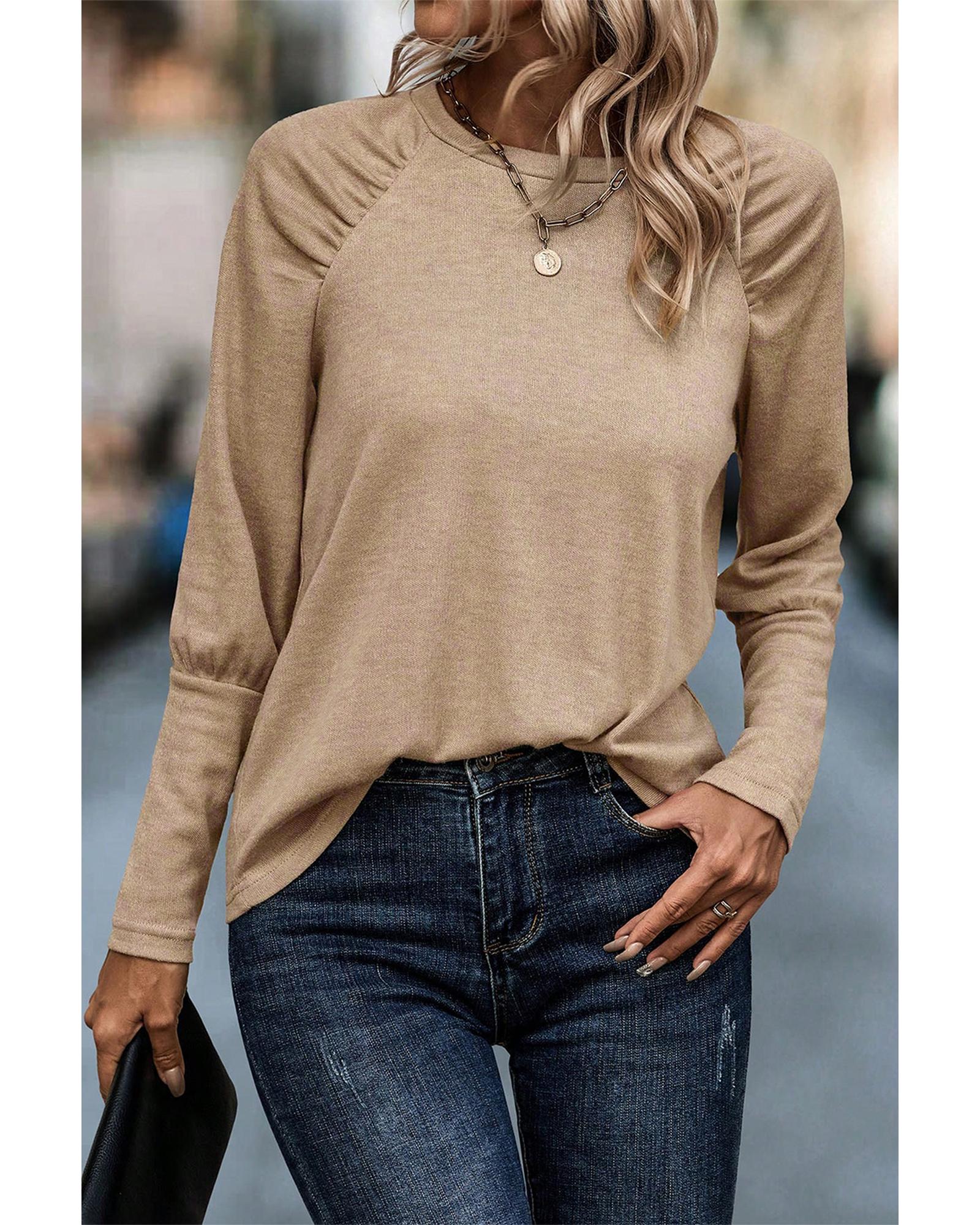 Pale Khaki Solid Ruched Raglan Sleeve Knit Top – M