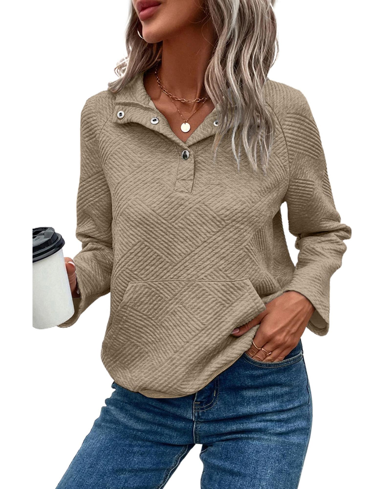 Pale Khaki Textured Knit Buttoned Kangaroo Pocket Sweatshirt – L