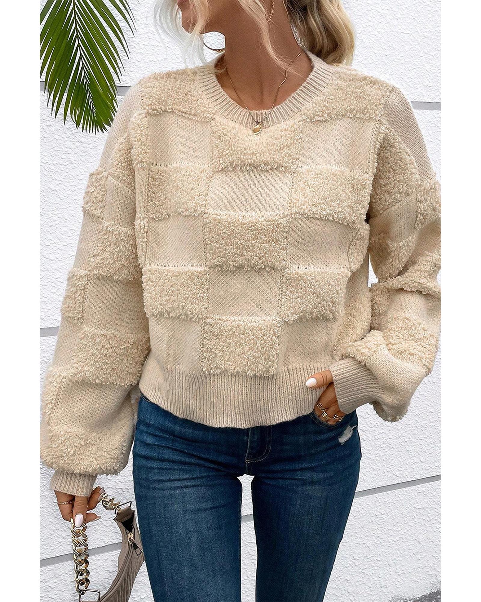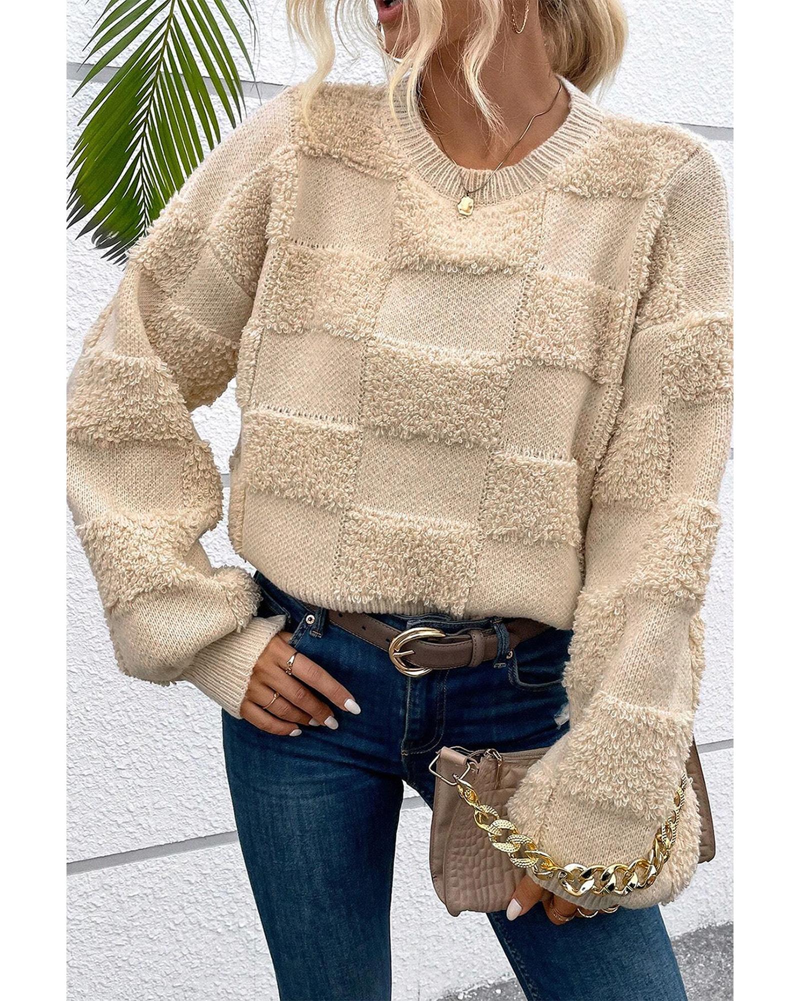 - Parchment Checkered Sherpa Crew Neck Loose Sweater