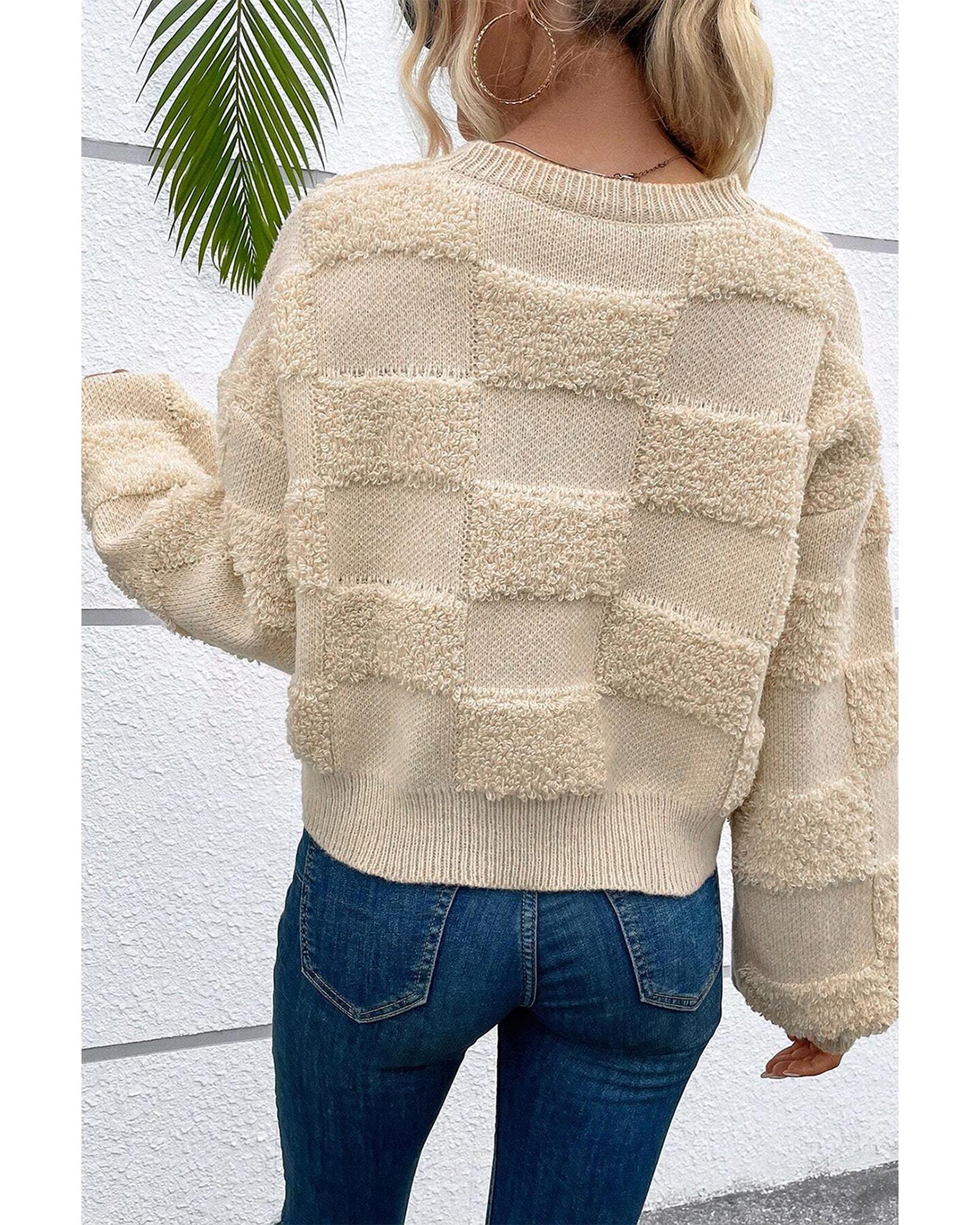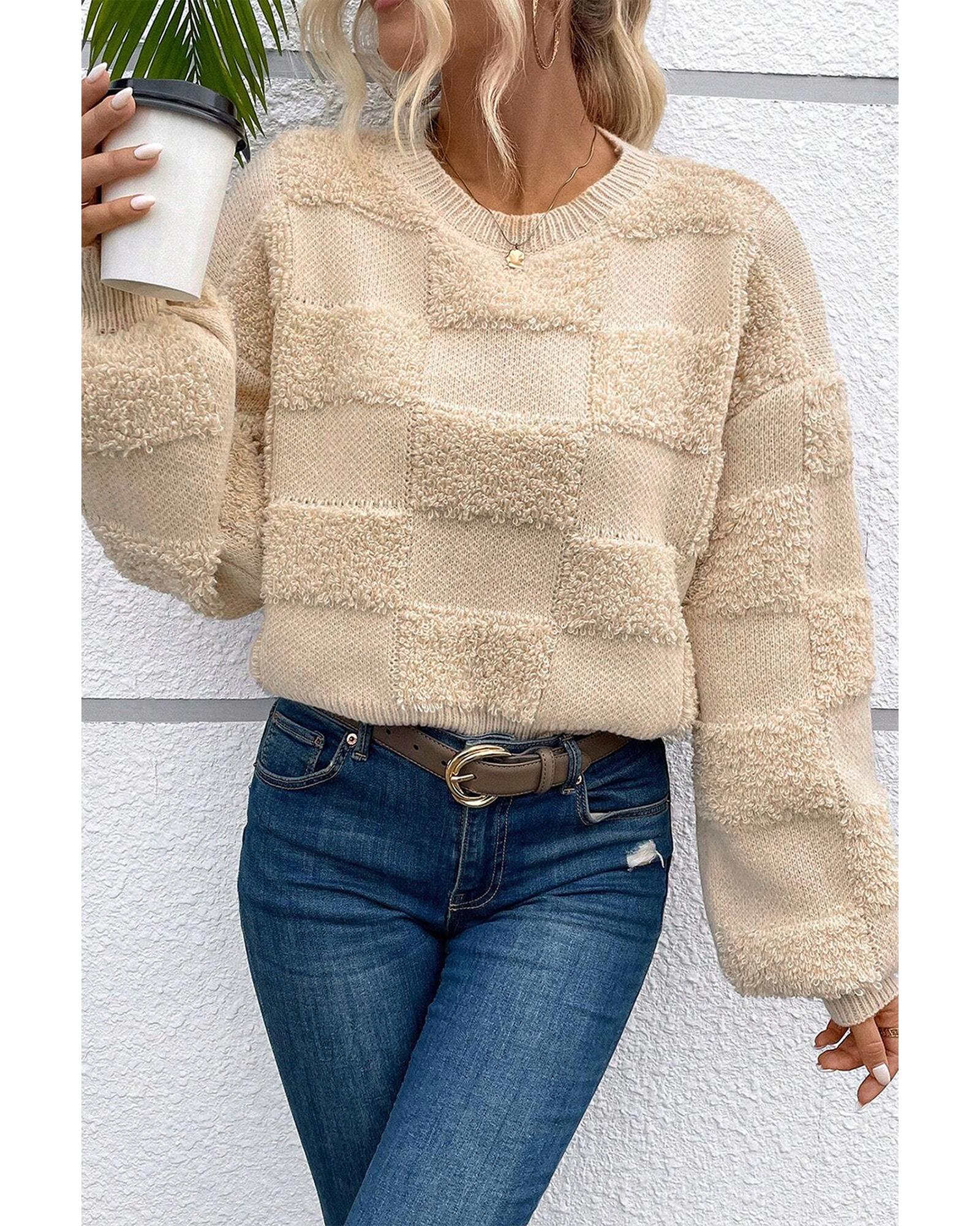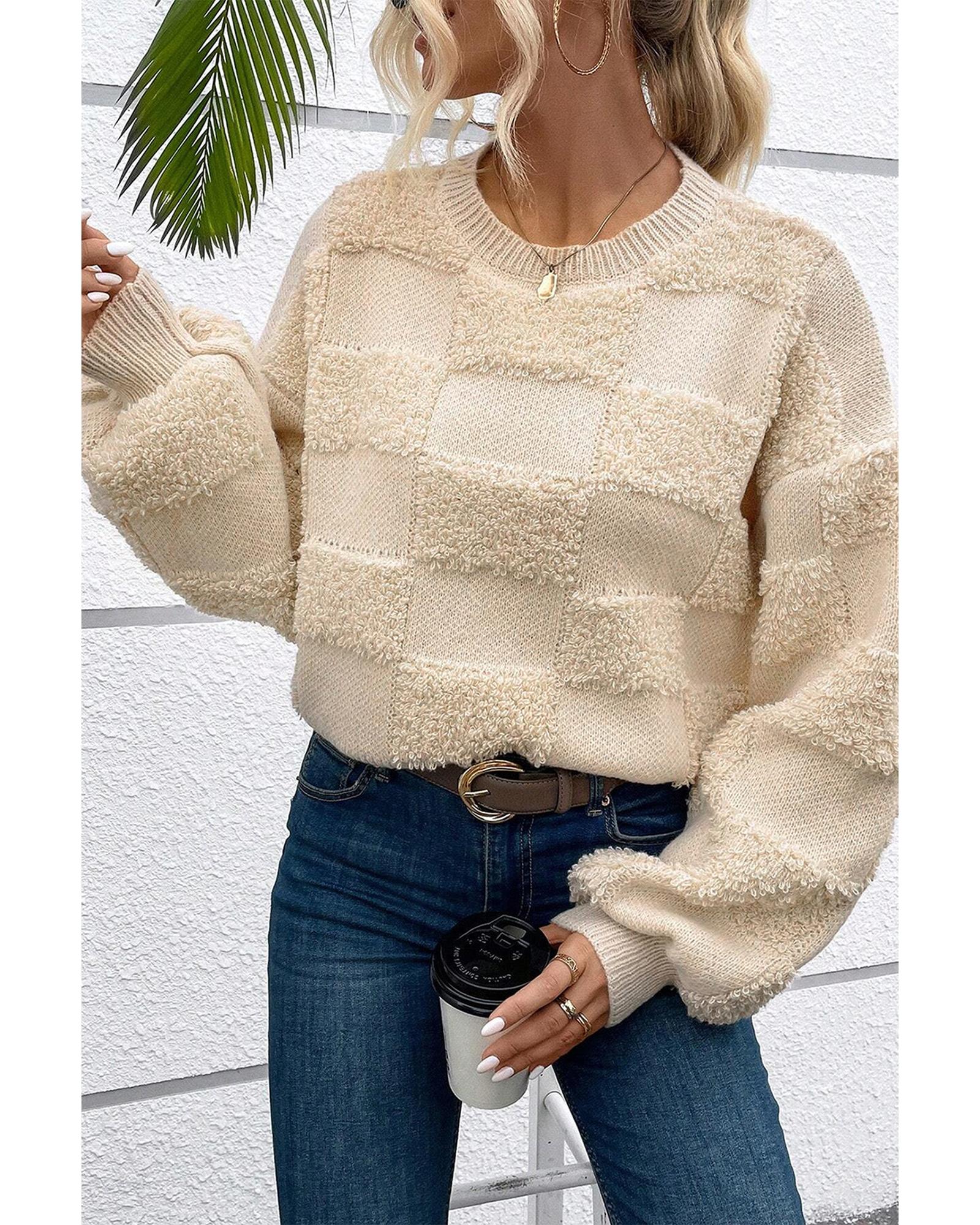 - Parchment Checkered Sherpa Crew Neck Loose Sweater