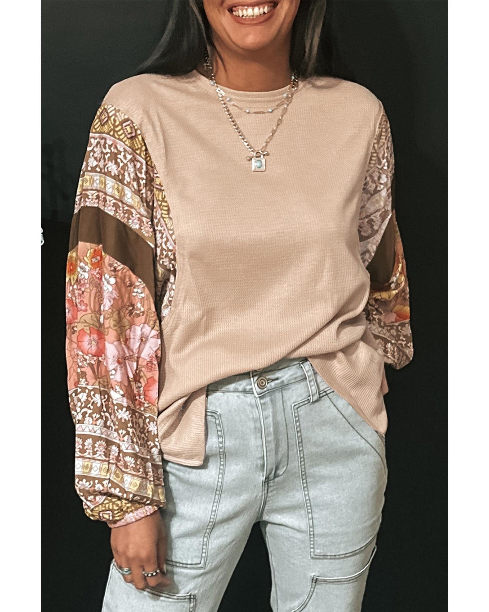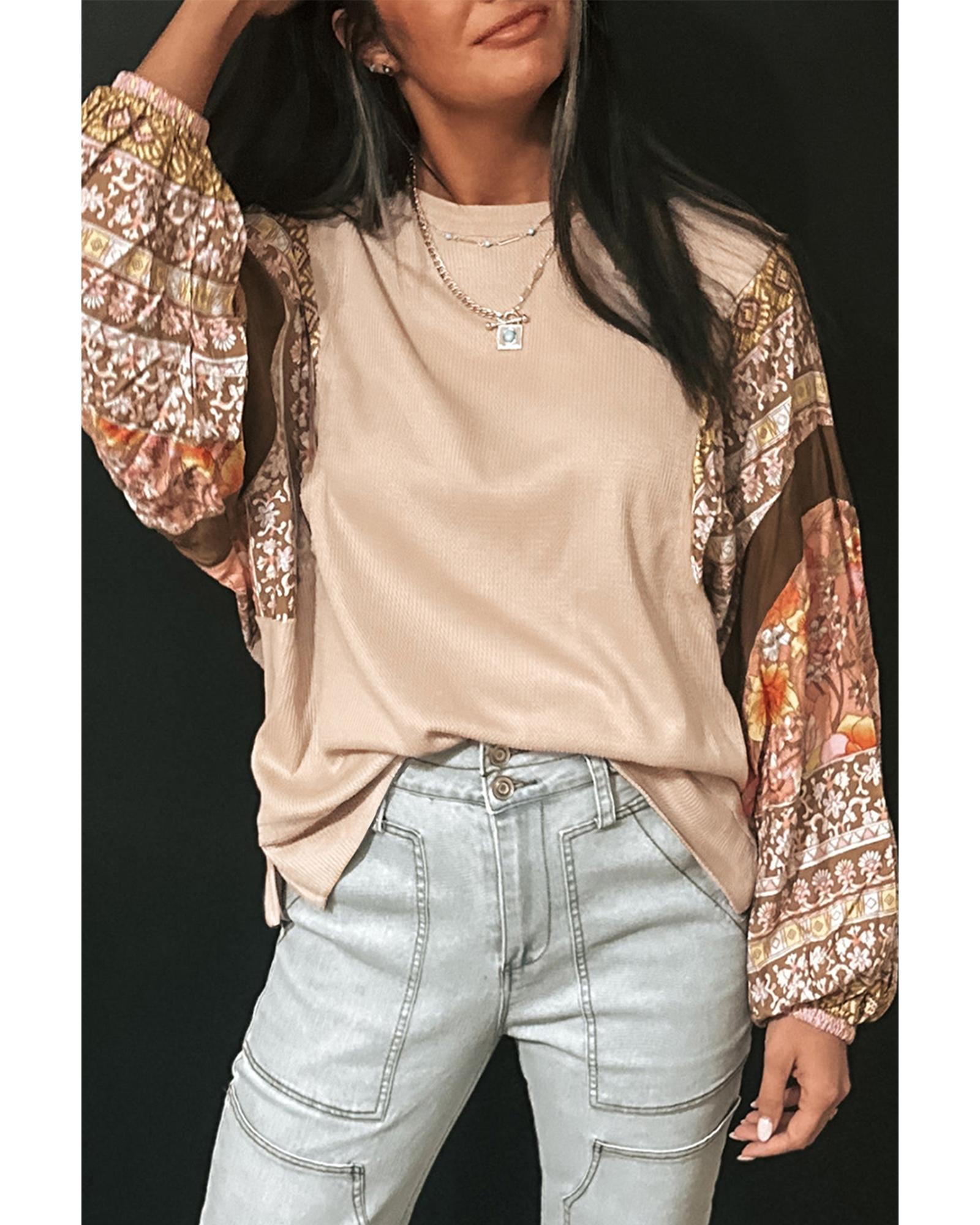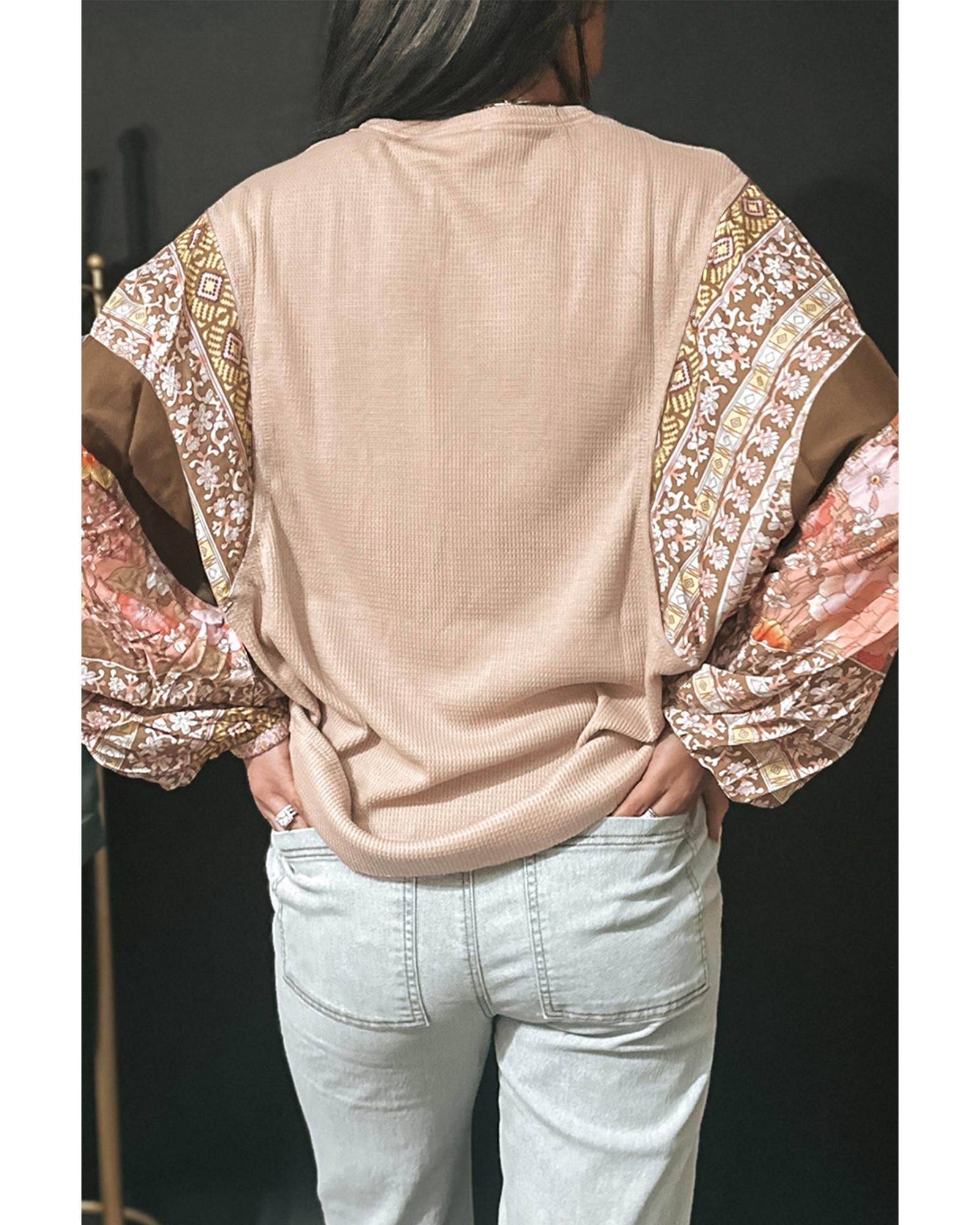 Parchment Contrast Floral Patchwork Puff Sleeve Waffle Knit Top – S