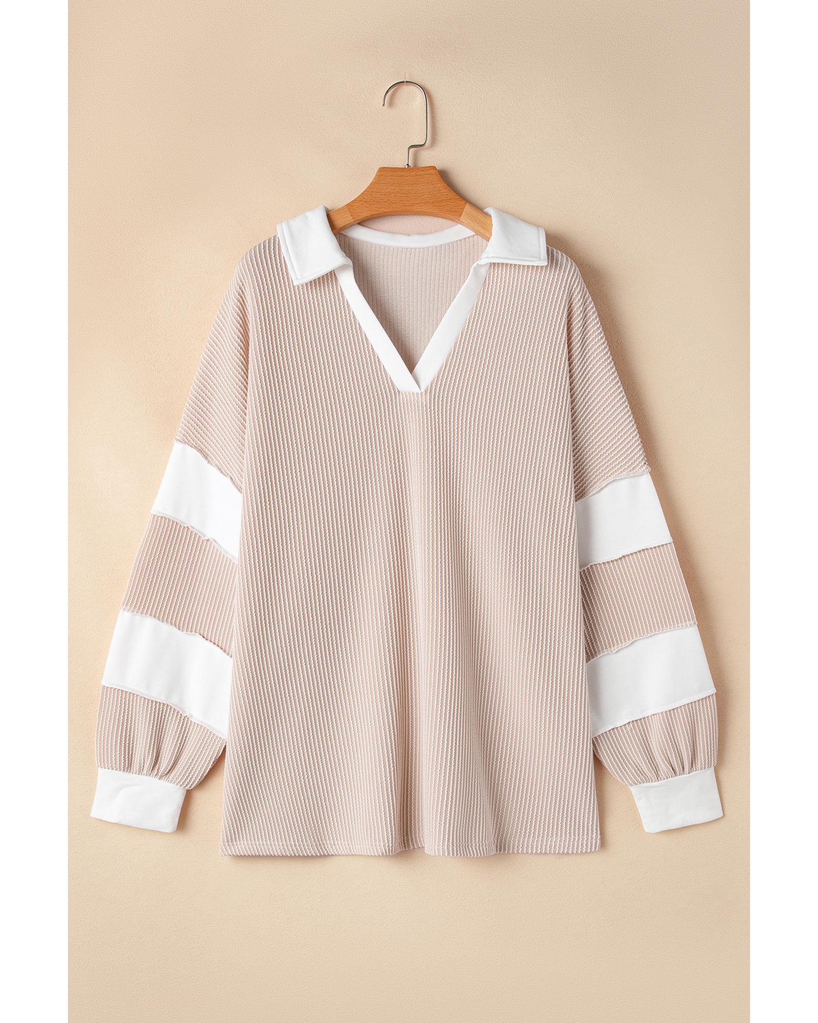 Parchment Corded Colorblock Long Sleeve Slit V Neck Plus Top – 2X