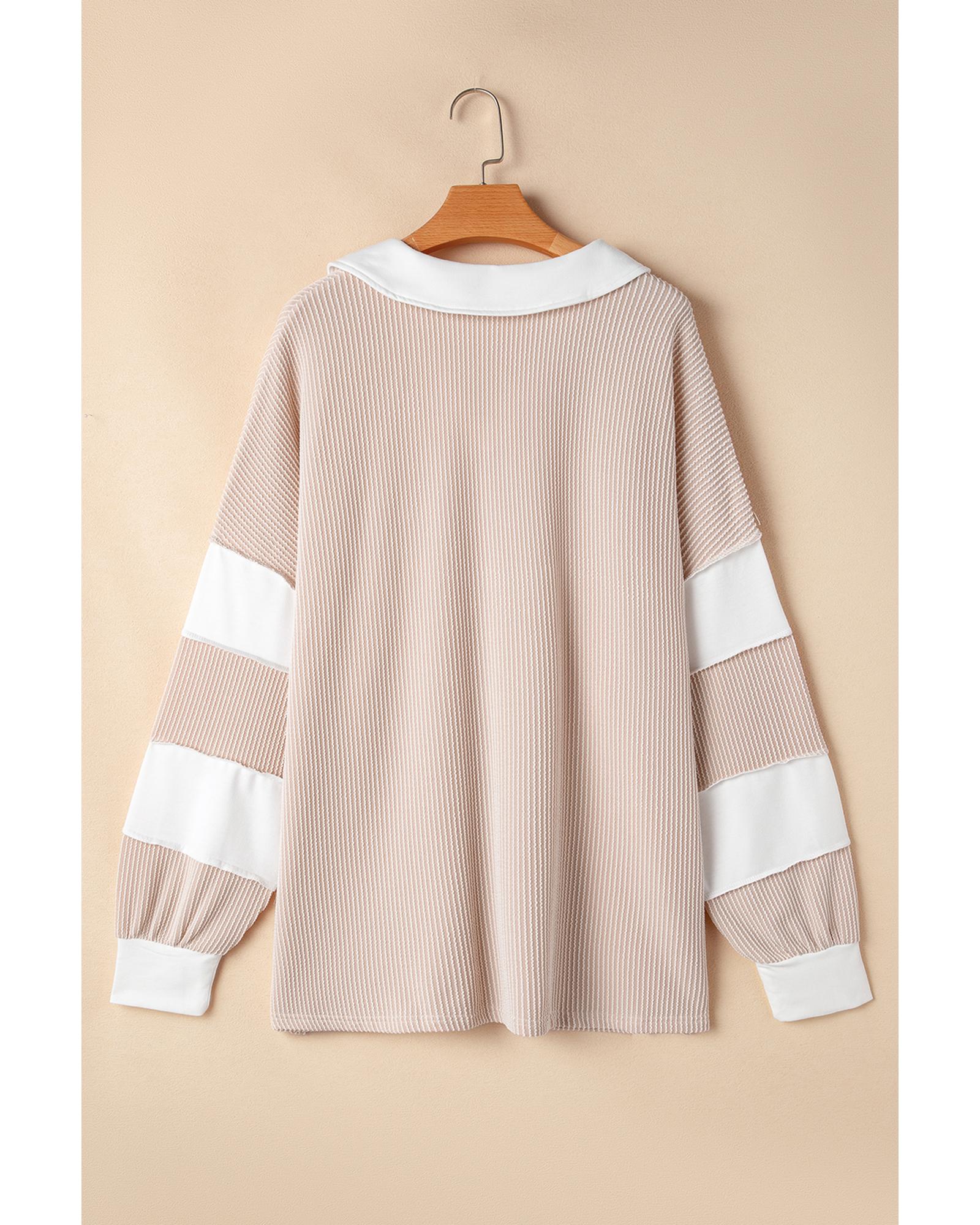 Parchment Corded Colorblock Long Sleeve Slit V Neck Plus Top – 3X