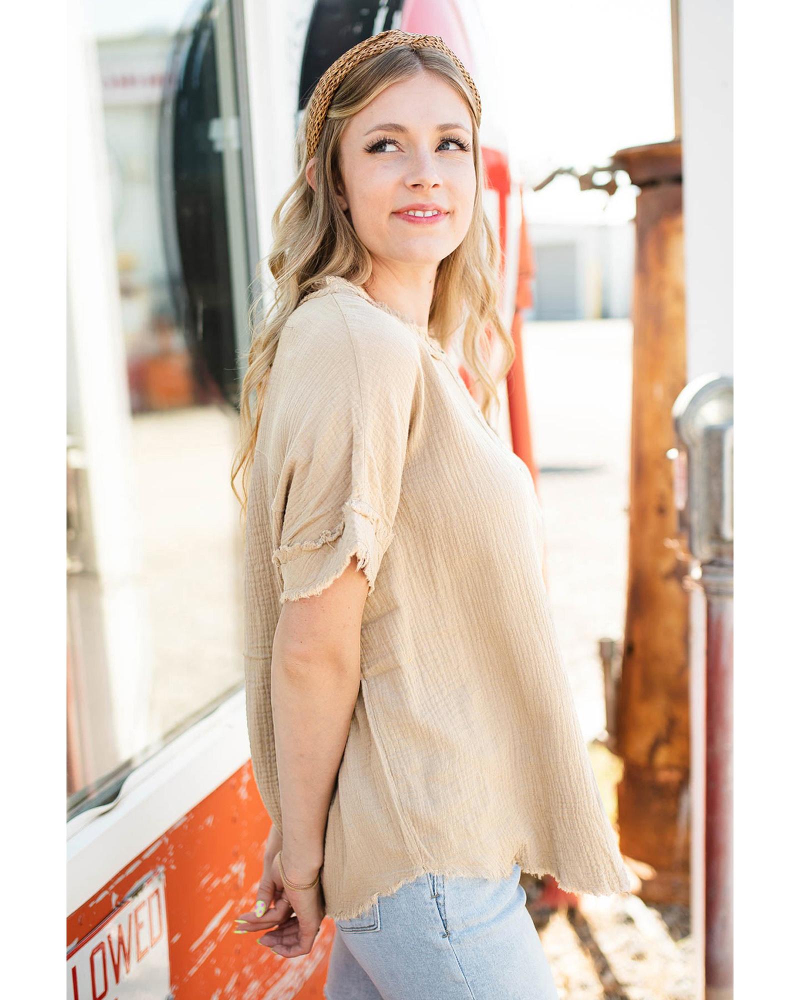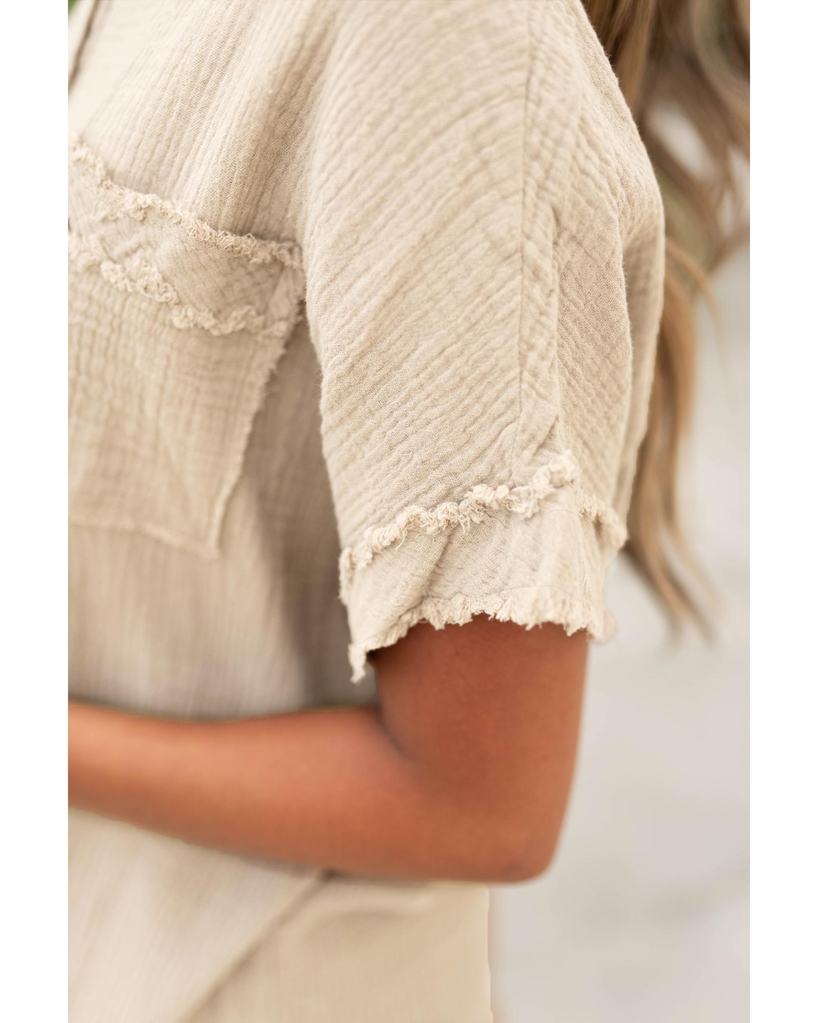 Parchment Crinkle Textured Frayed Trim Half Button Short Sleeve Top – S