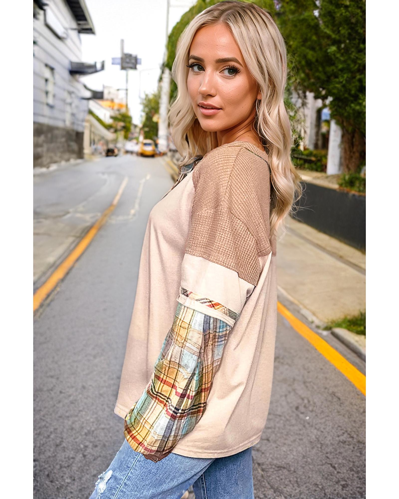 Parchment Plus Size Plaid Patchwork Layered Henley Top – 1X