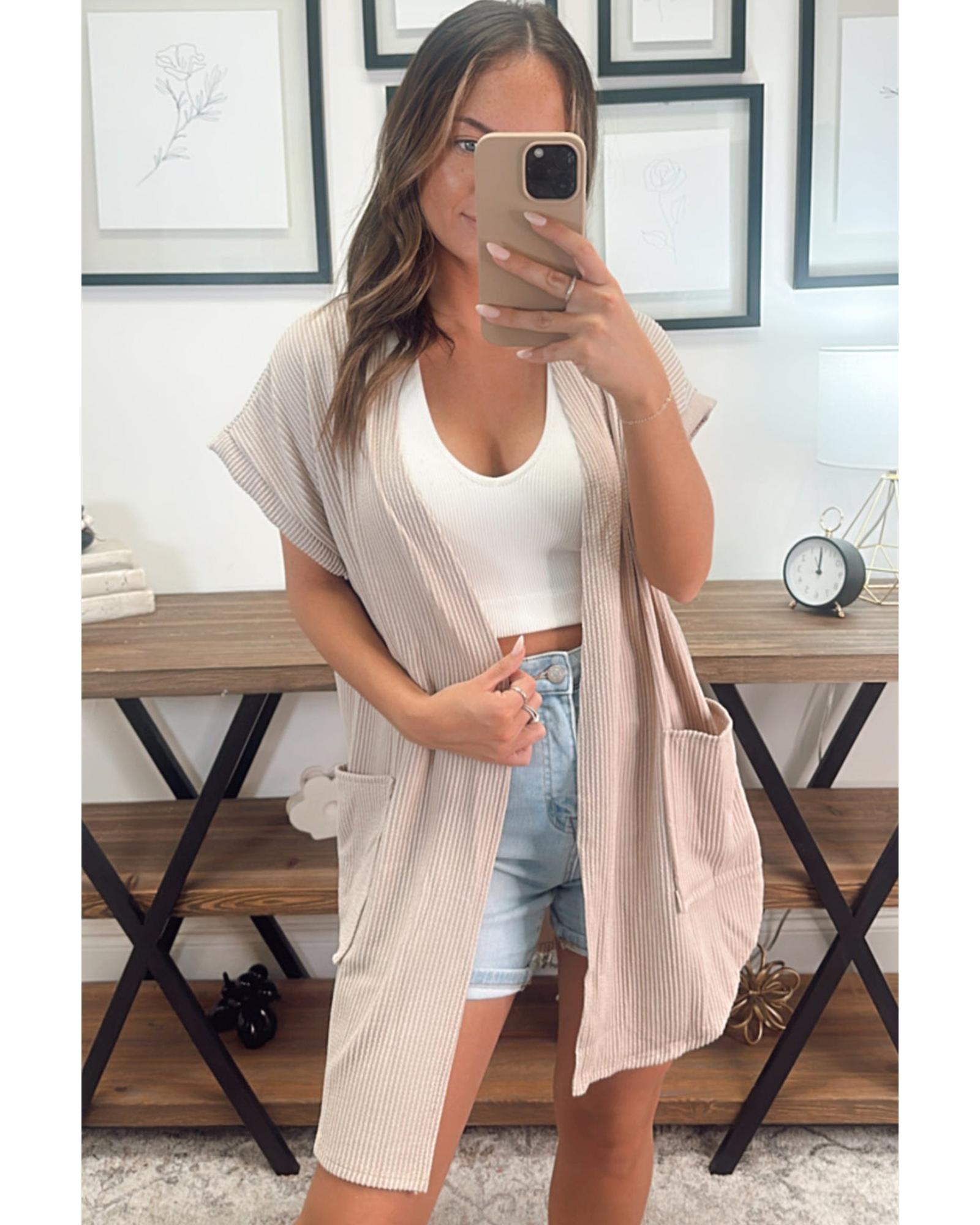 Parchment Ribbed Pocketed Short Sleeve Open Front Top – M
