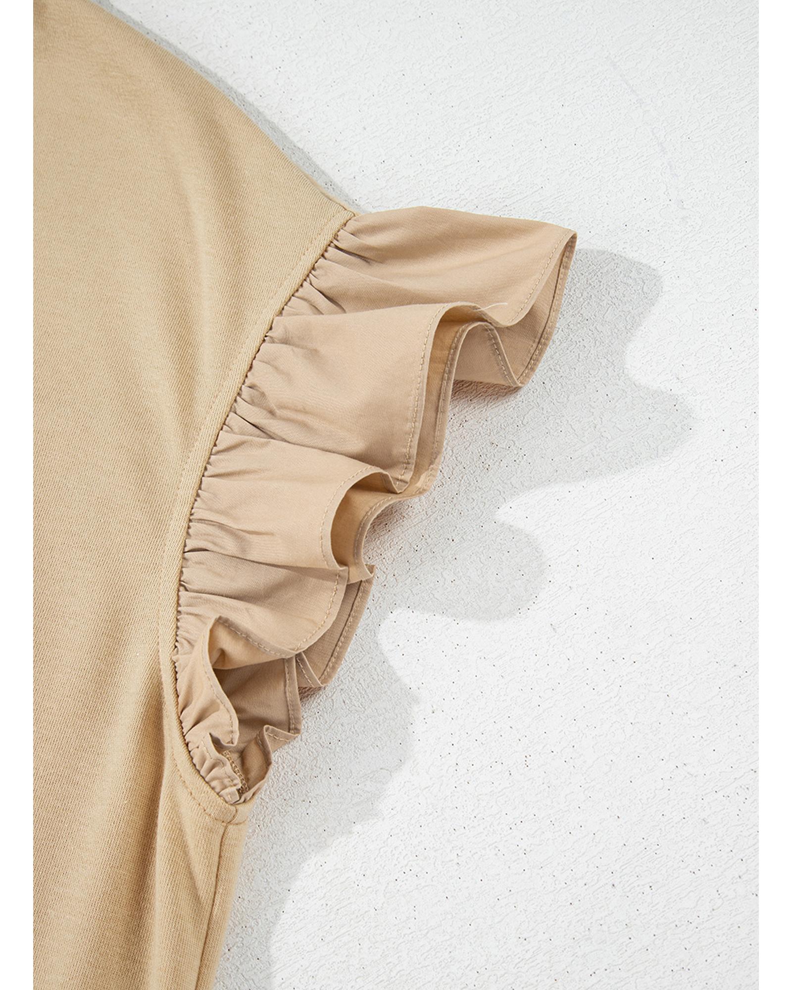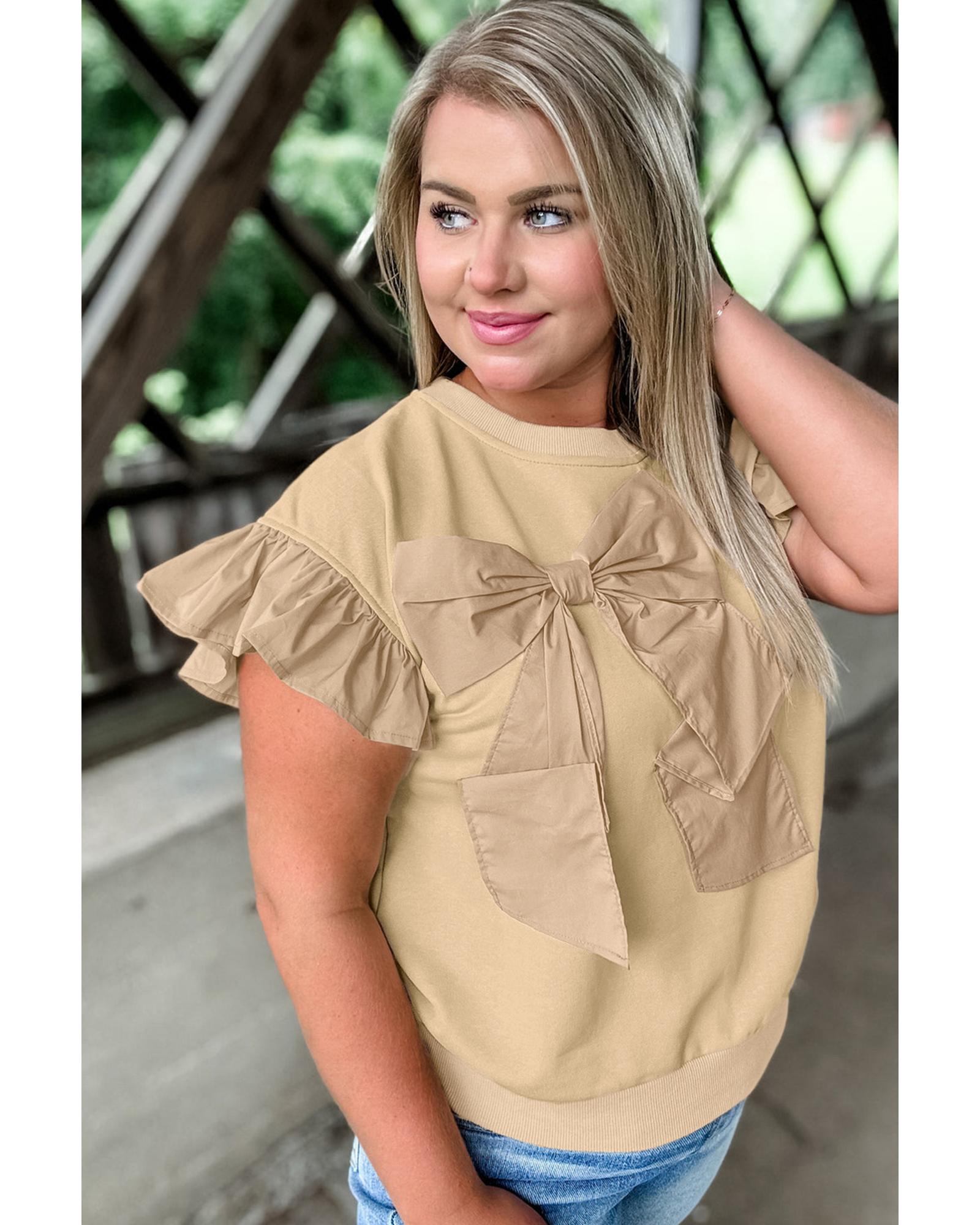 Parchment Ruffled Short Sleeve Bowknot Applique Crew Neck Plus Size Top – 1X