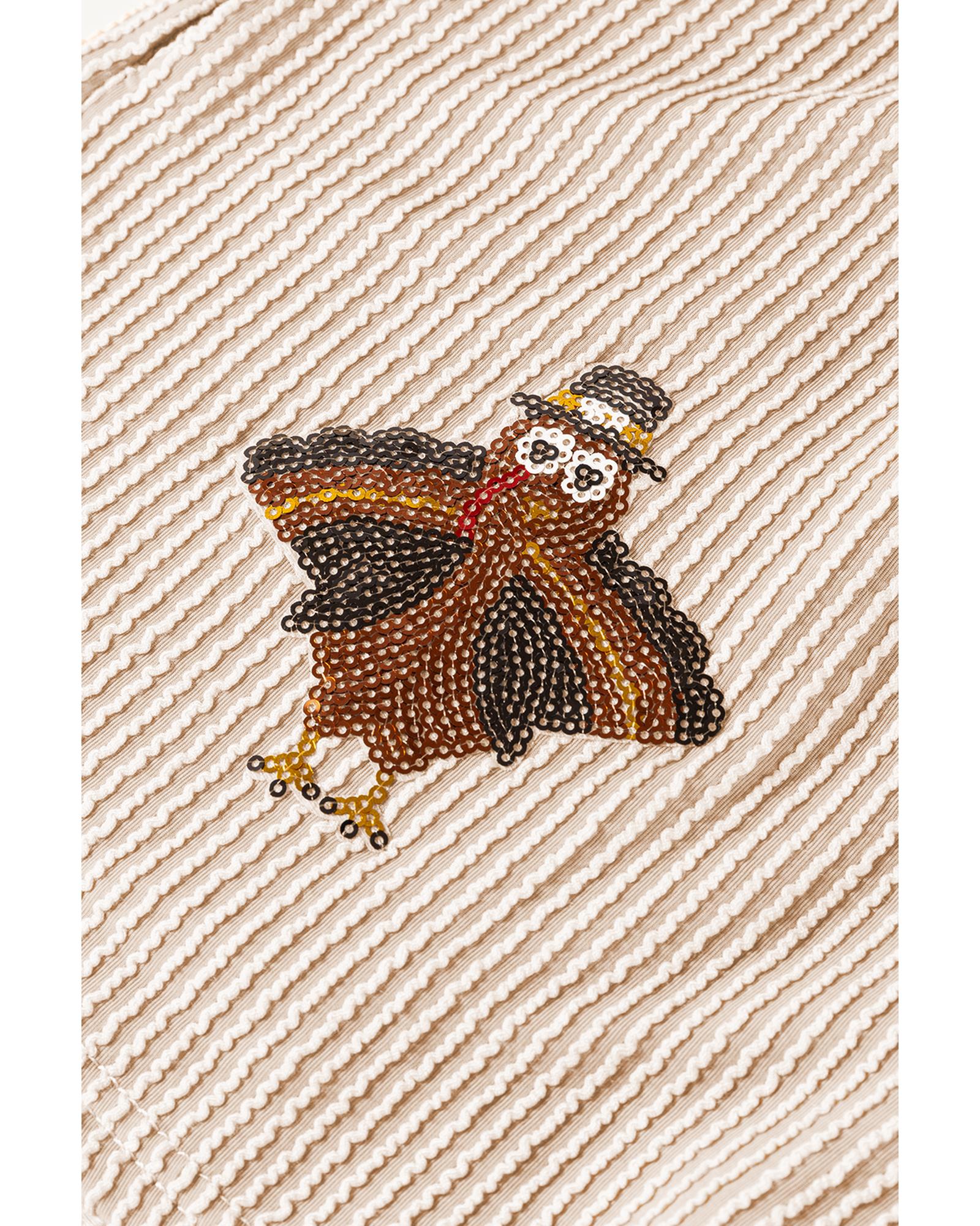 - Shiny sequined turkey patterns add a touch of fun to your Thanksgiving attire