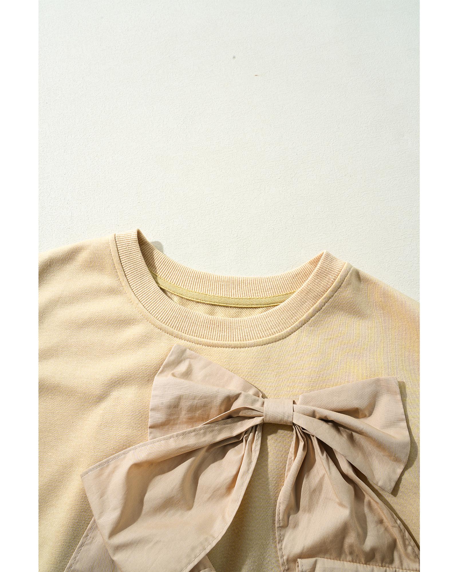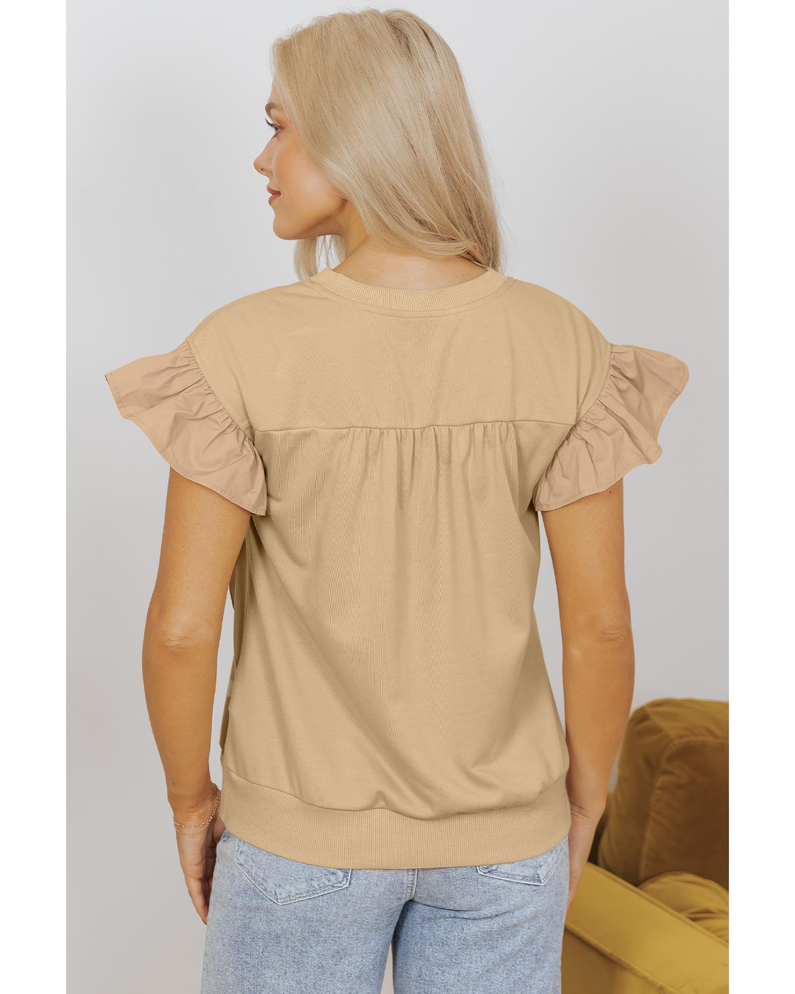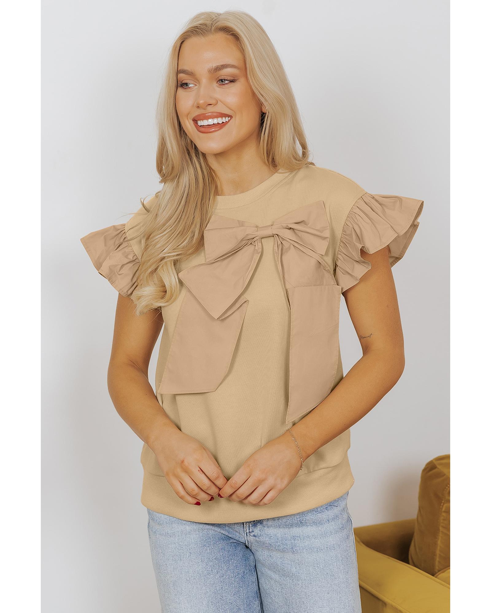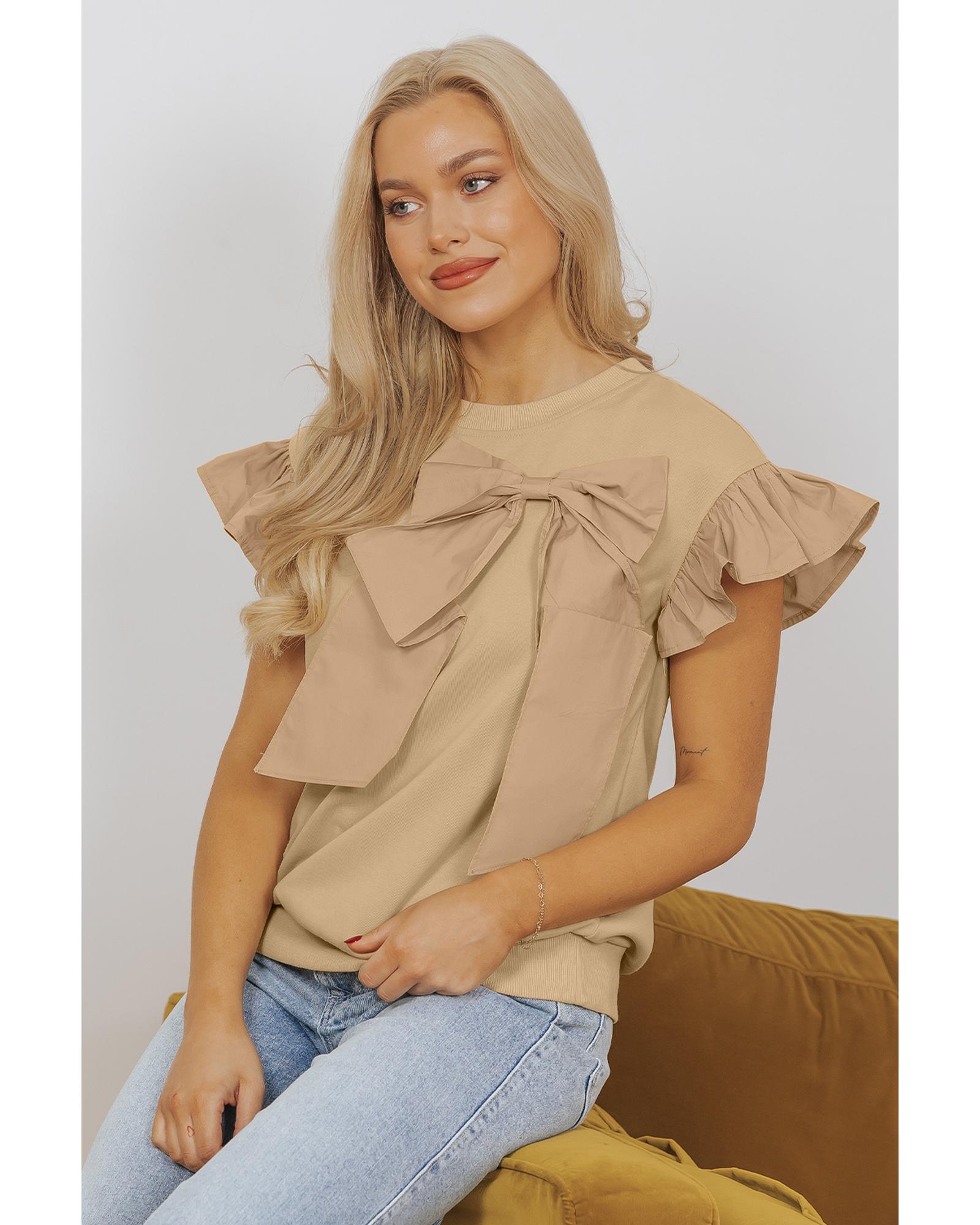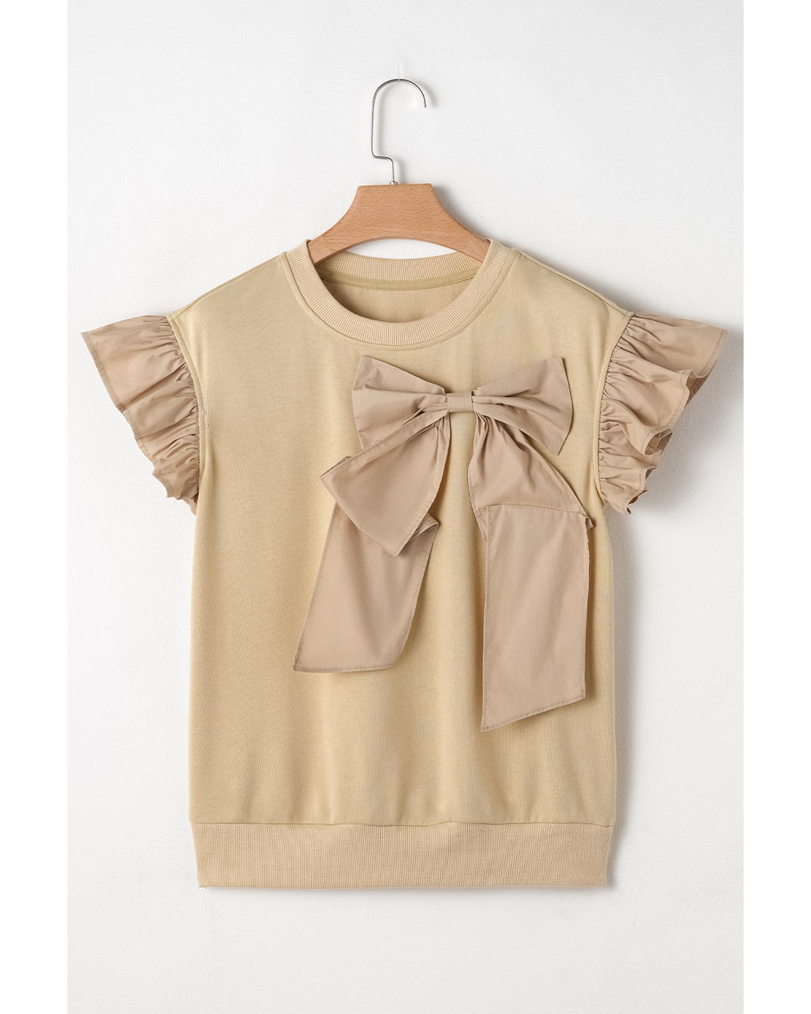 Parchment Two Tones Ribbon Bow Ruffle Sleeve Top – XL
