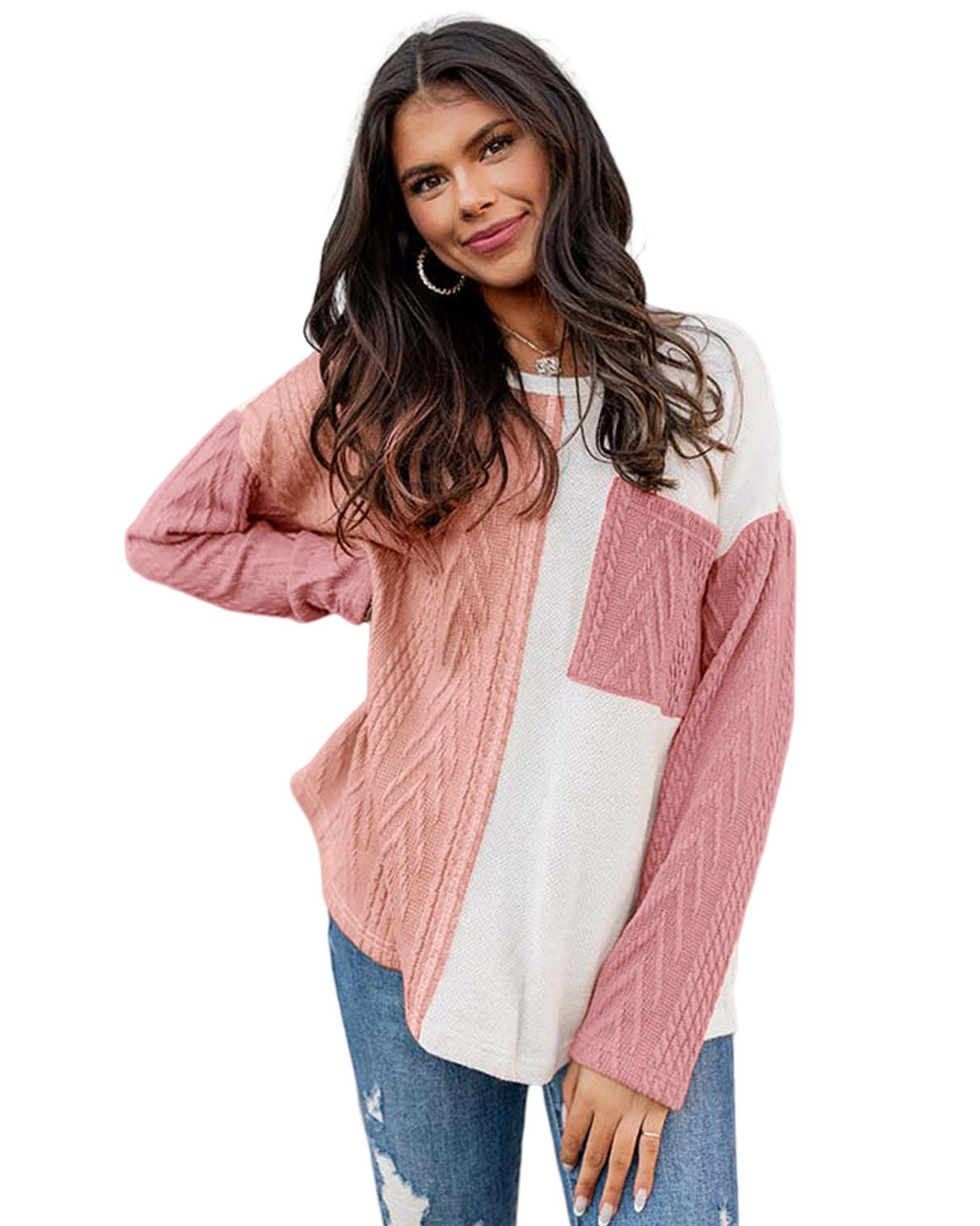 - Peach Blossom Long Sleeve Colorblock Chest Pocket Textured Knit Top