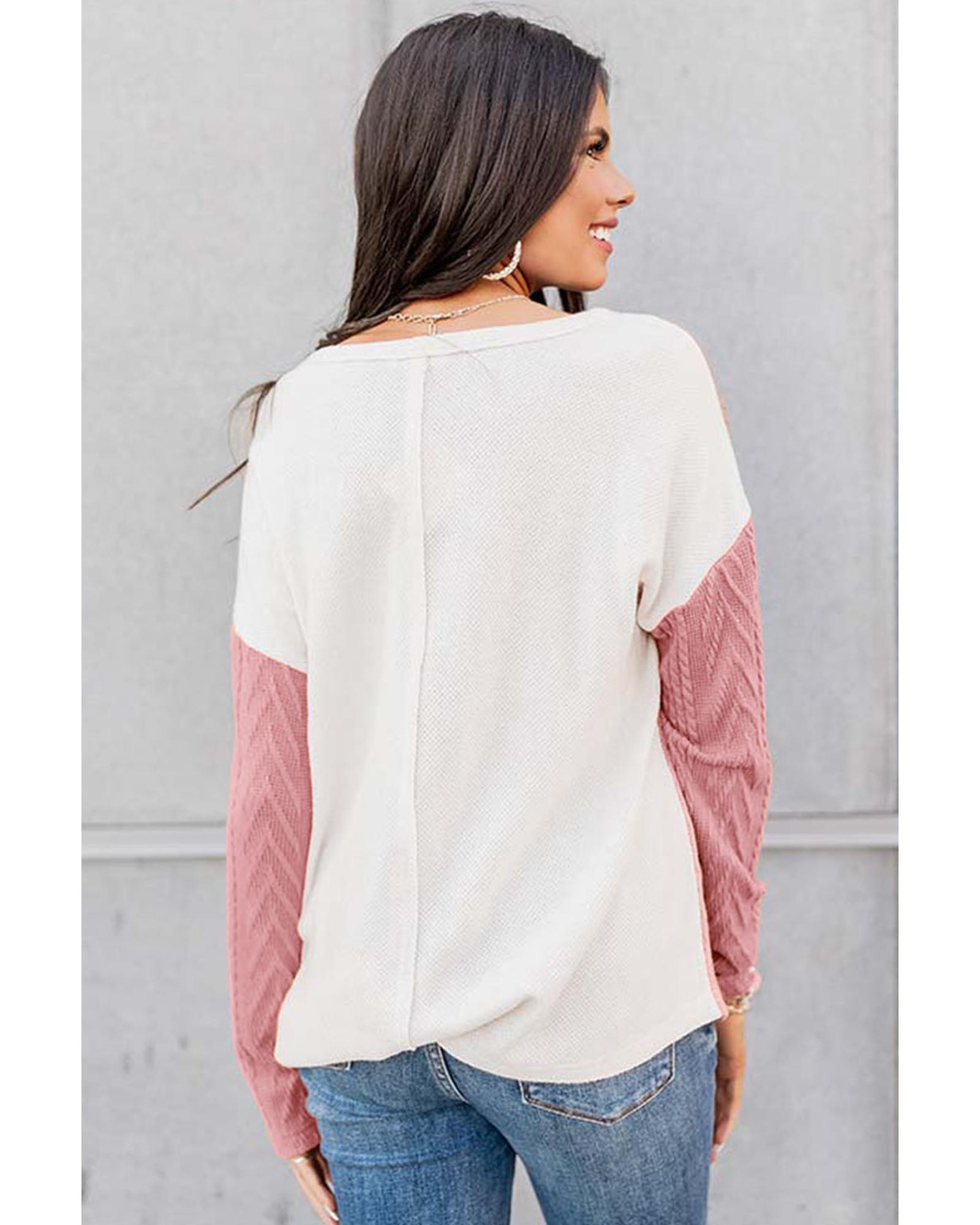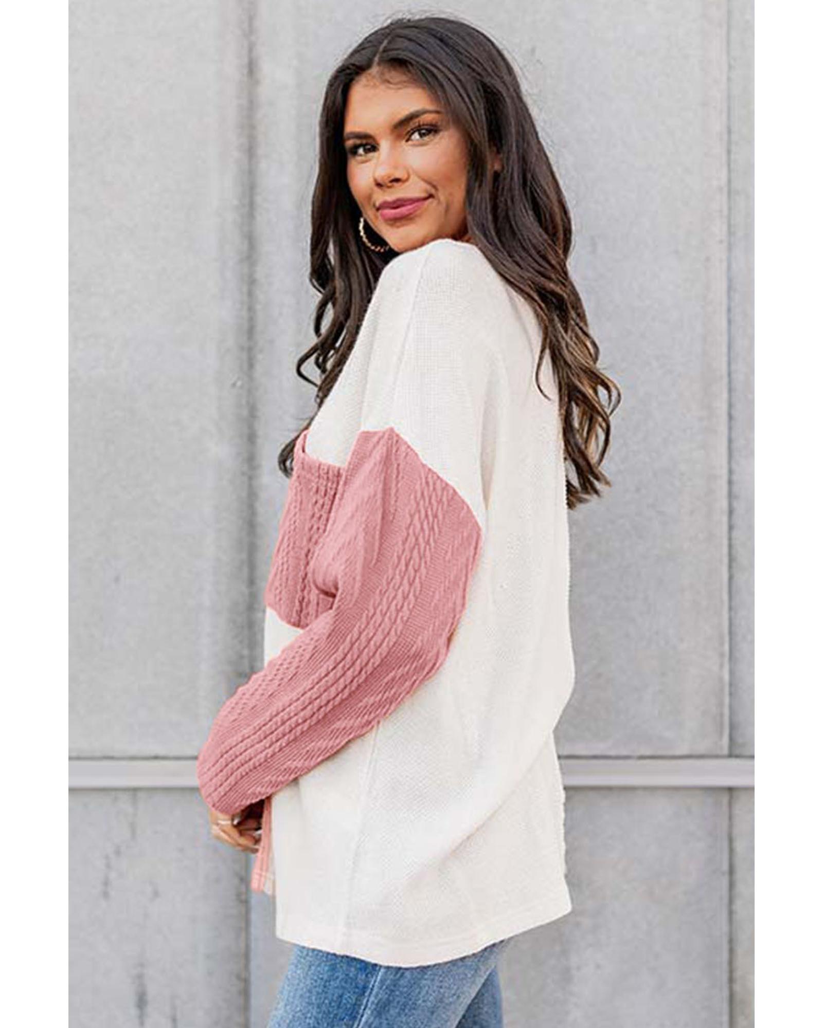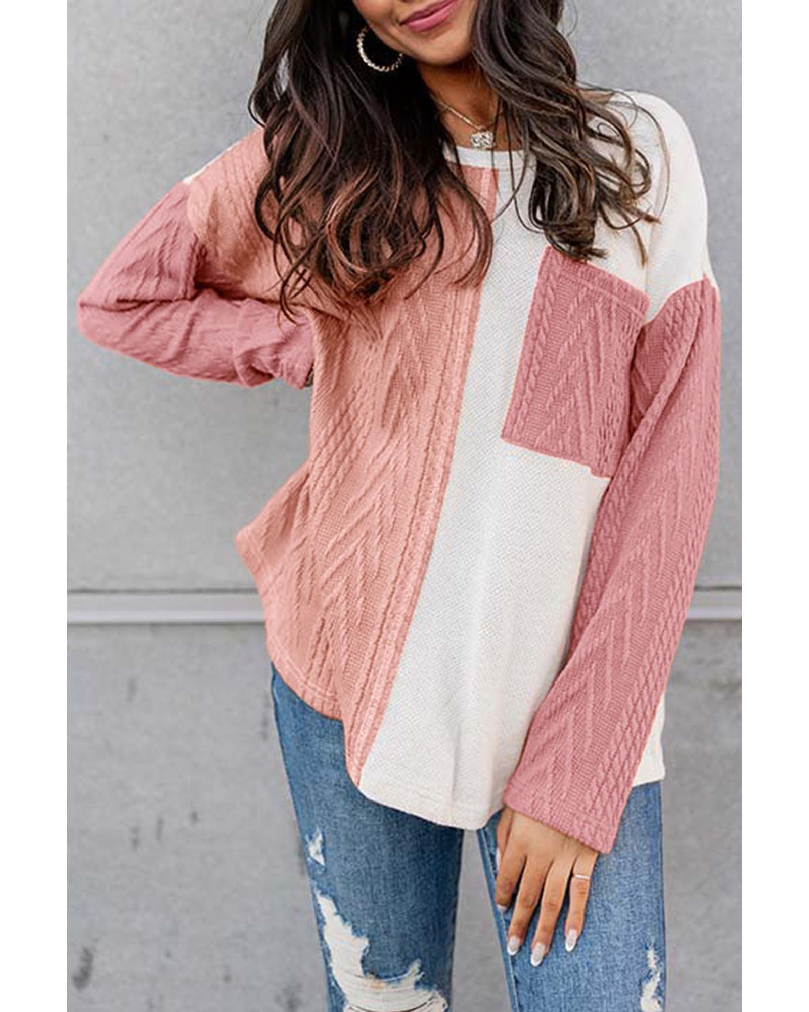 - Peach Blossom Long Sleeve Colorblock Chest Pocket Textured Knit Top