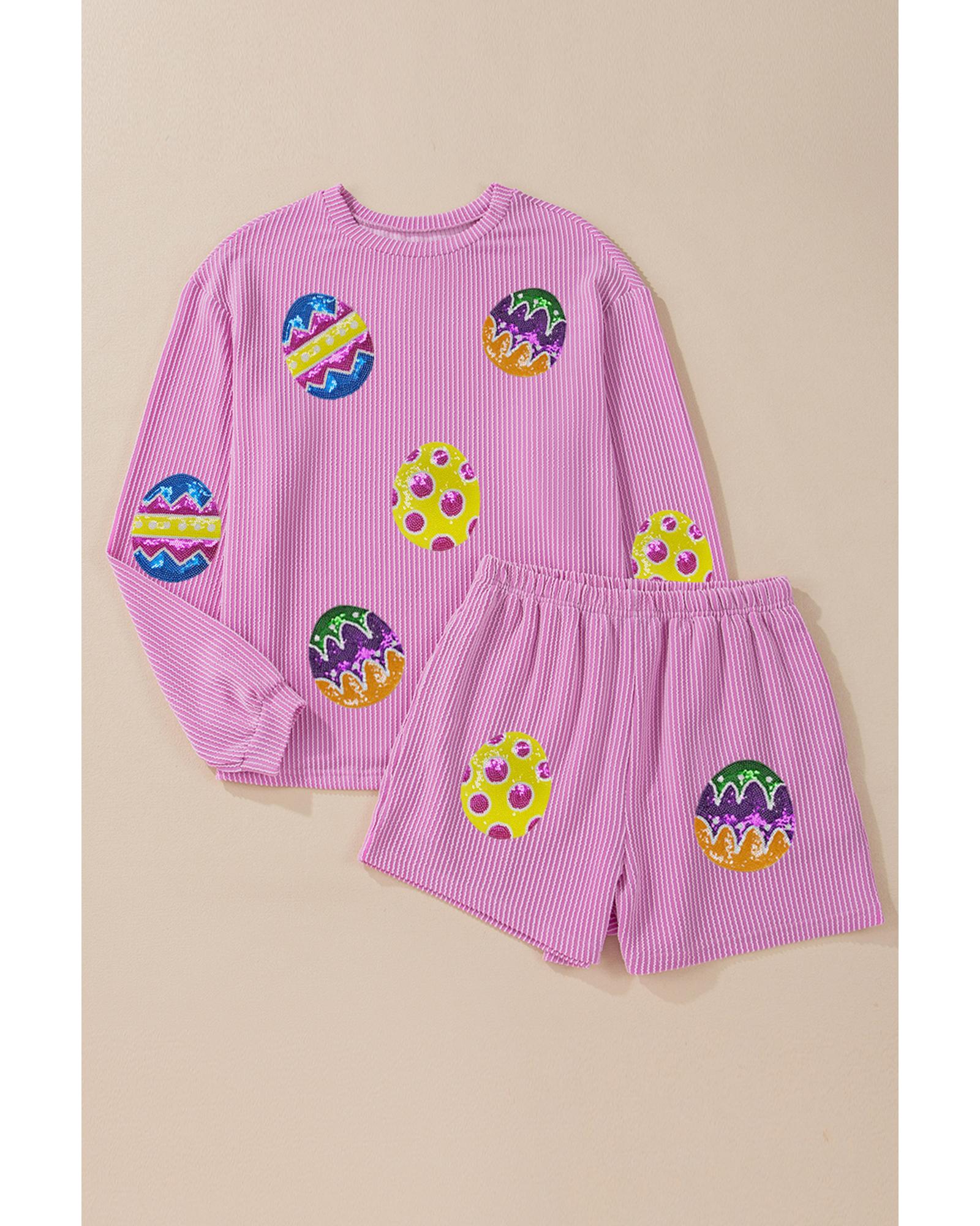 Phalaenopsis Easter Egg Patched Graphic Corded Long Sleeve Top Shorts Set – L