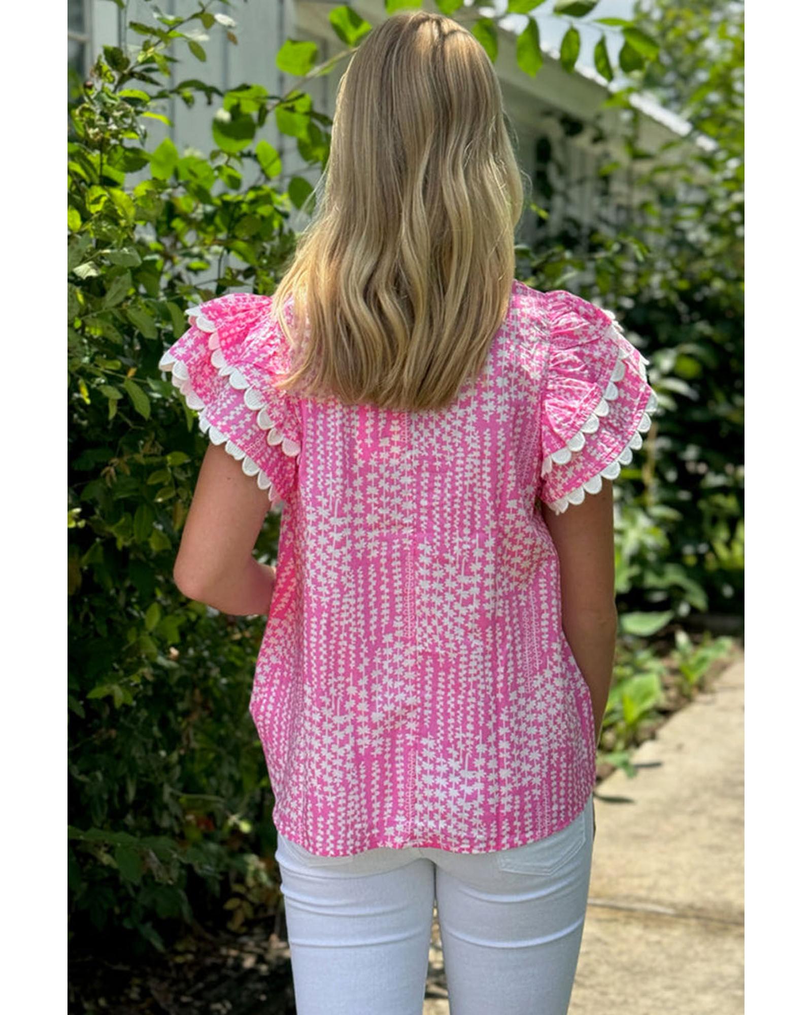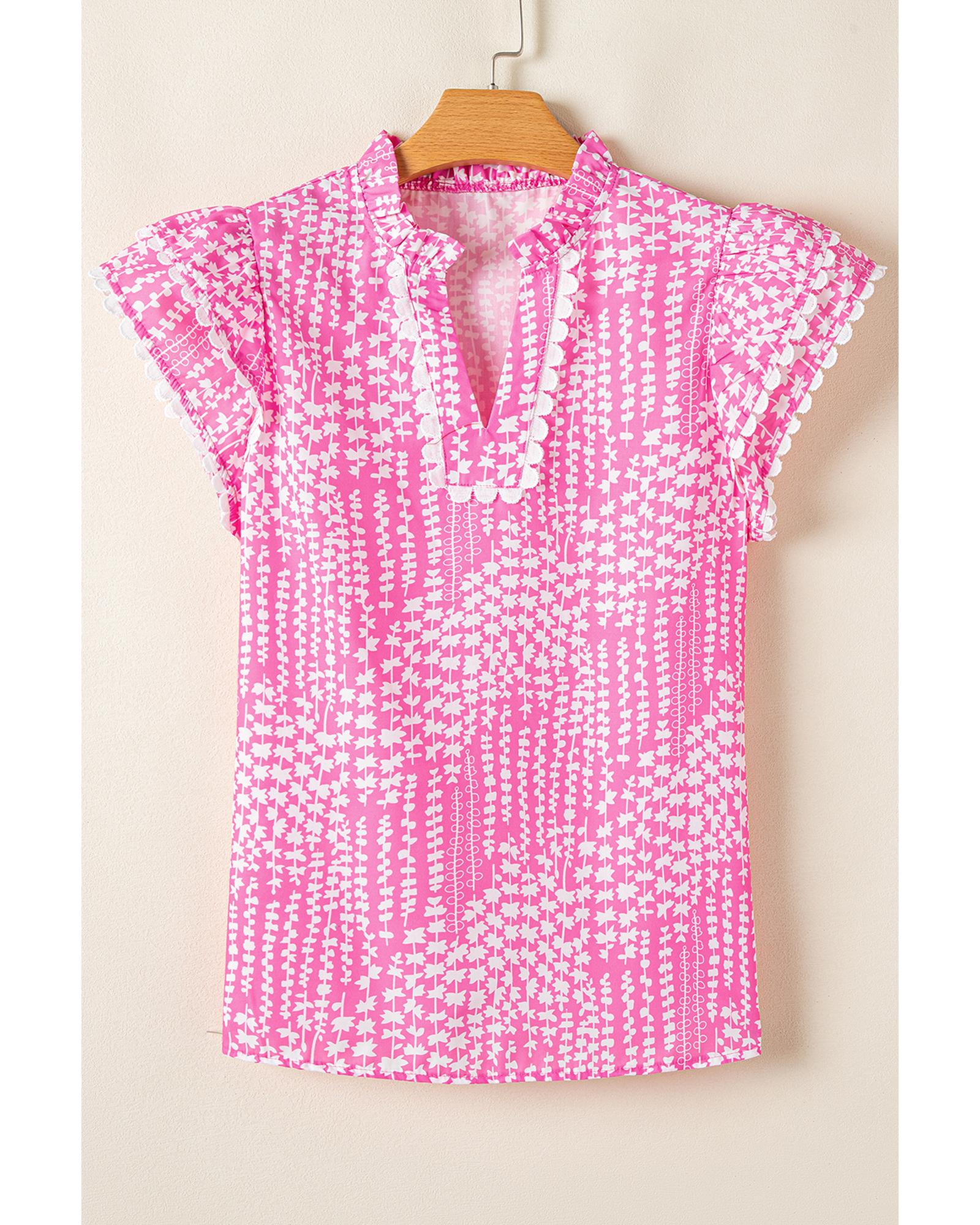 Pink Abstract Print Ric Rac Trim Flutter Sleeve Notch V Neck Blouse – M