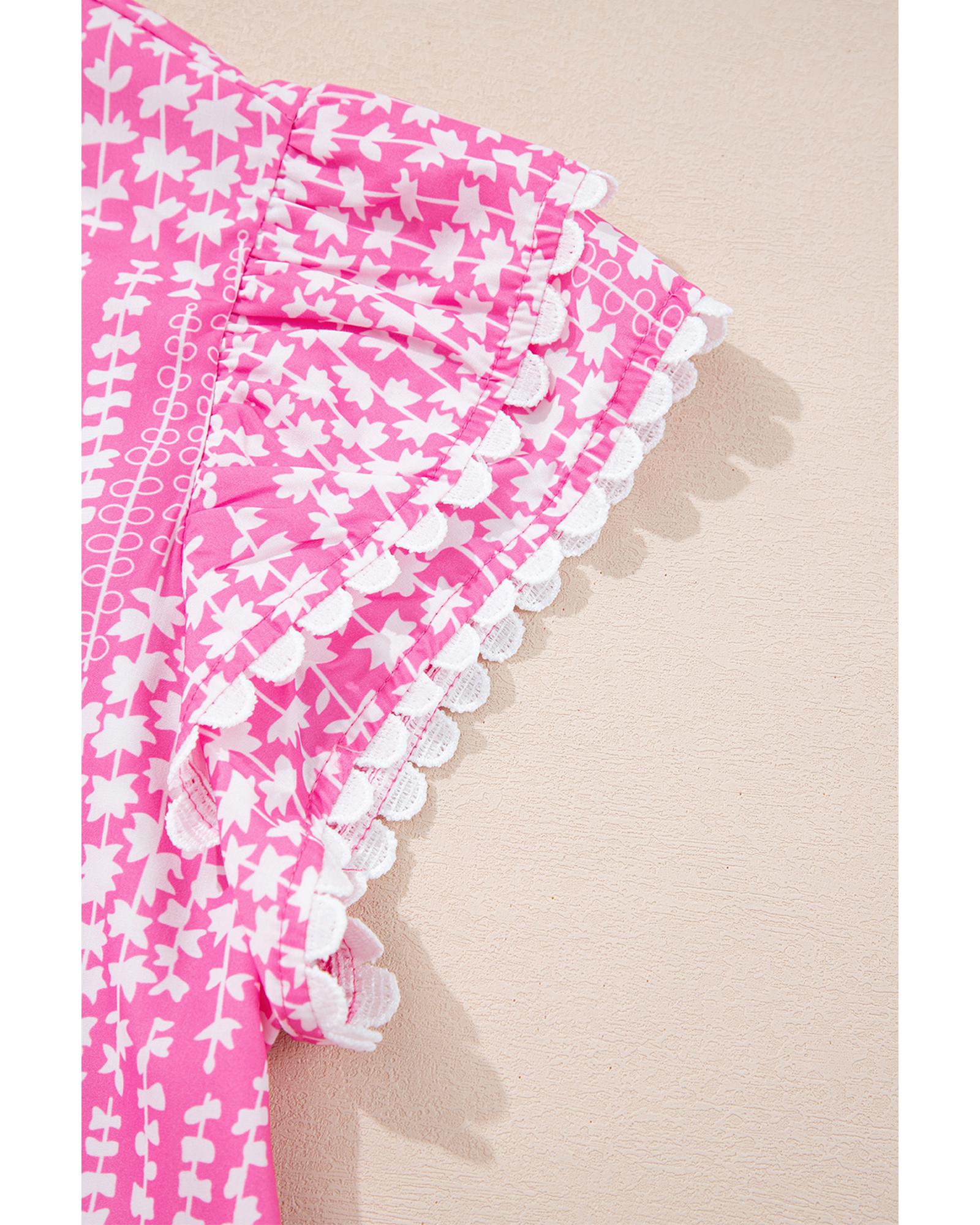 Pink Floral Print Contrast Ruffle Trim Short Sleeve Blouse - S