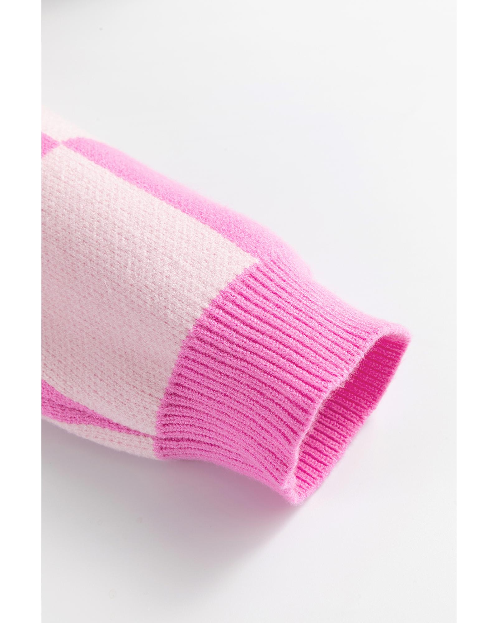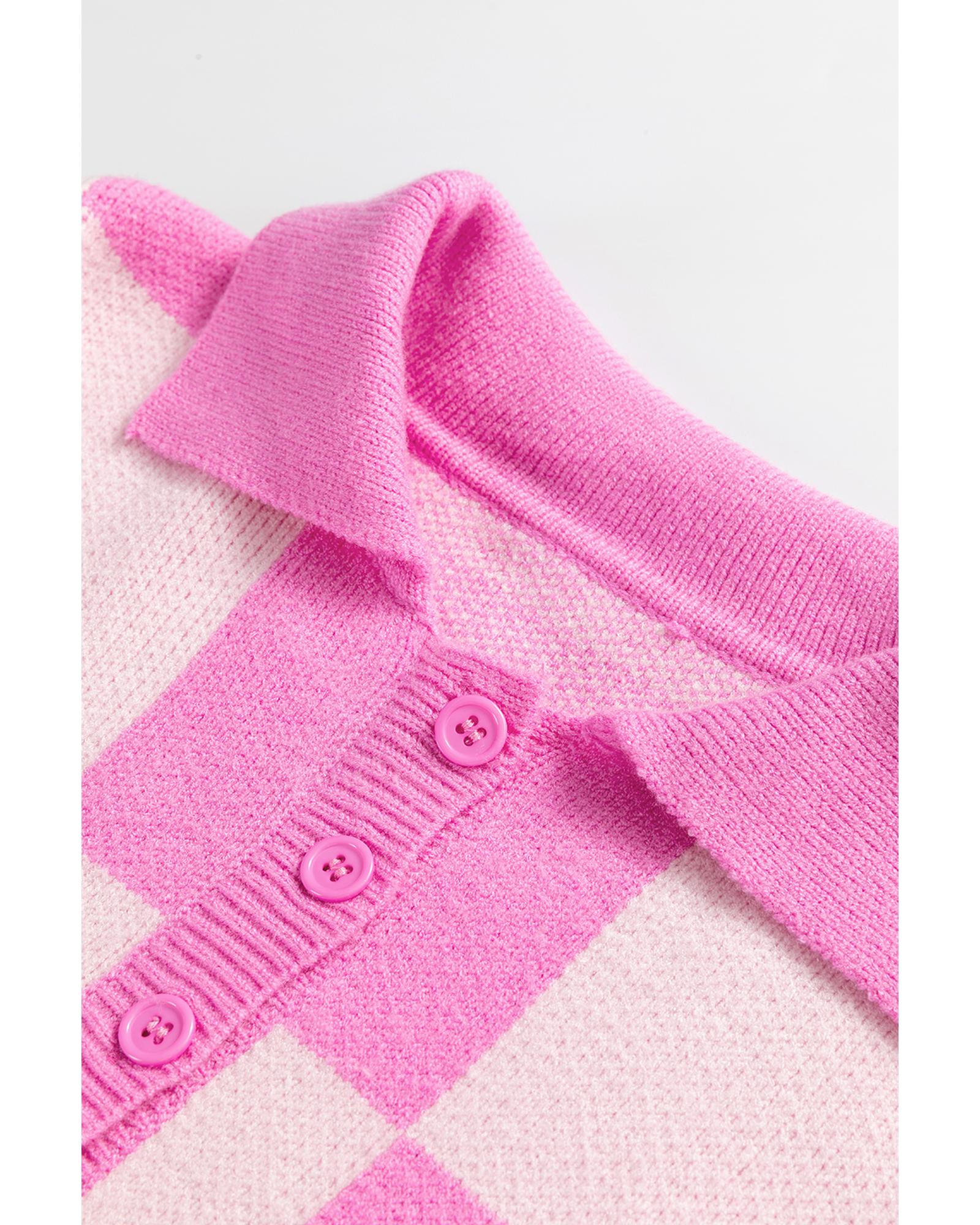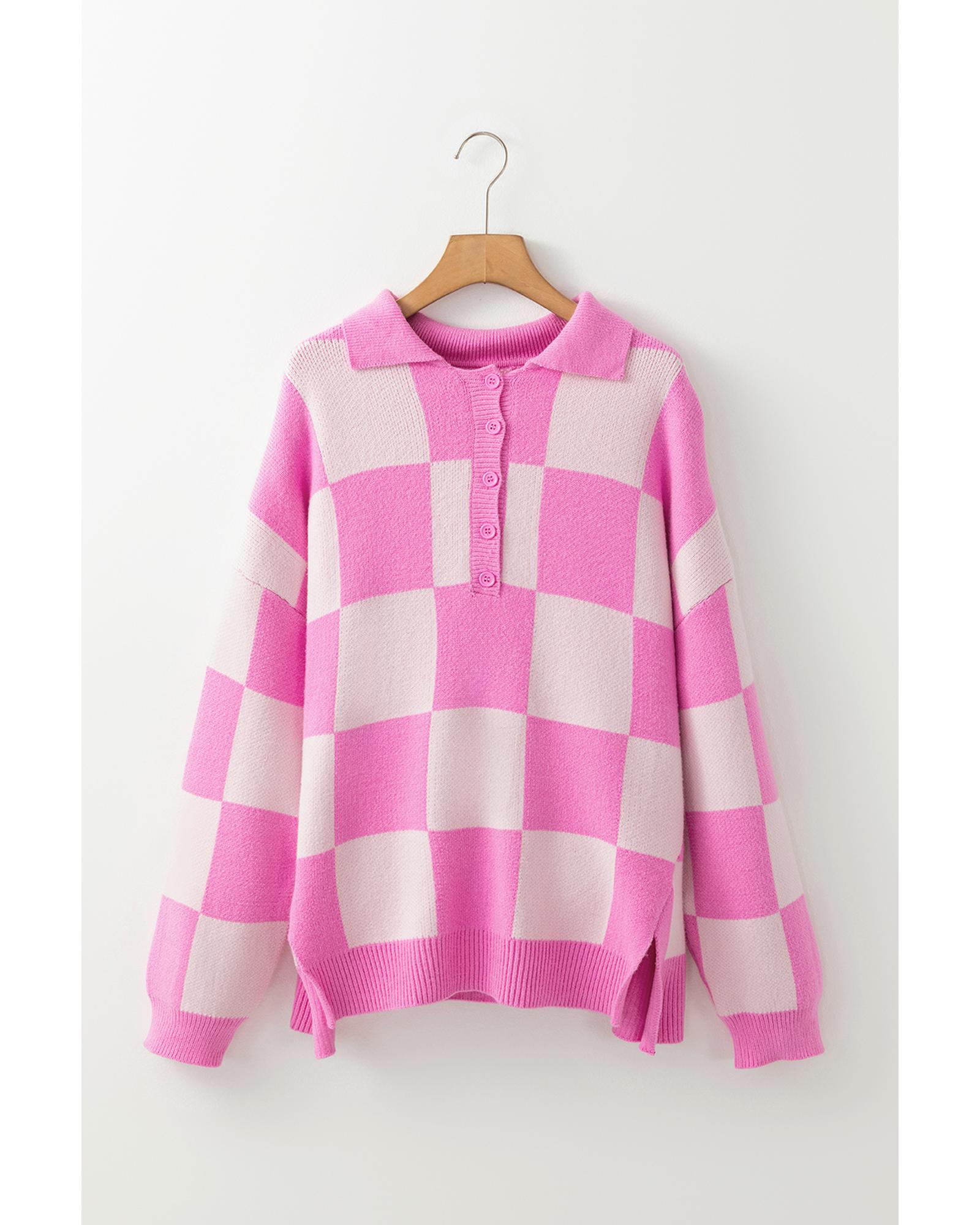 Pink Checkerboard Half Button Collared Drop Shoulder Sweater – S