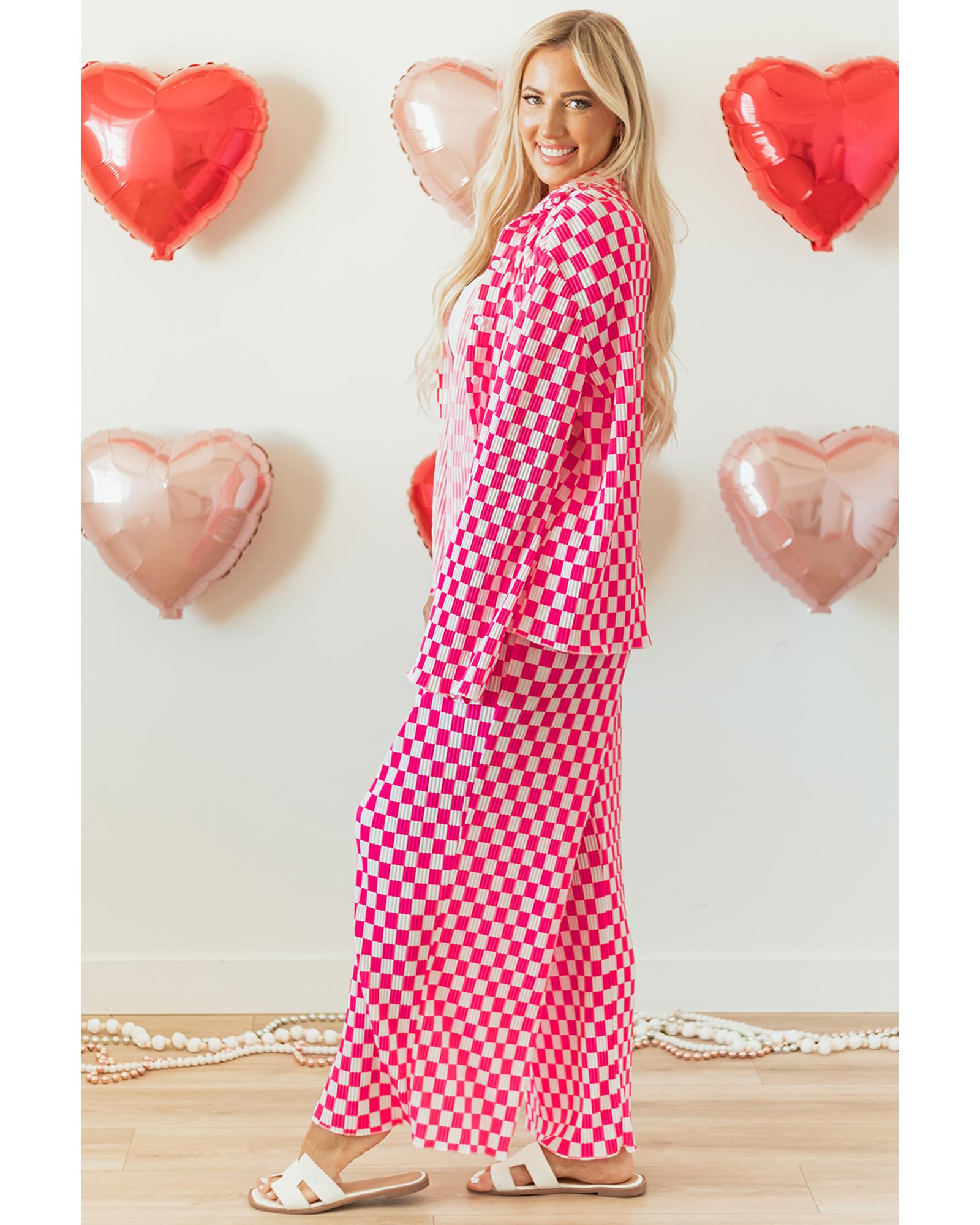 Pink Checkered Buttoned Shirt and High Waist Pants Pajama Set – L