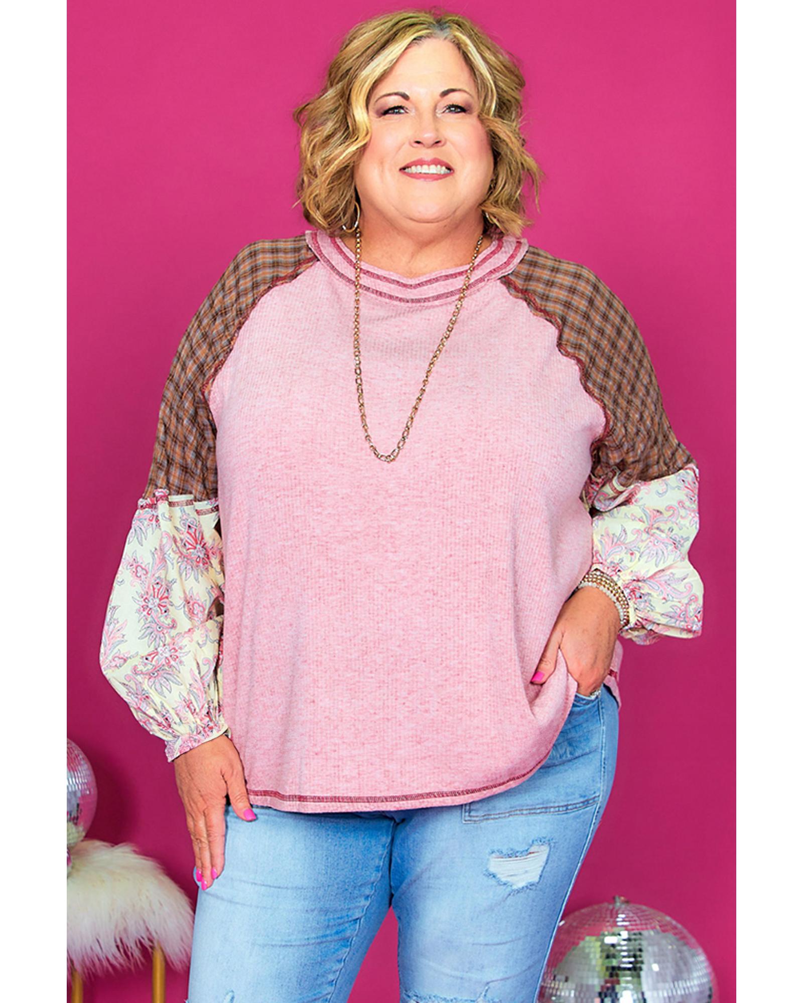 Pink Checkered Paisley Patchwork Raglan Sleeve Seamed Plus Size Top - 2X Original price was: $68.99.Current price is: $36.99.
