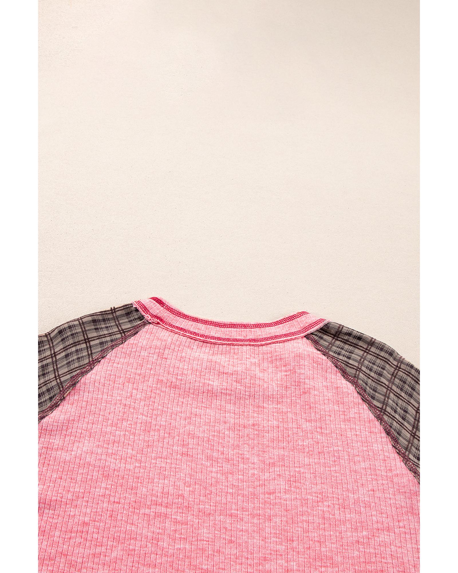 Pink Checkered Paisley Patchwork Raglan Sleeve Seamed Plus Size Top – 3X