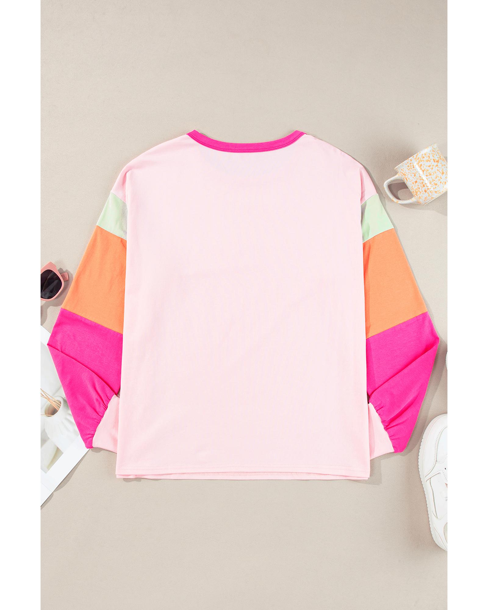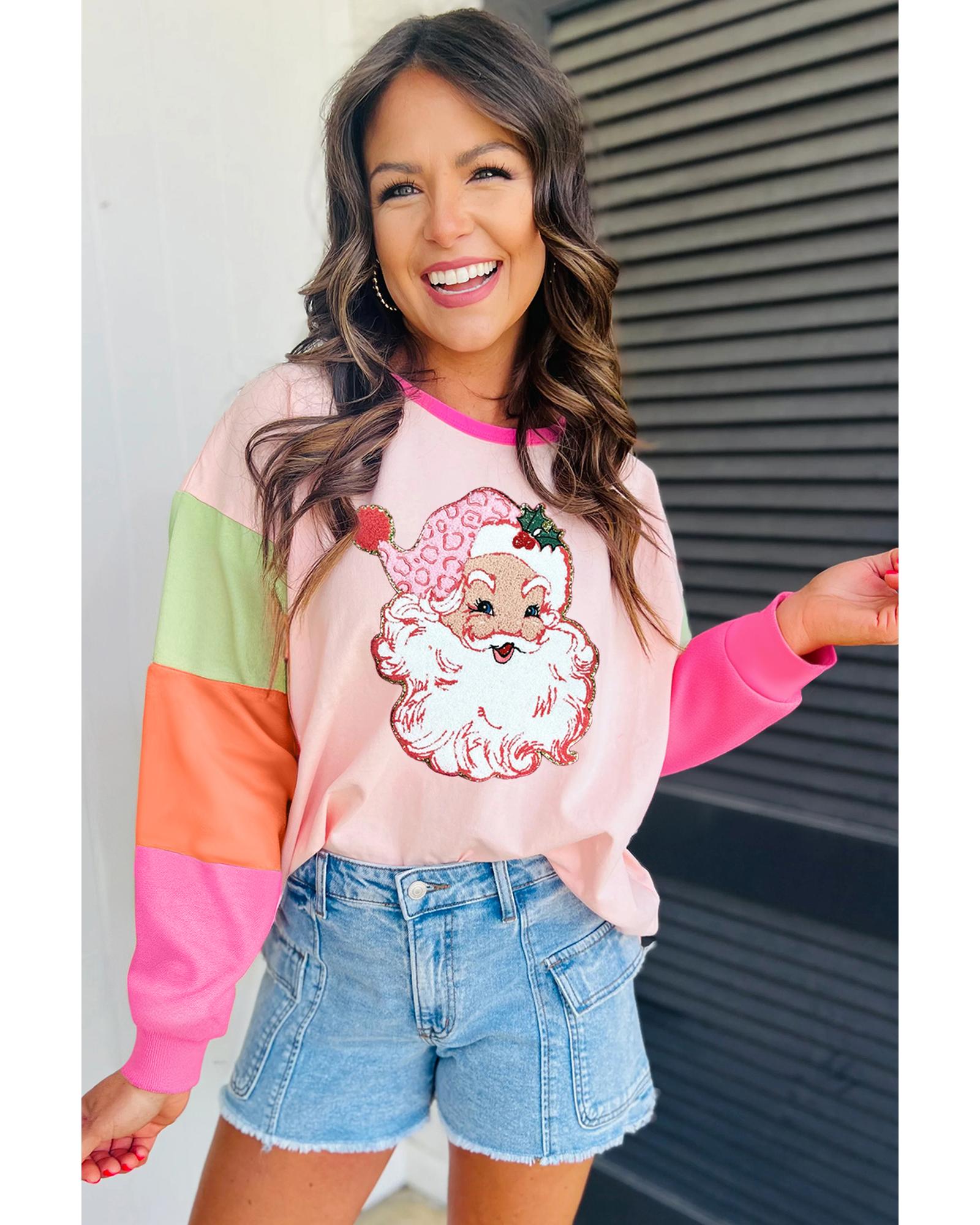 Pink Christmas Santa Claus Graphic Colorblock Patchwork Top – M