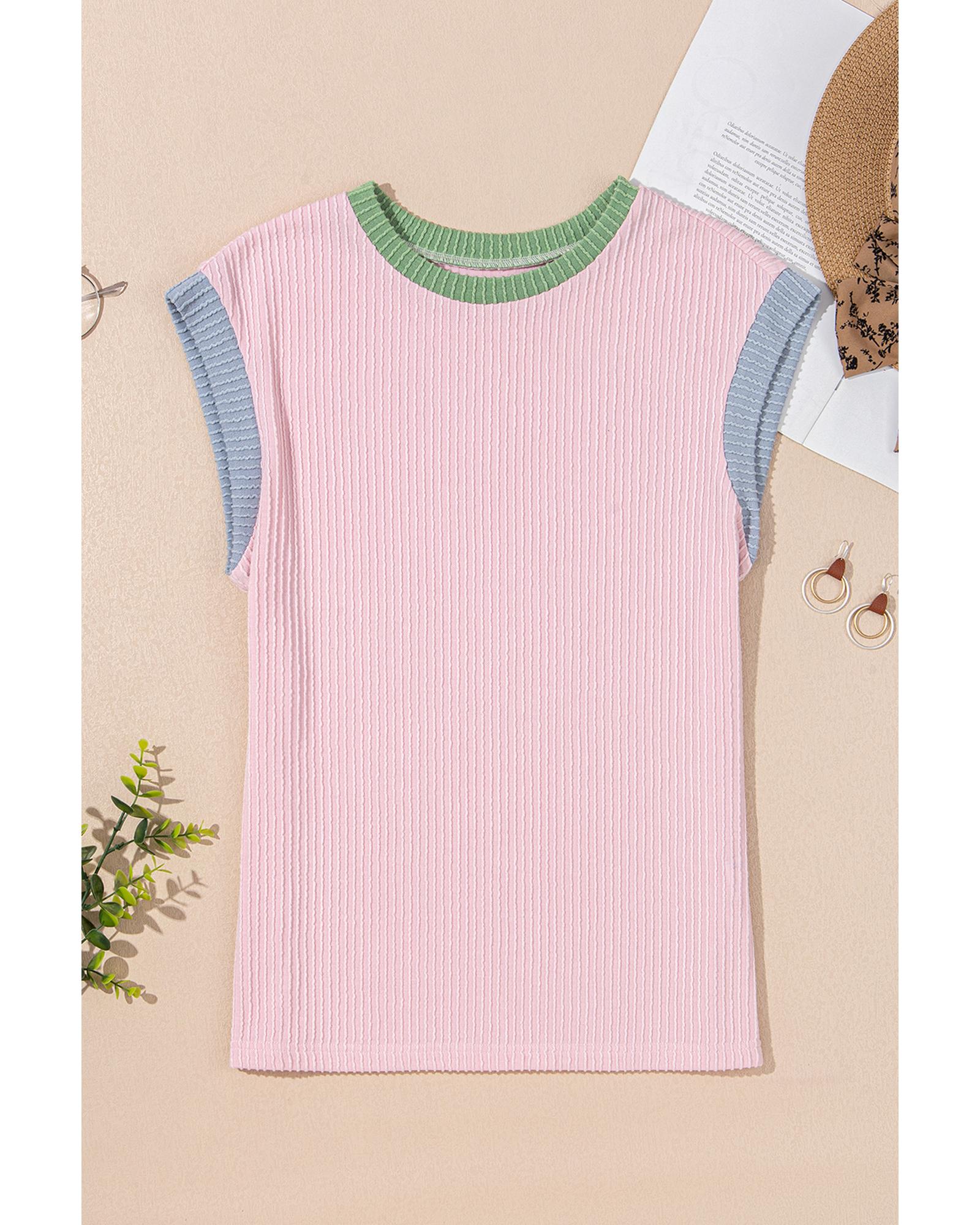- Pink Color Block Corded Knit Crew Neck Tee