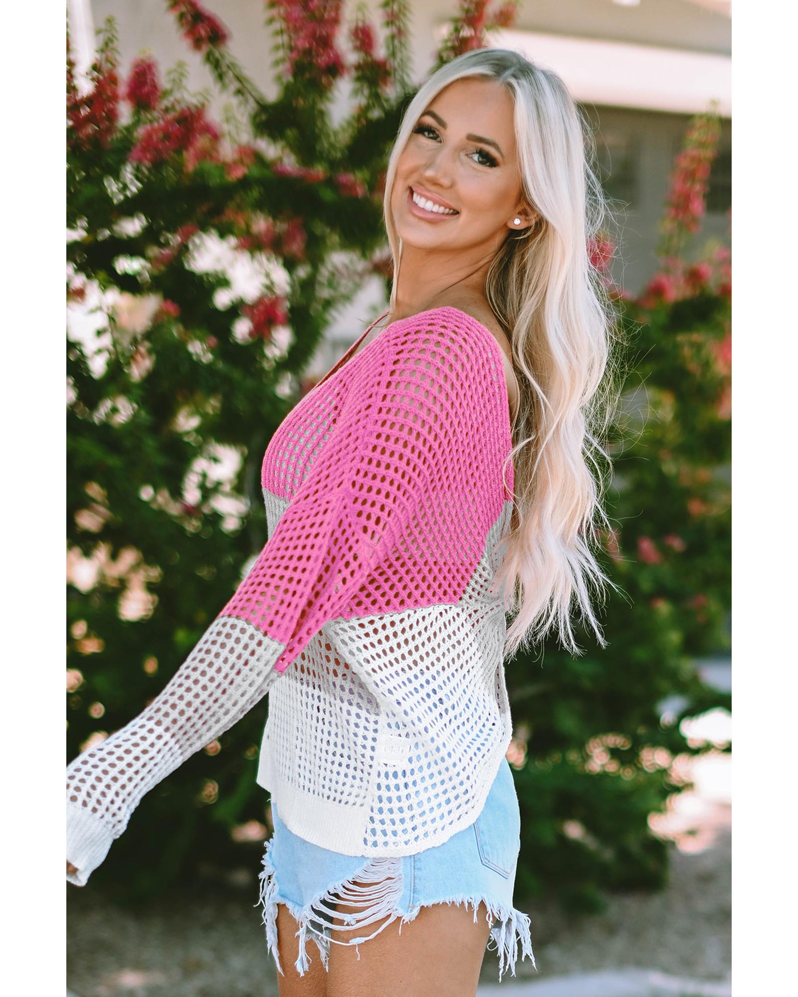 Pink Color Block Eyelet Long Sleeve Twisted Back Knit Top – L
