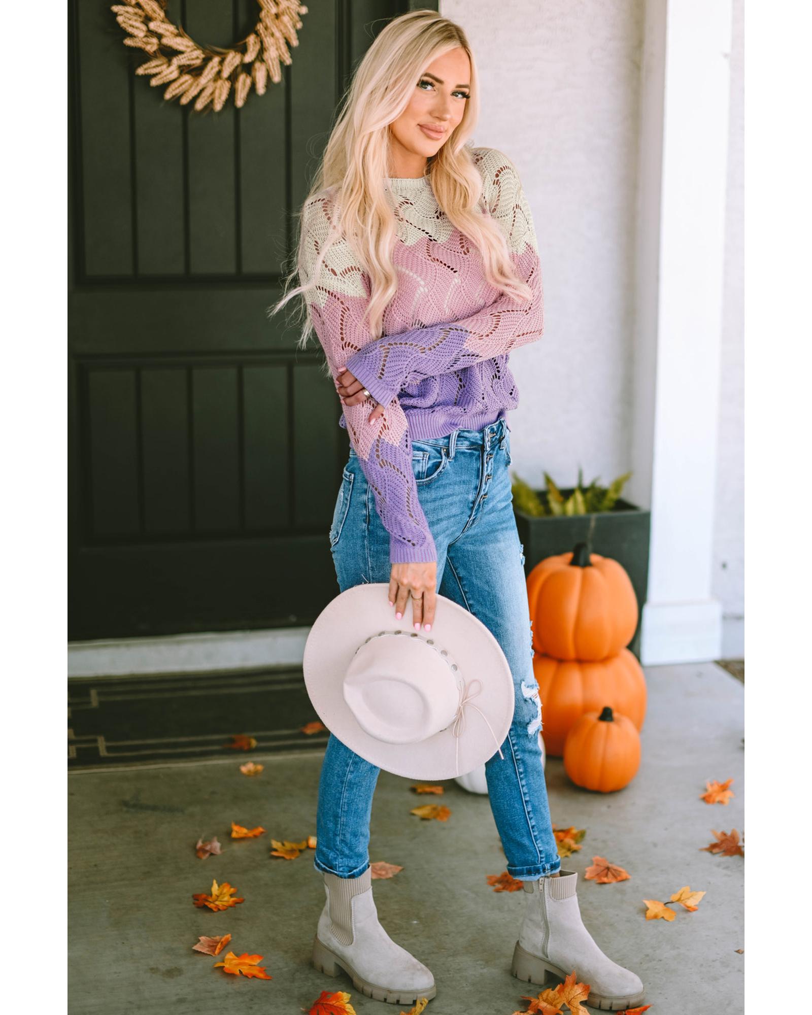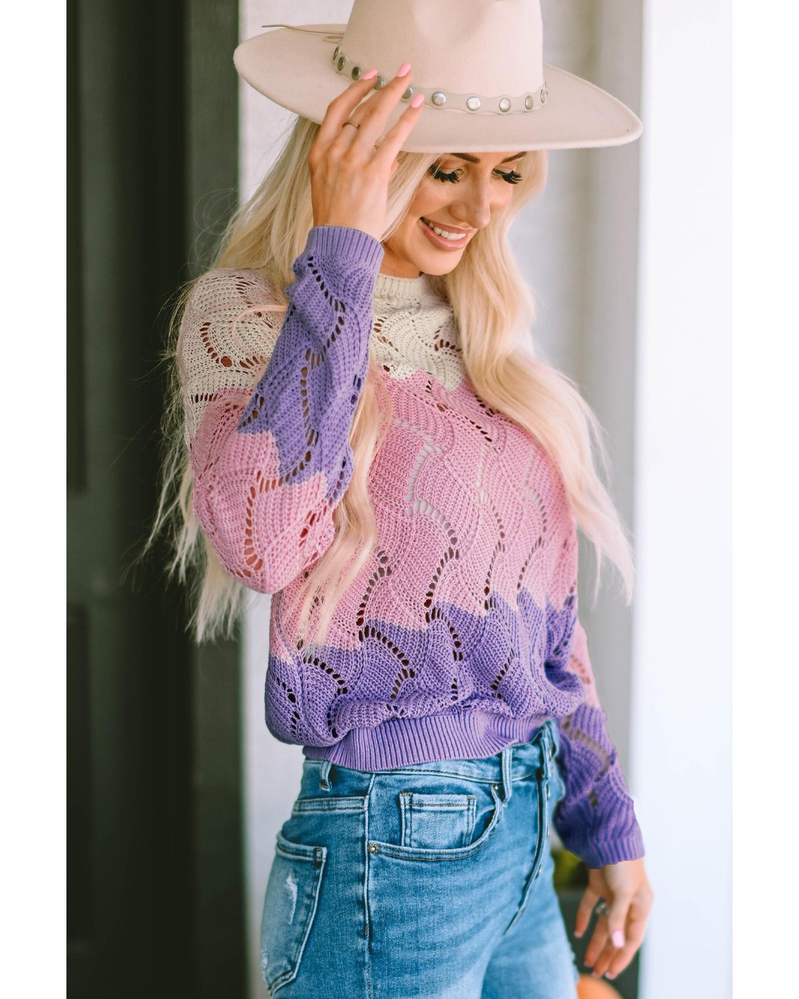 Pink Color Block Hollow Knitted Loose Sweater – L