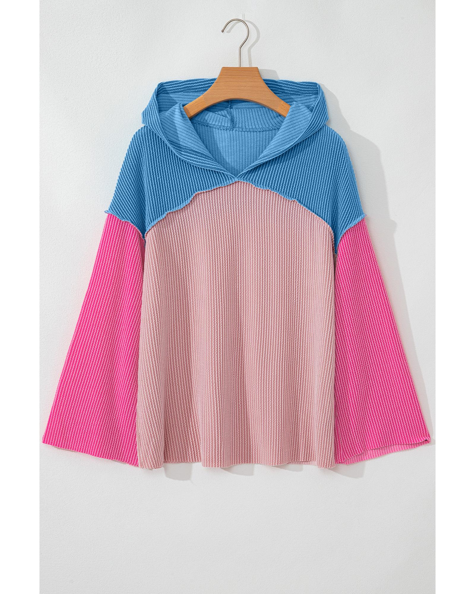 - Pink Color Block Patchwork Corded Knit Loose Fit Hooded Blouse