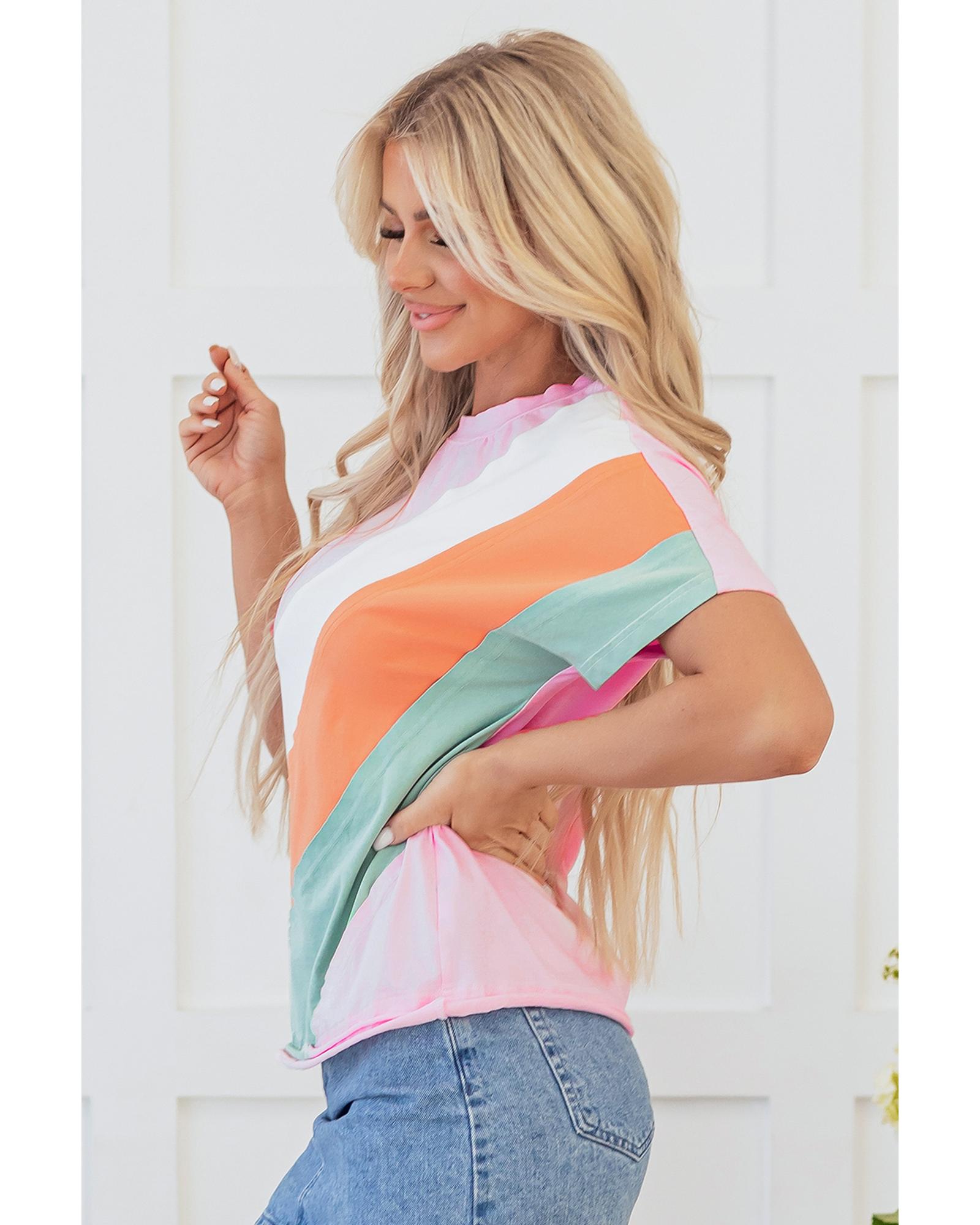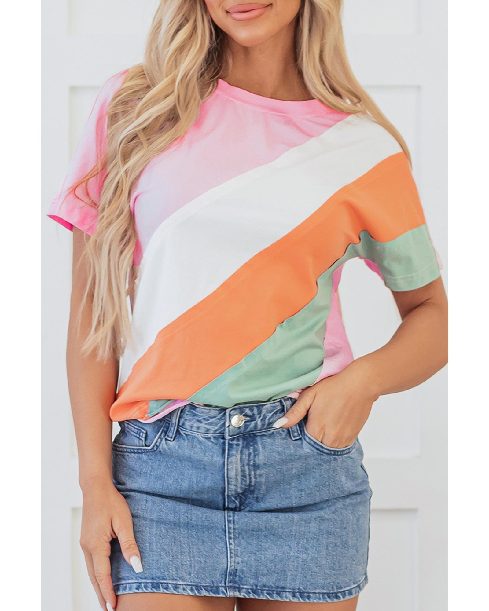 Pink Color Block Patchwork Seamed Crewneck T Shirt – M