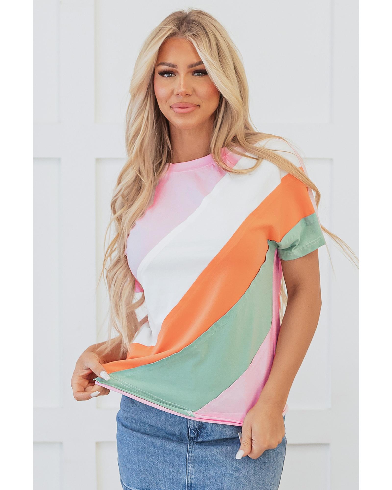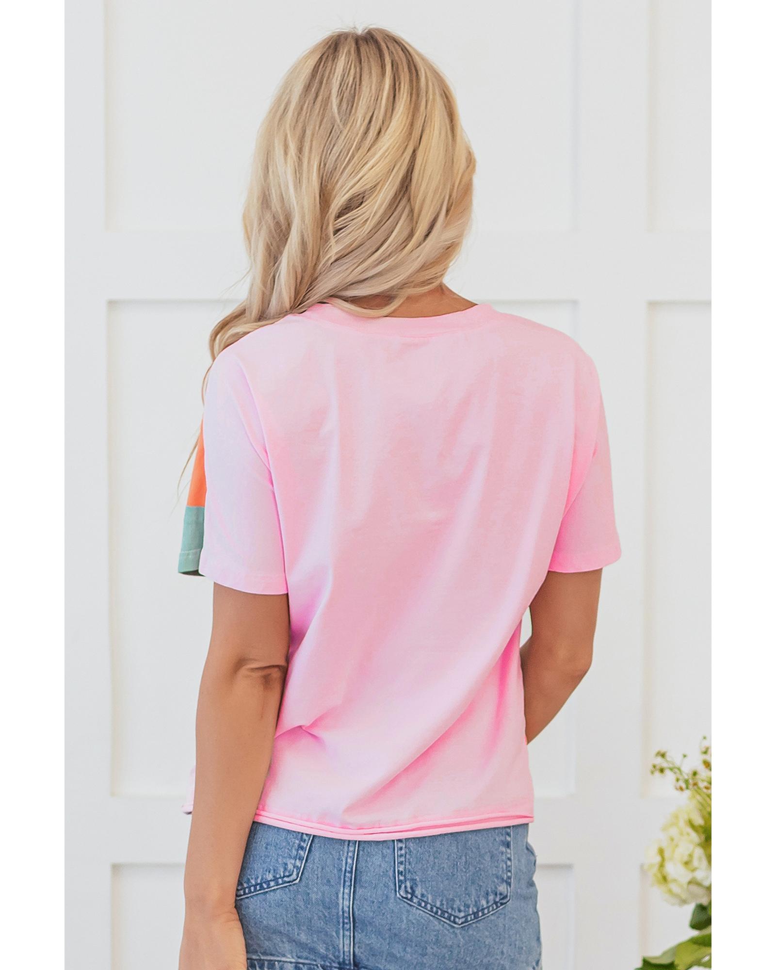 Pink Color Block Patchwork Seamed Crewneck T Shirt – XL