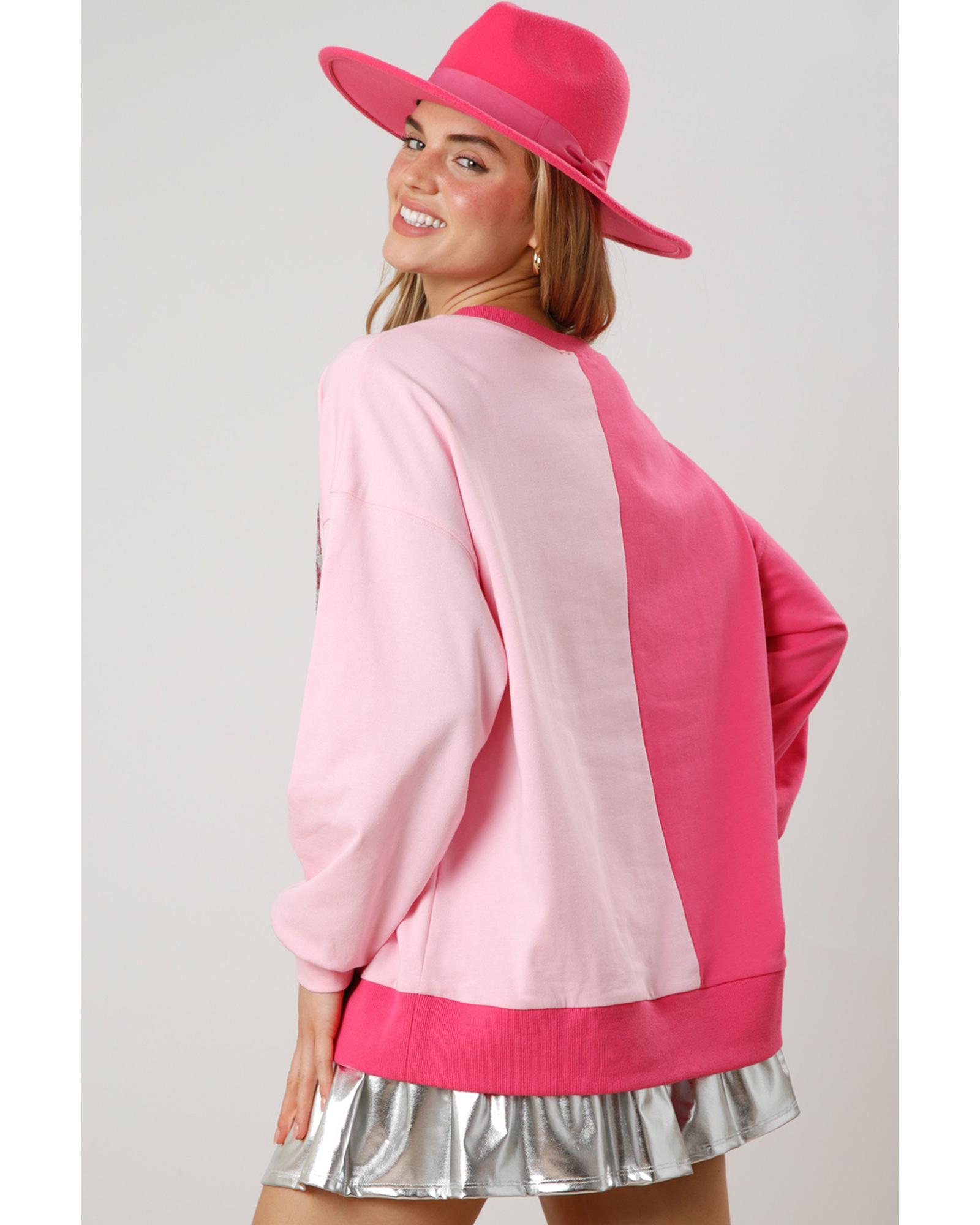 • Pink Color Block Sequined Cowgirl Boots Graphic Sweatshirt