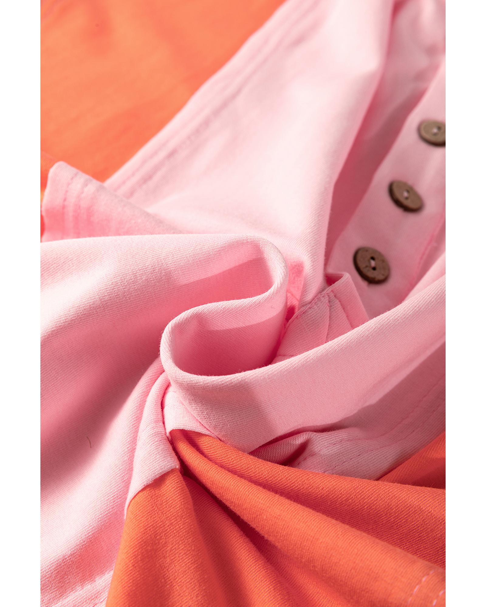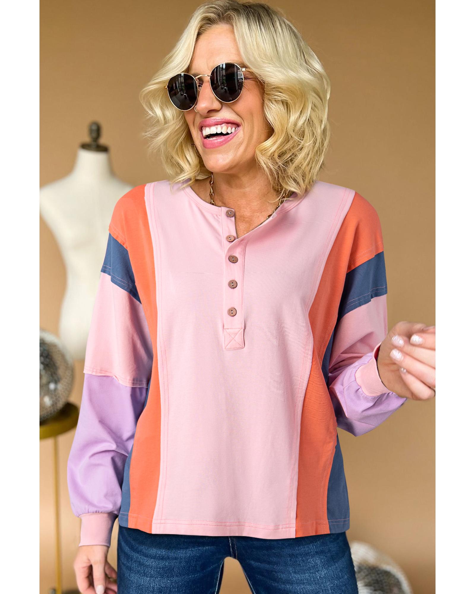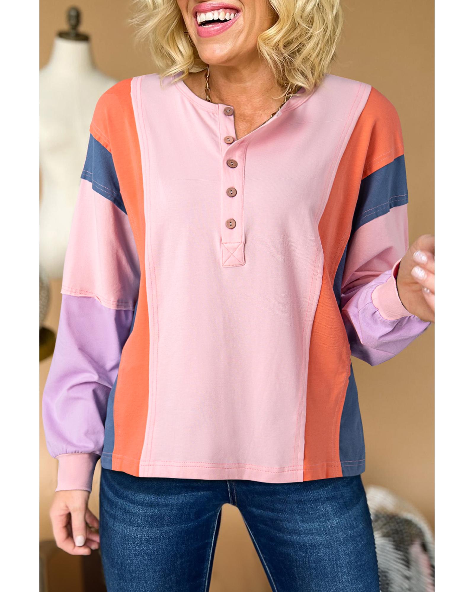 Pink Colorblock Long Sleeve Buttons Henley Top – L