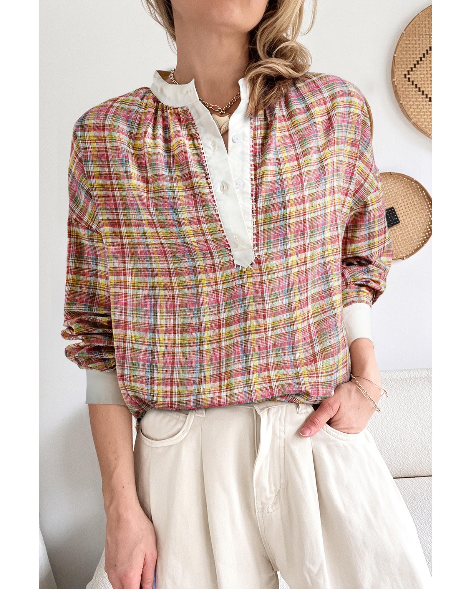 Pink Colorblock Plaid Patchwork Henley Blouse – L