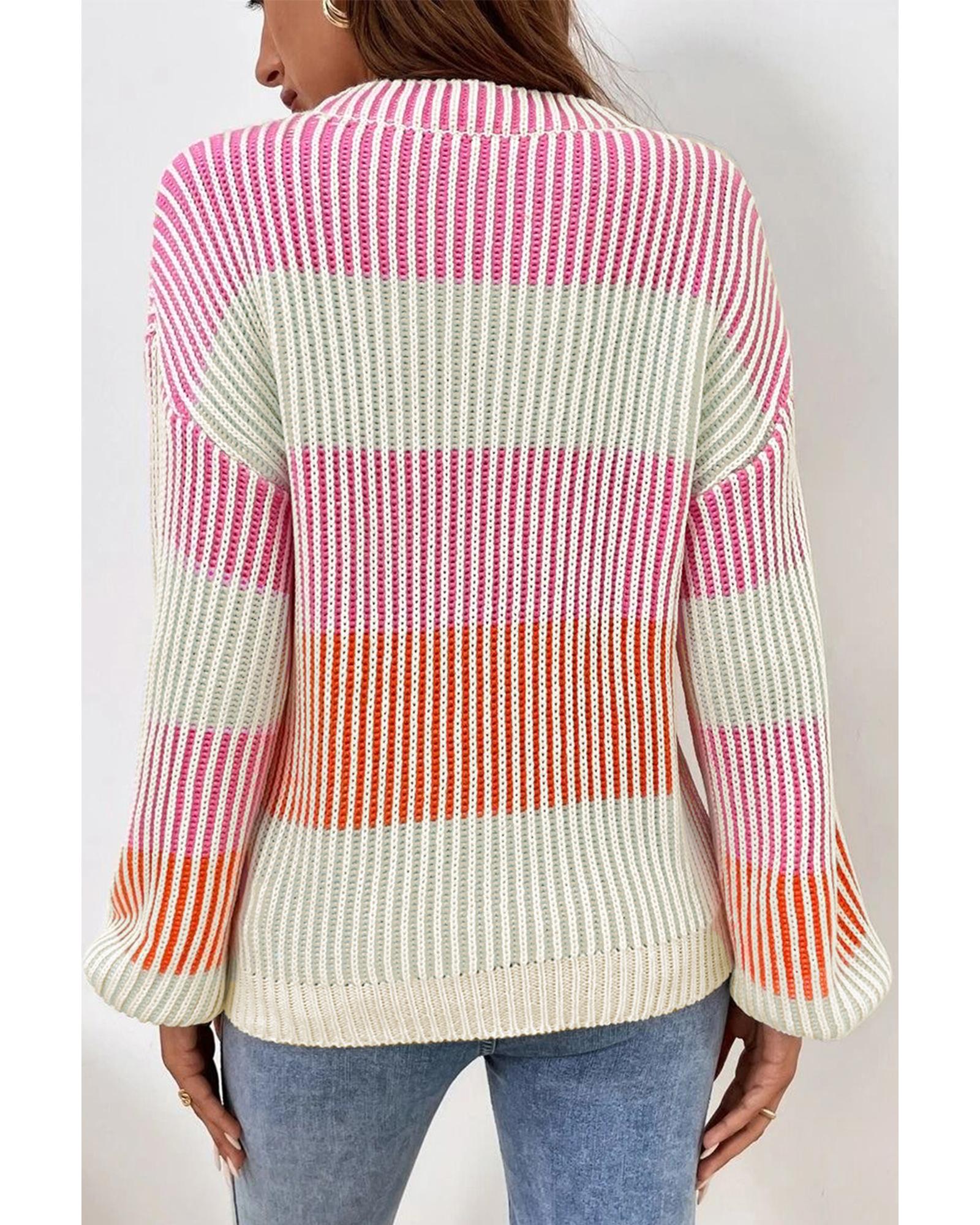 - Pink Colorblock Textured Knit Bubble Sleeve Sweater