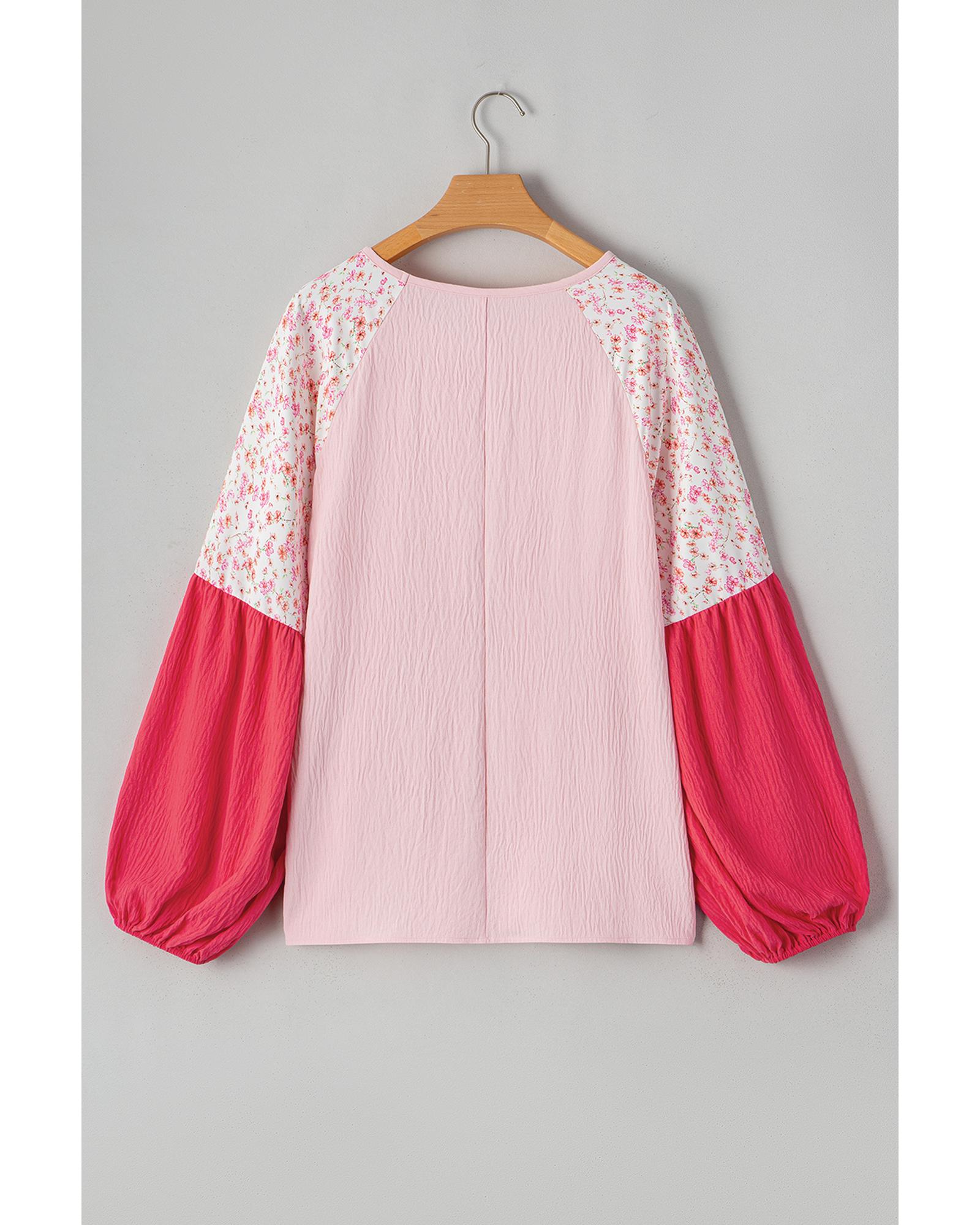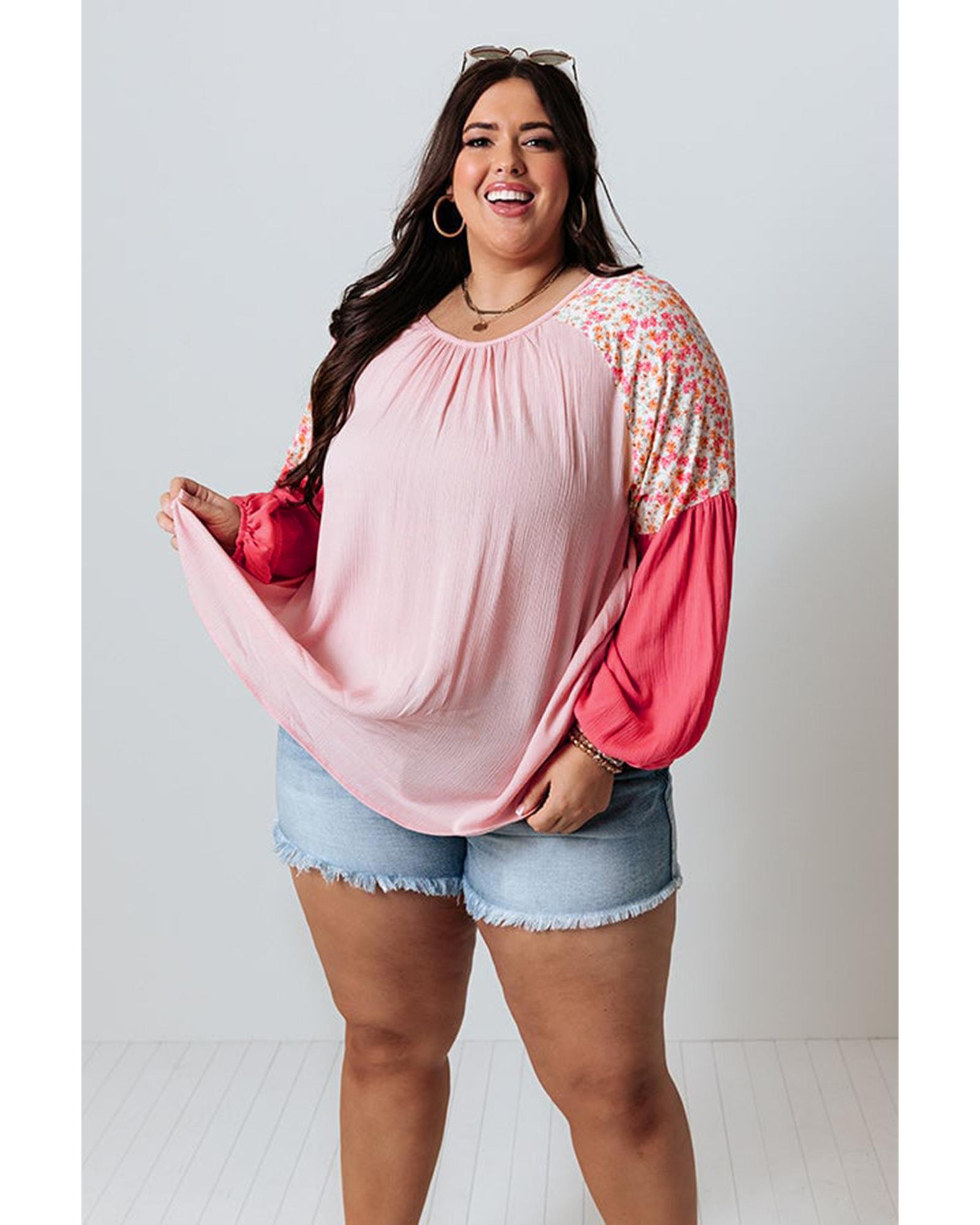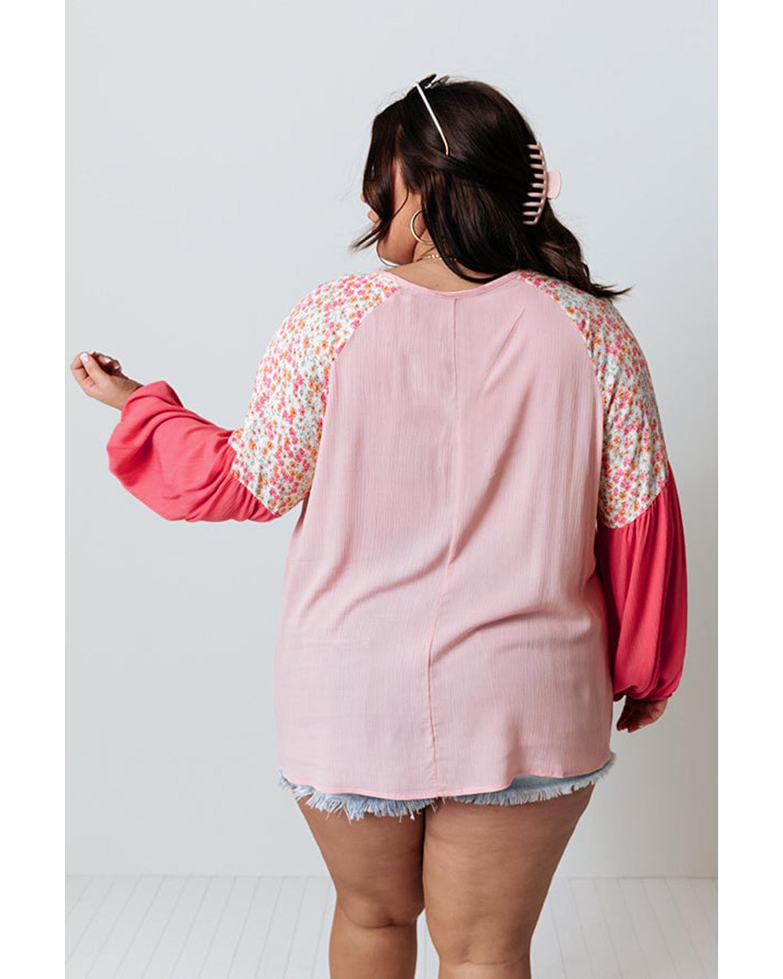 Pink Contrast Floral Patchwork Long Sleeve Plus Size Blouse – 2X