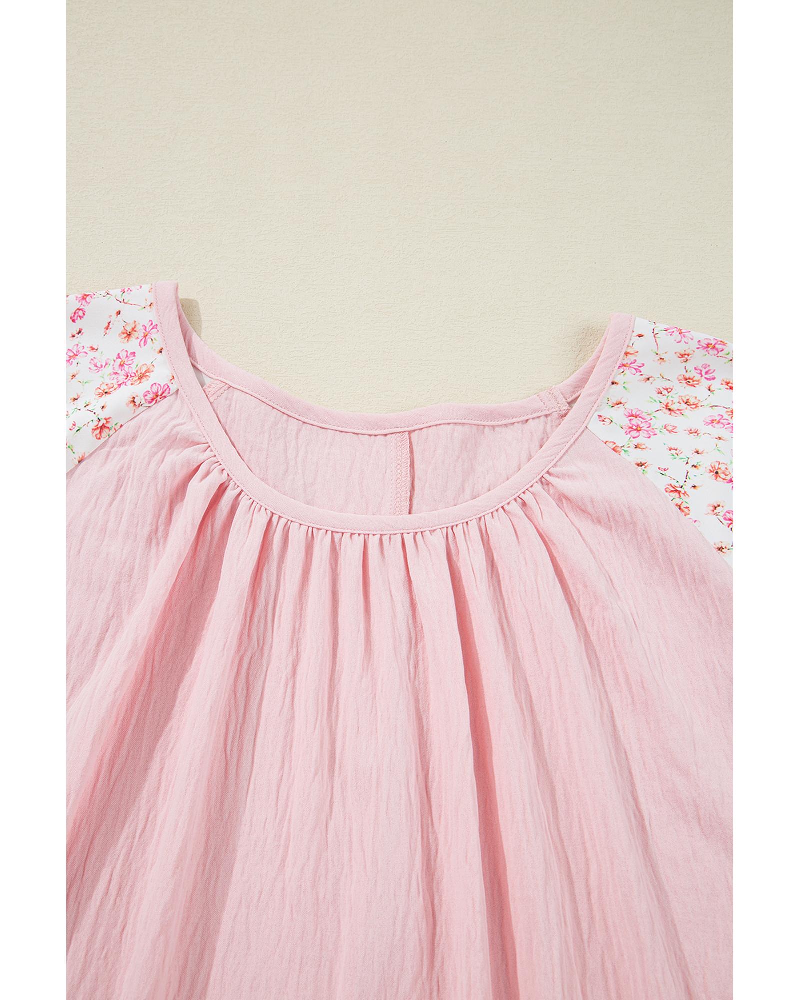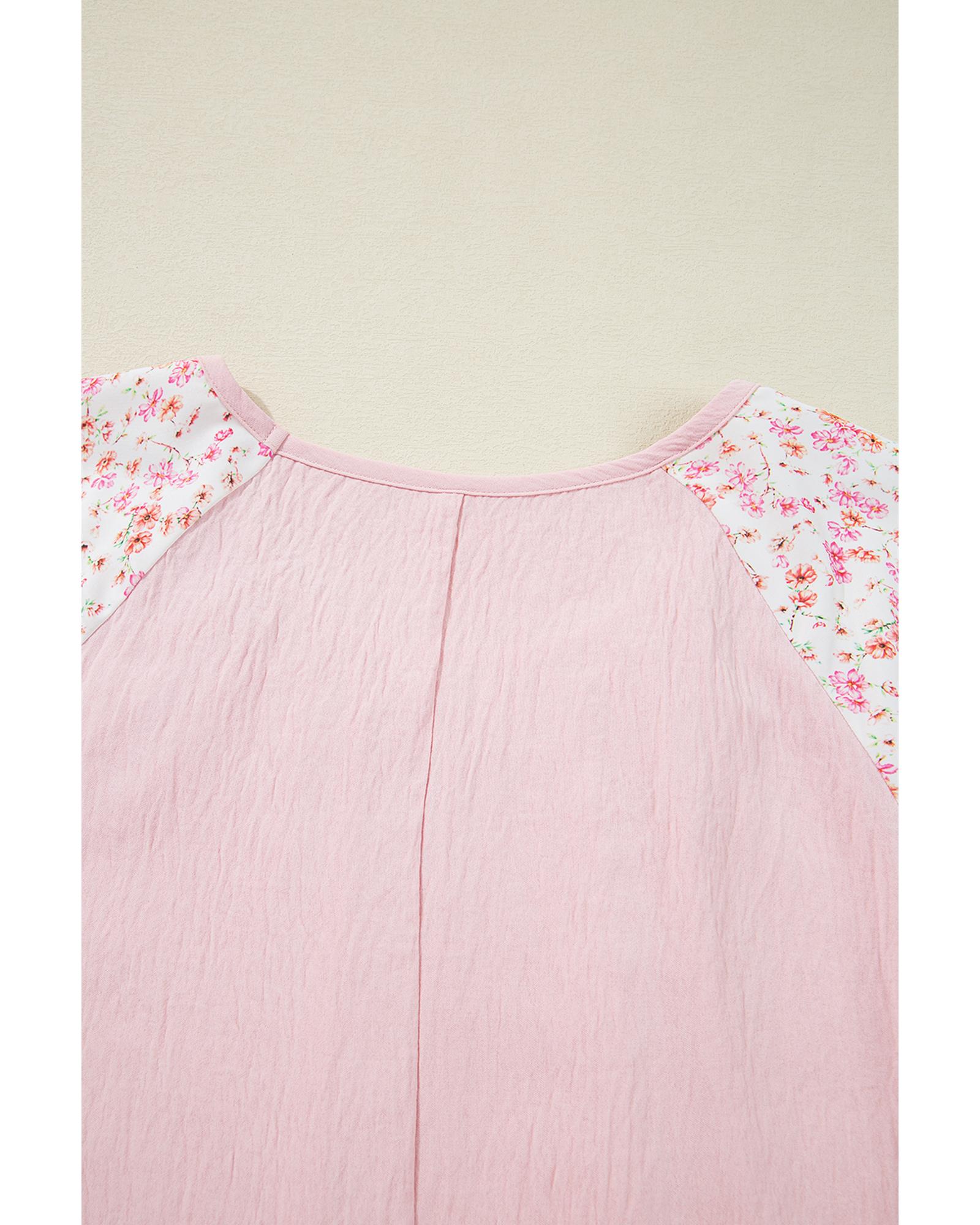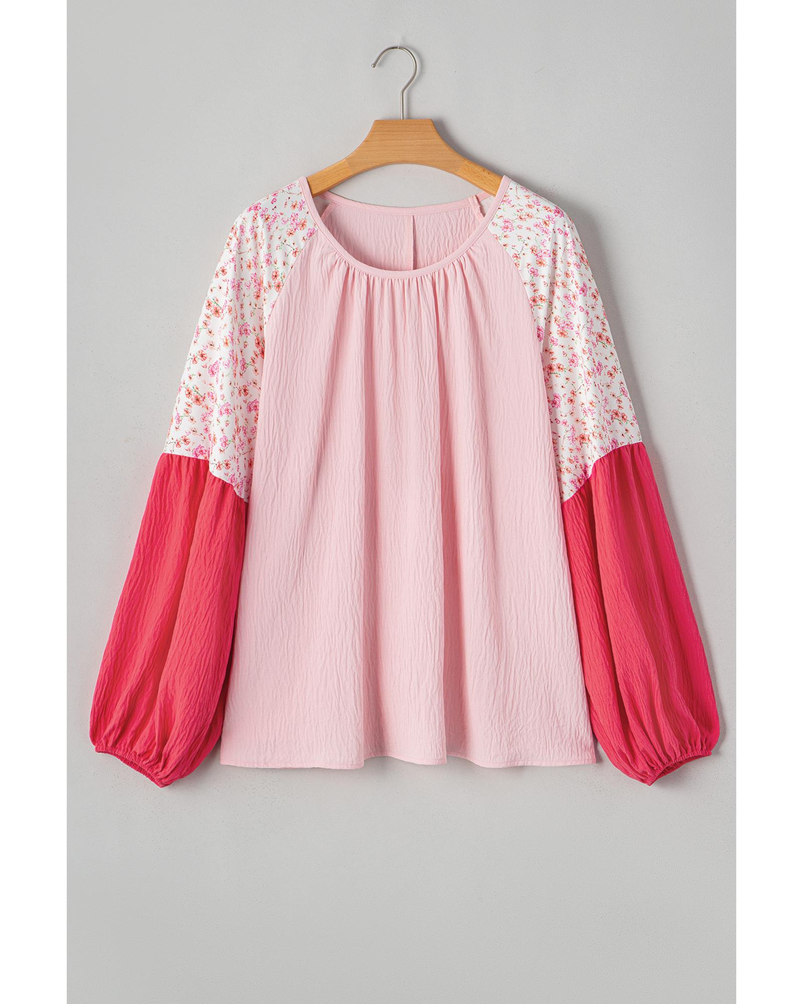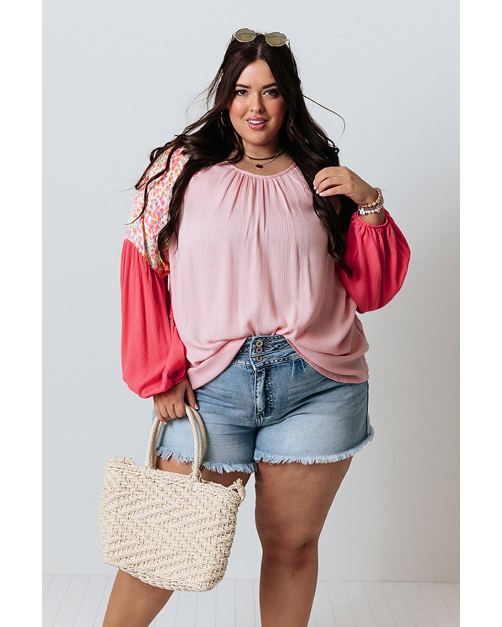 Pink Contrast Floral Patchwork Long Sleeve Plus Size Blouse – 4X
