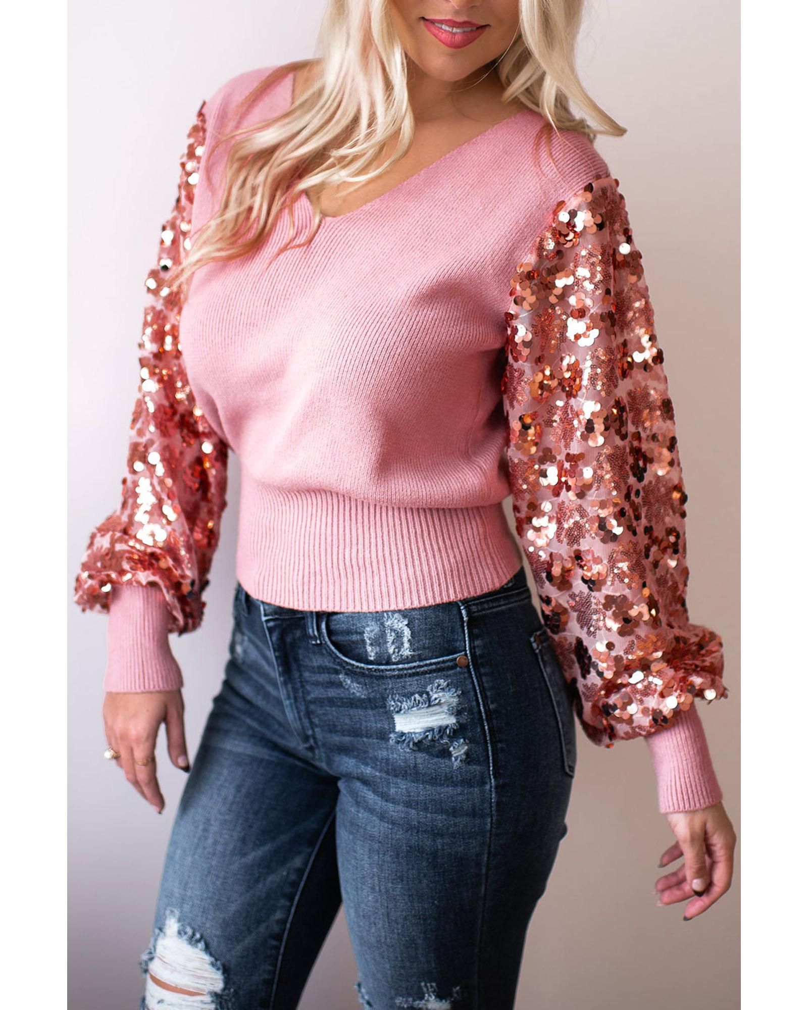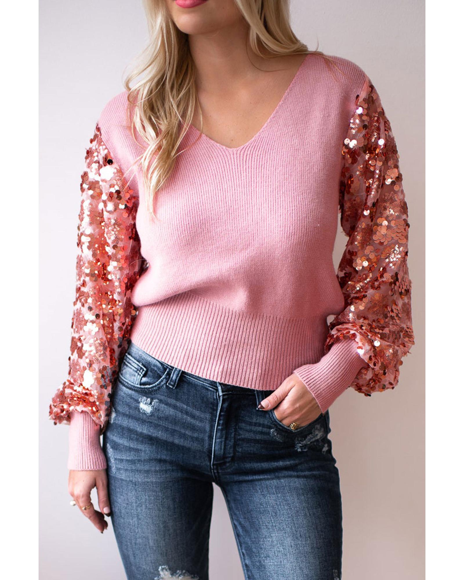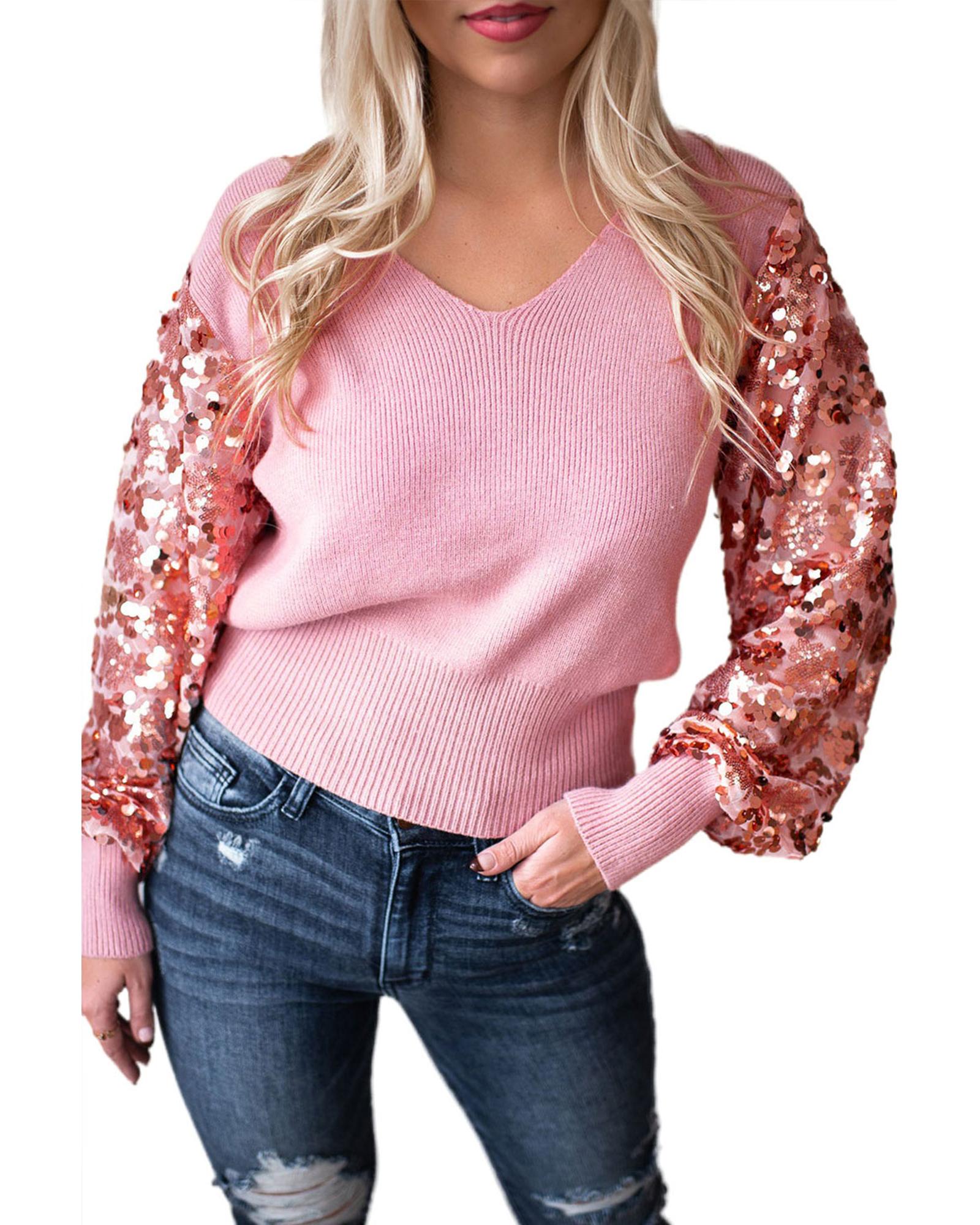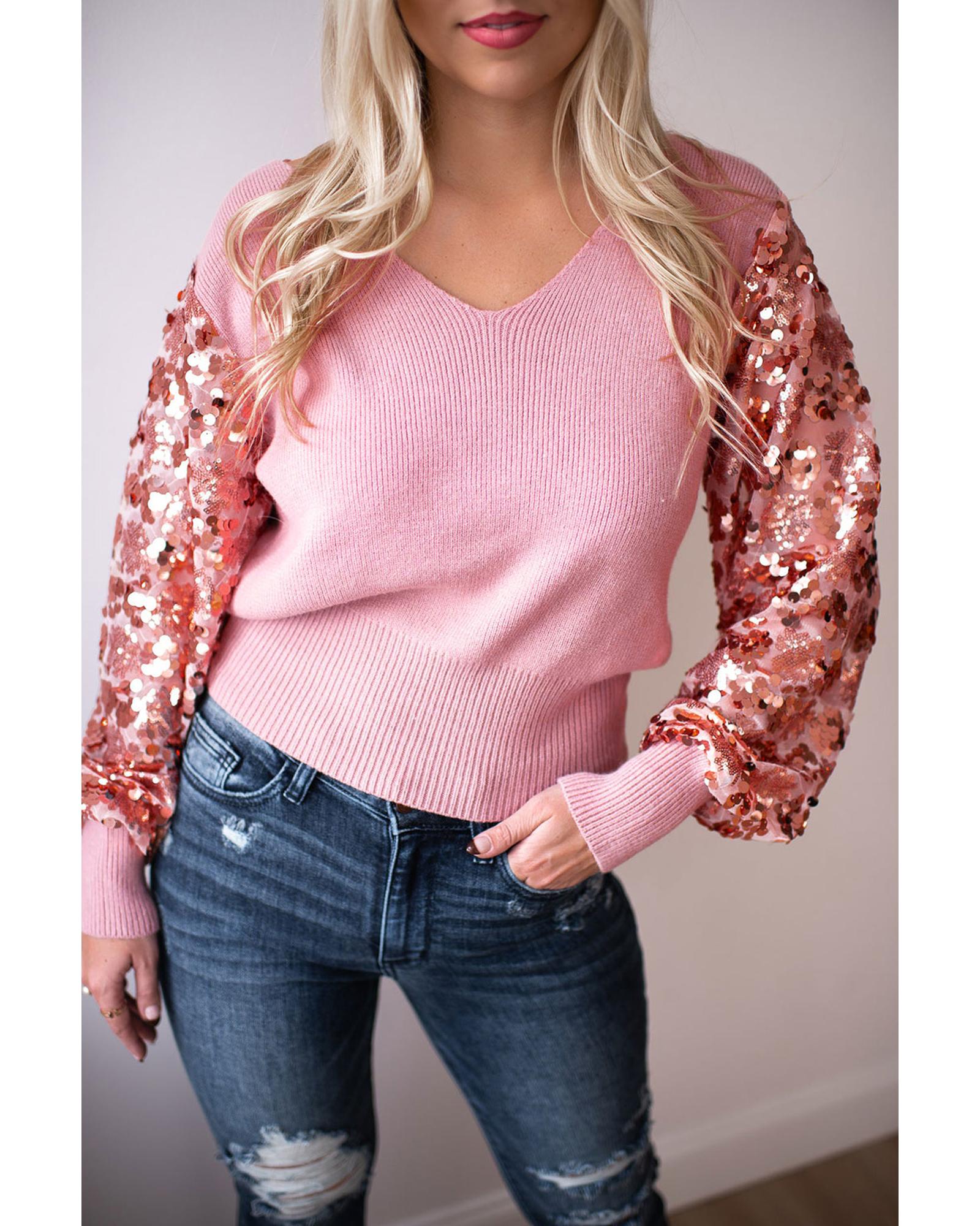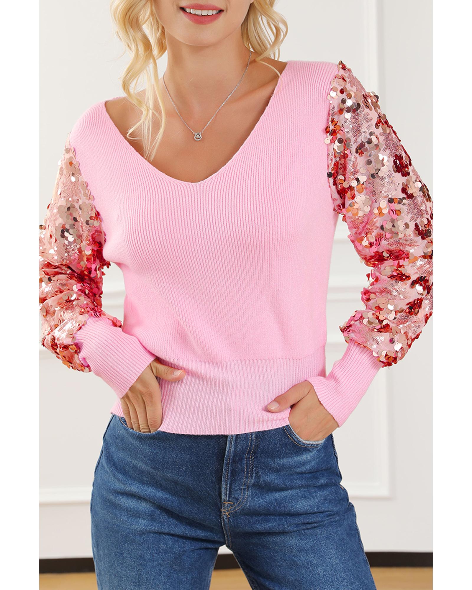 - Pink Contrast Sequin Sleeve V Neck Ribbed Knit Sweater