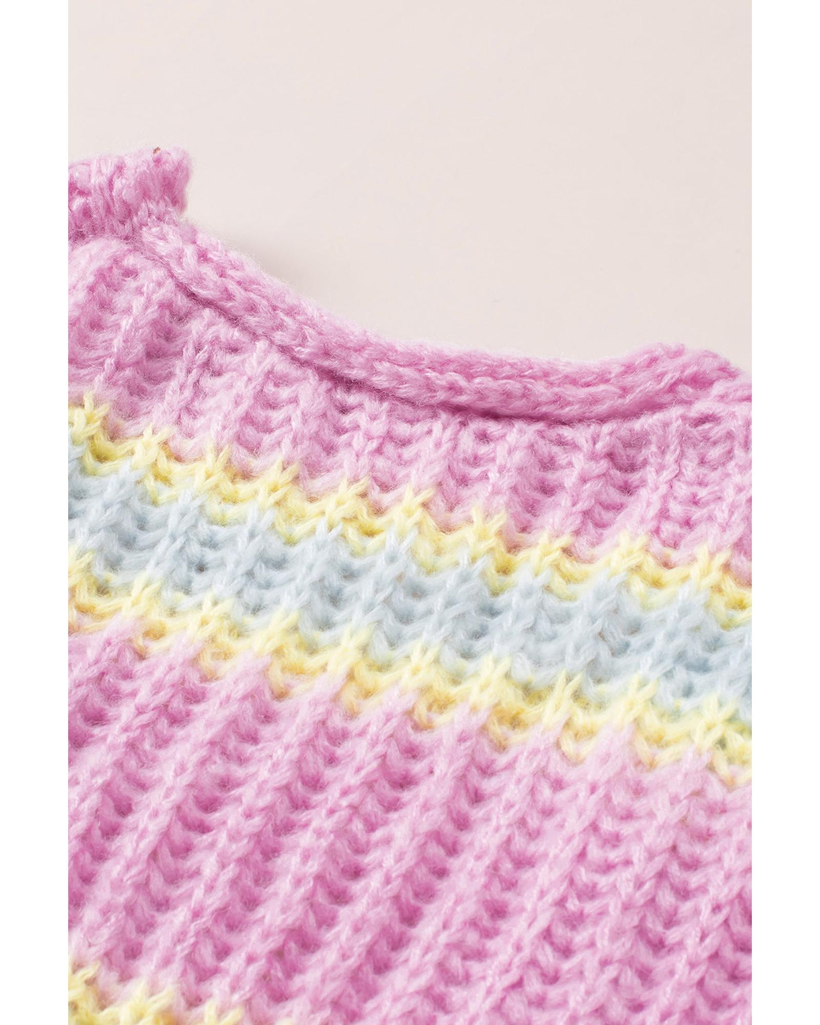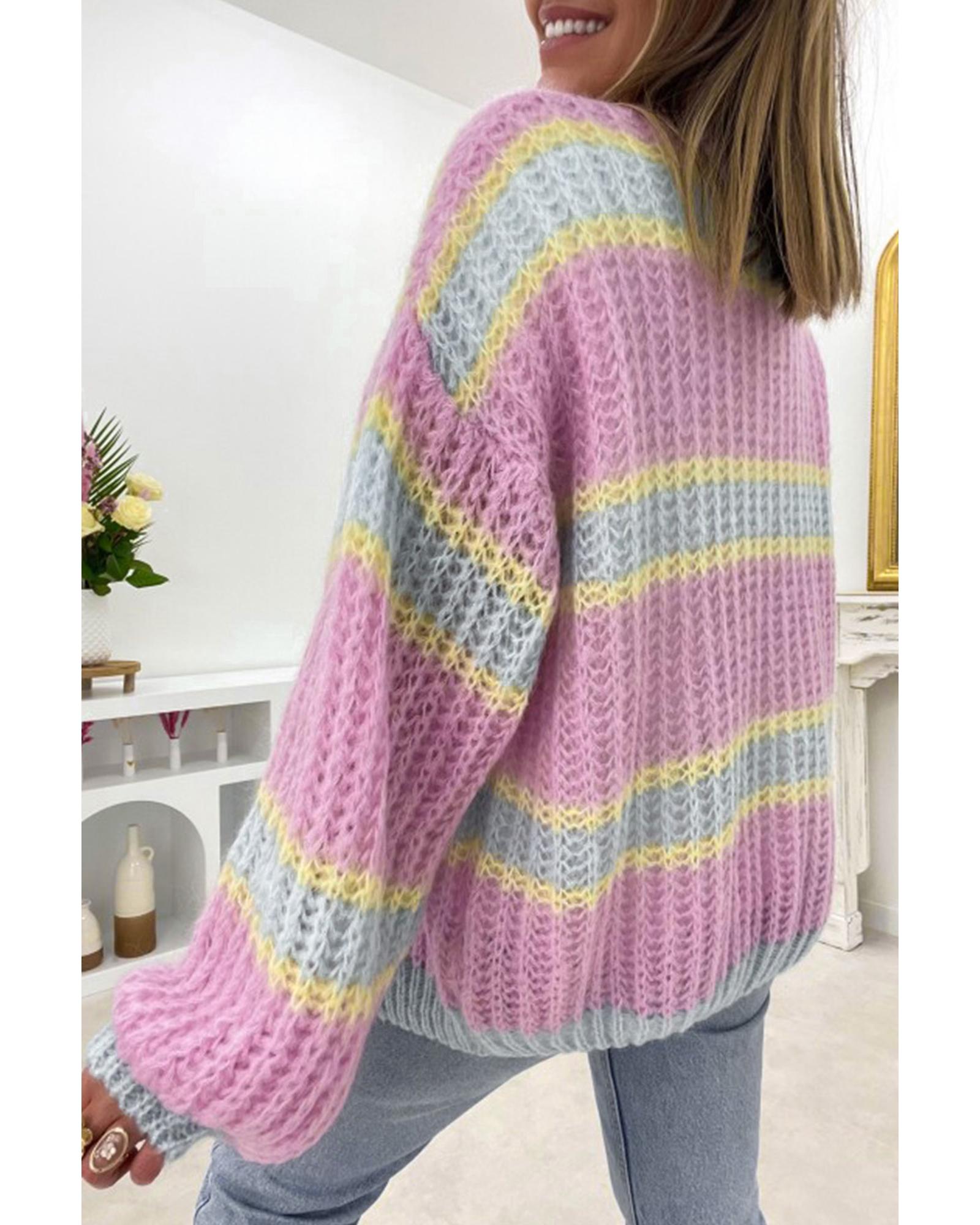 - Pink Contrast Striped Open Front Cable Cardigan