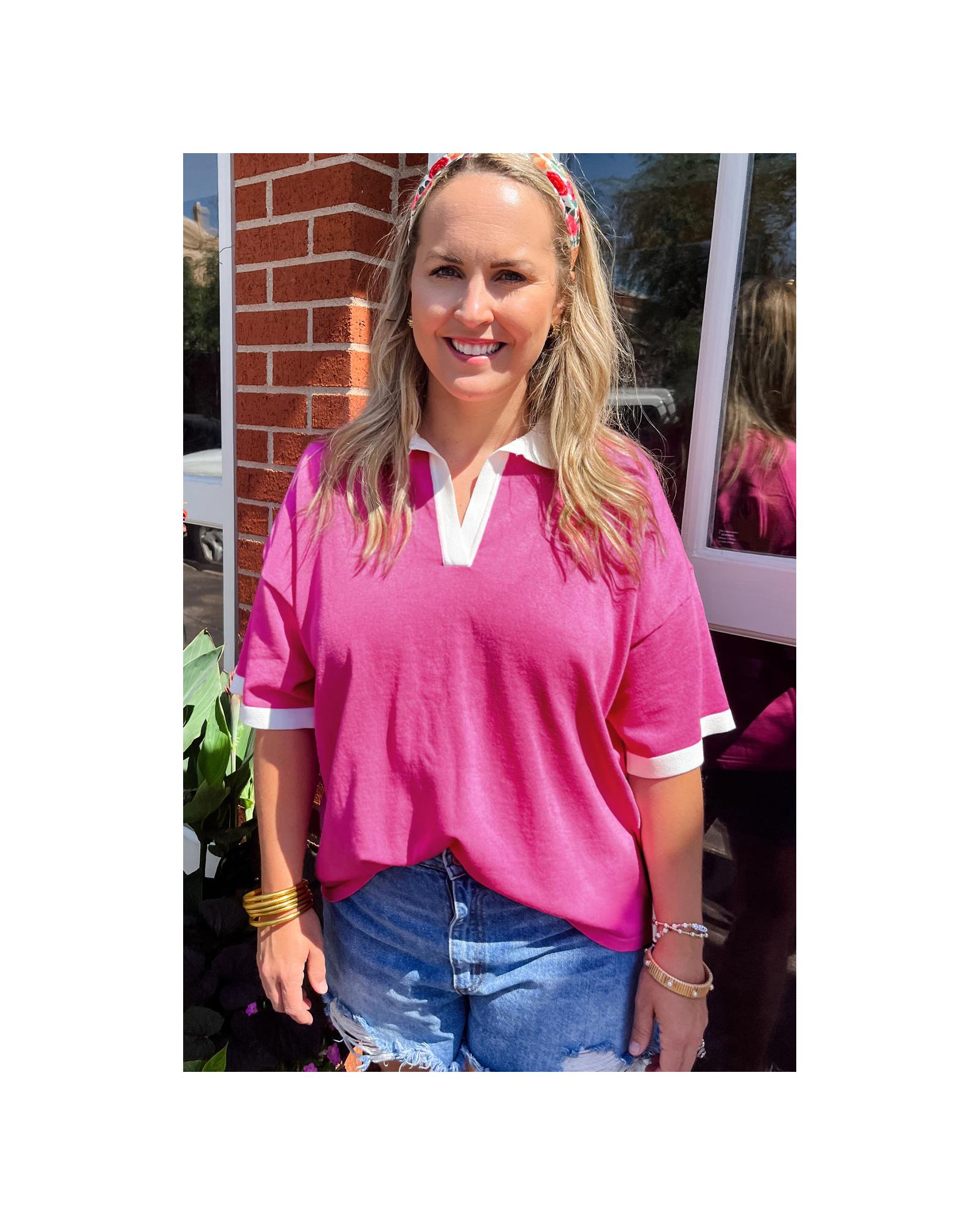 Pink Contrast Trim Collared Split Neck Short Sleeve Plus Size Top – 4X