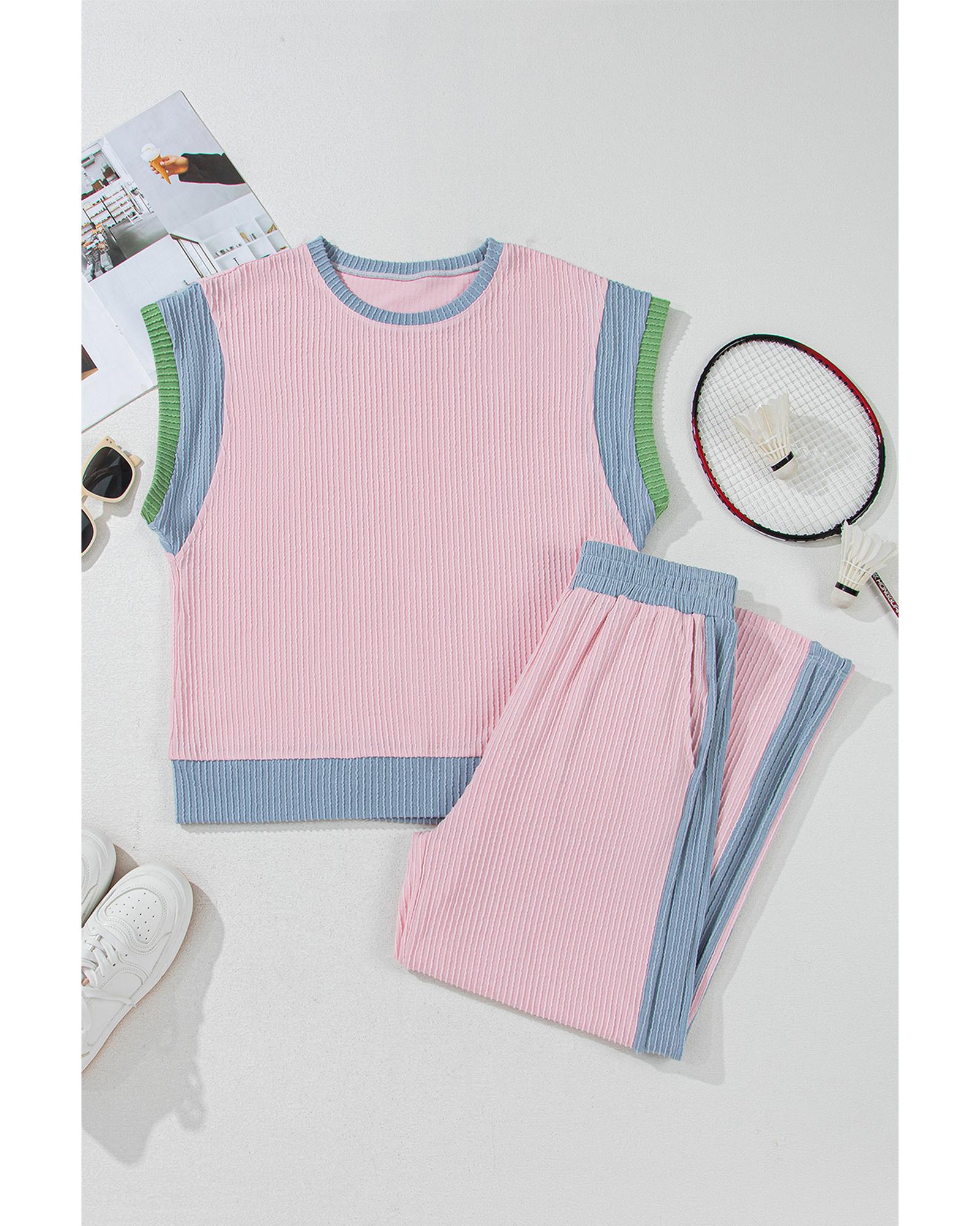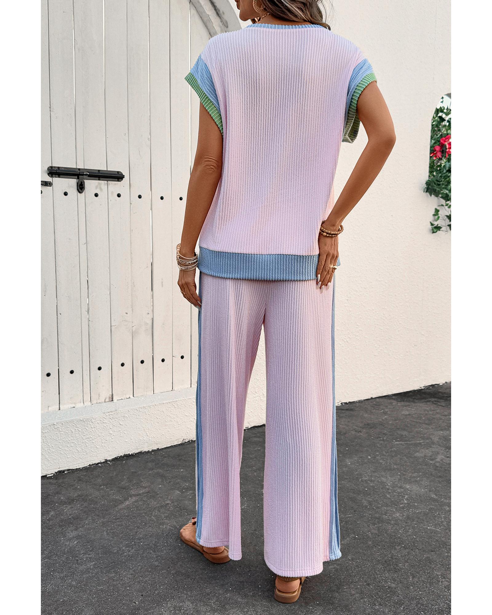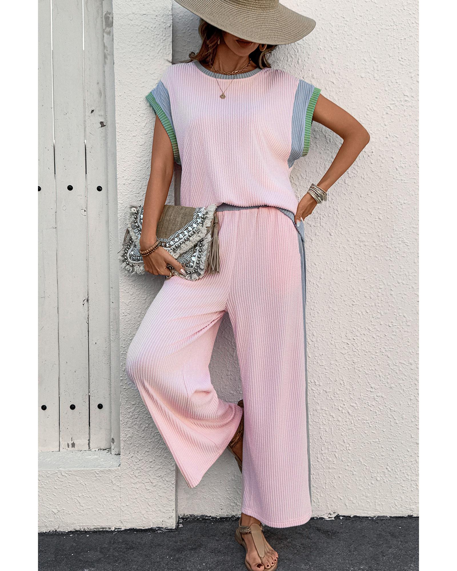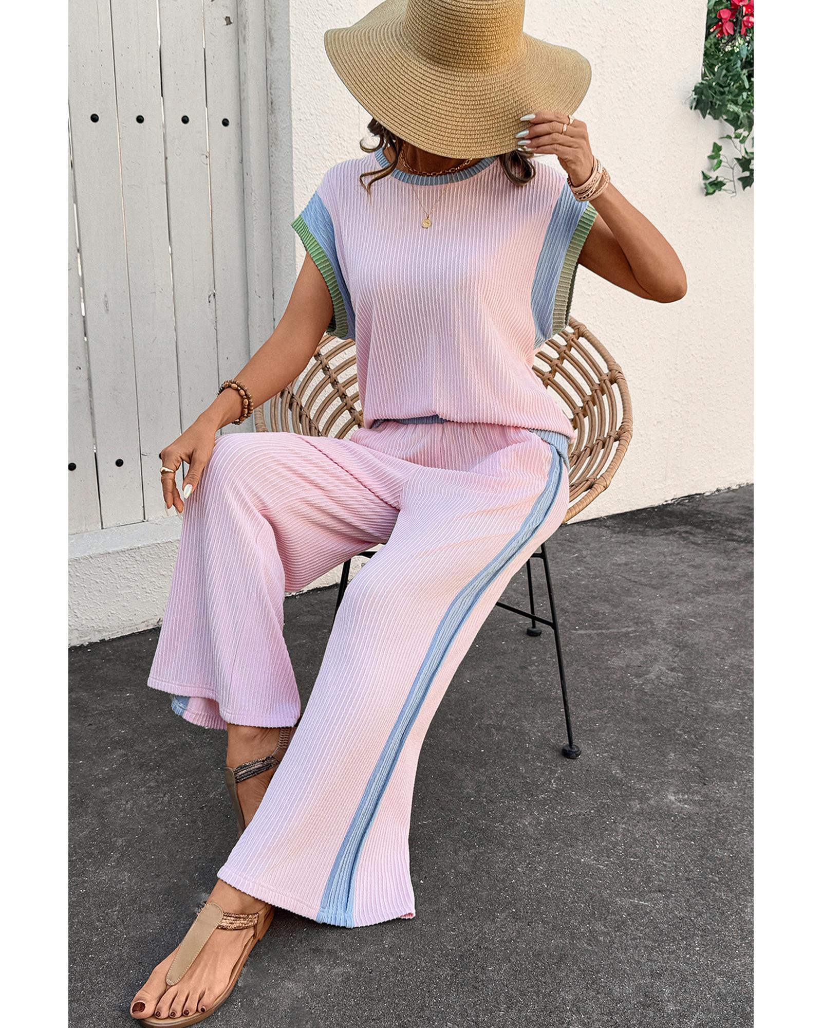 Pink Corded Colorblock Patchwork Short Sleeve Top and Loose Pants Set – S