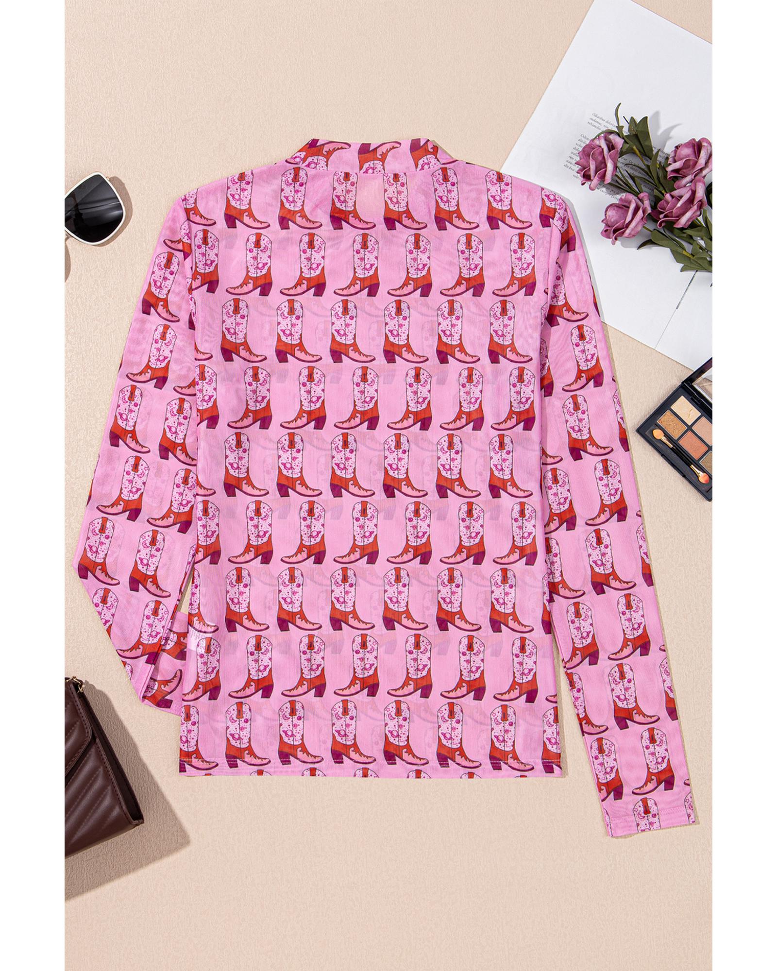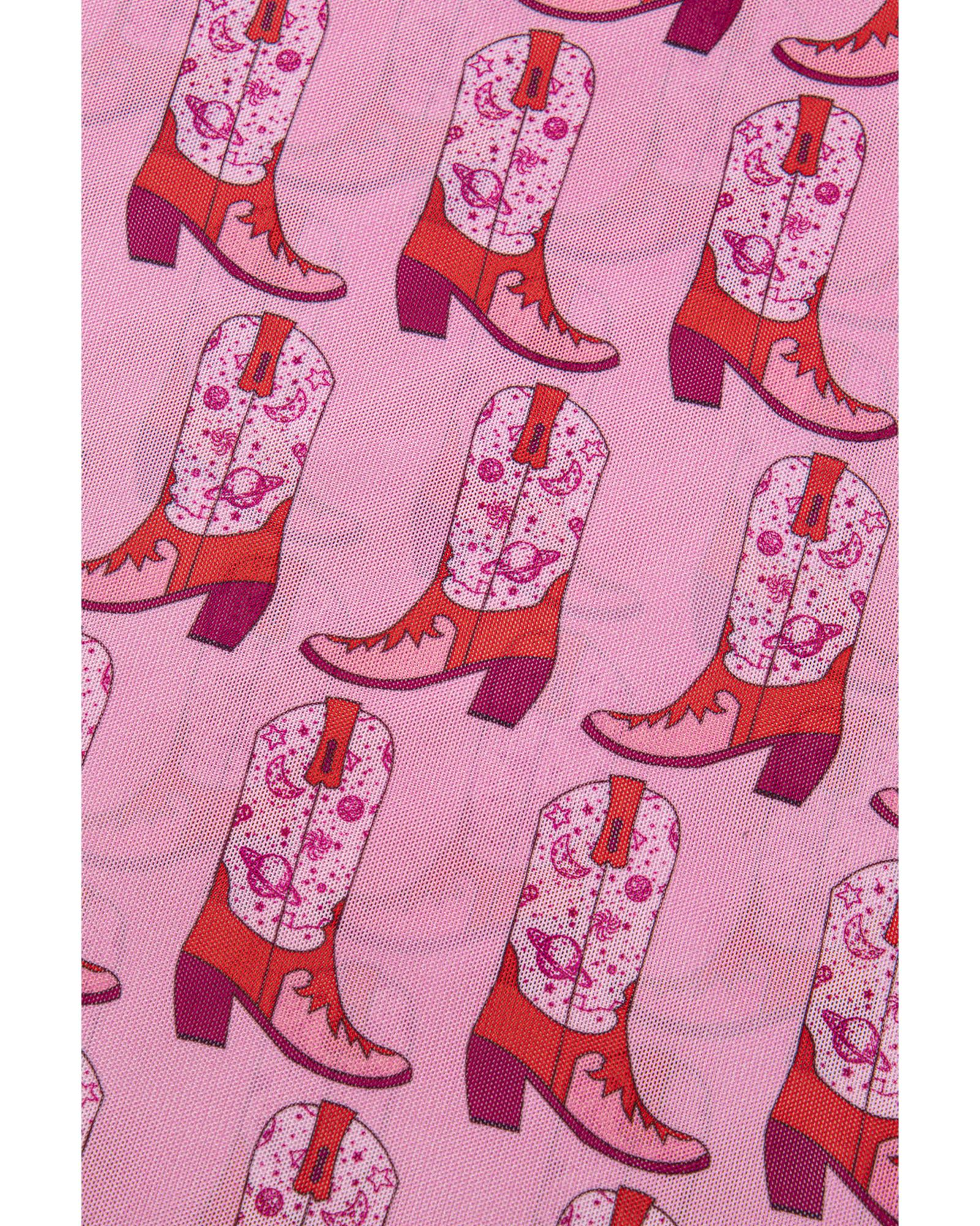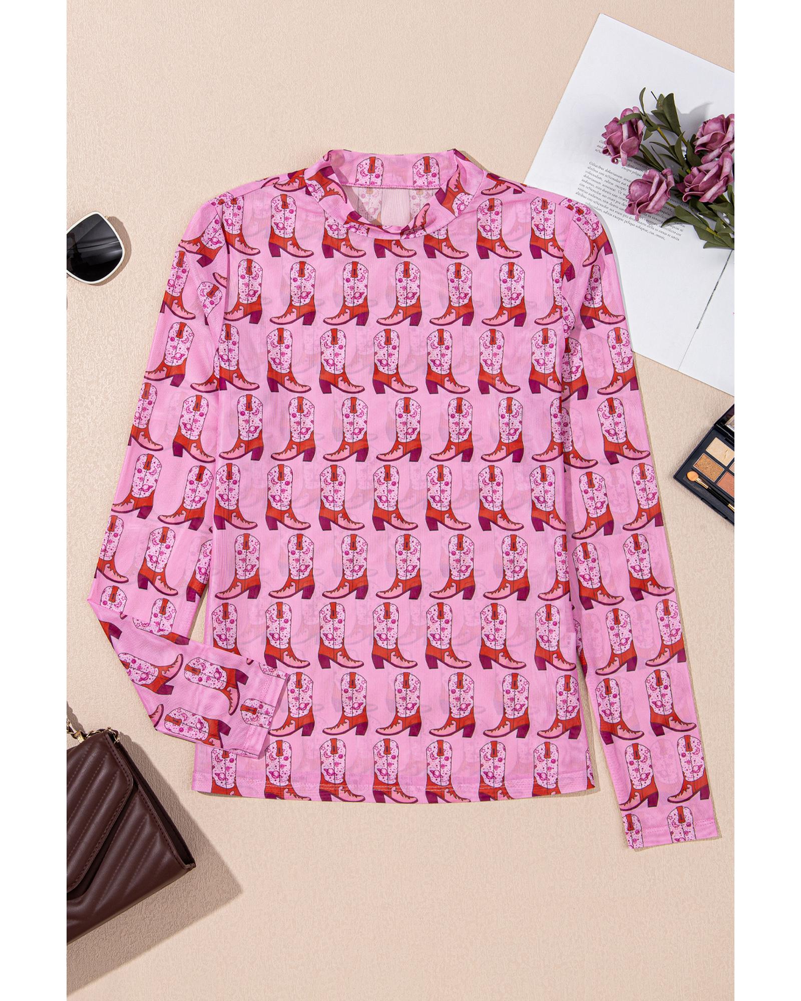 Pink Cowgirl Boots Printed Mock Neck Long Sleeve Mesh Top – S