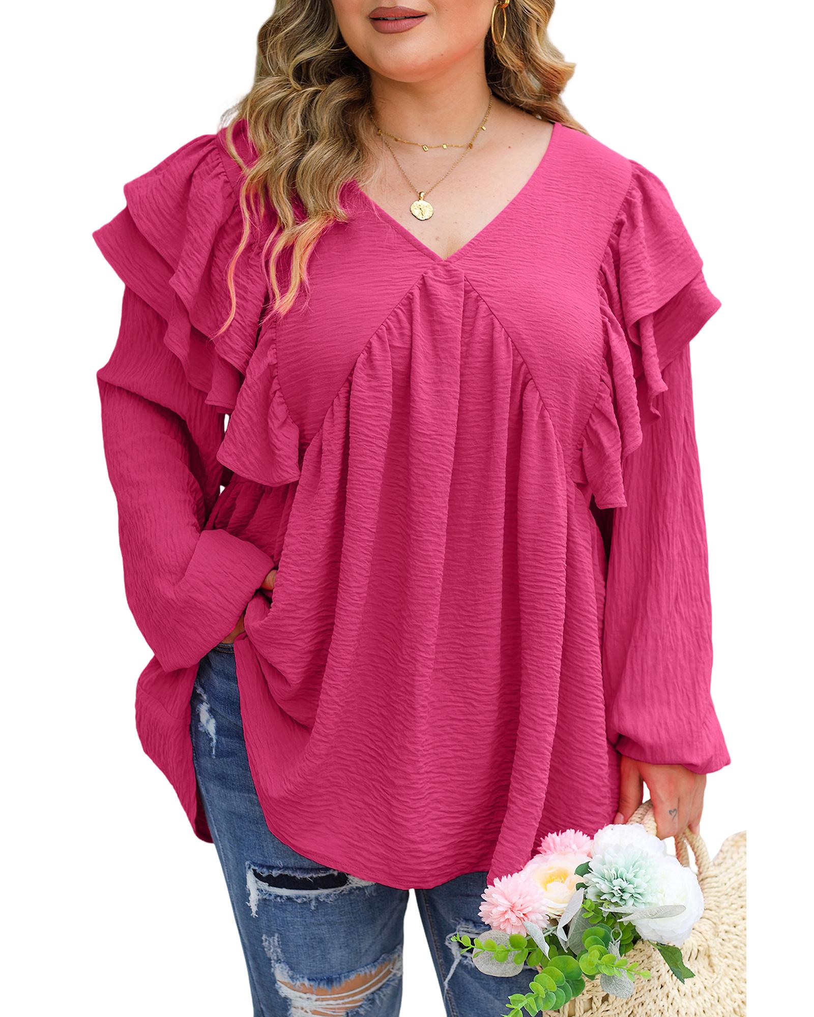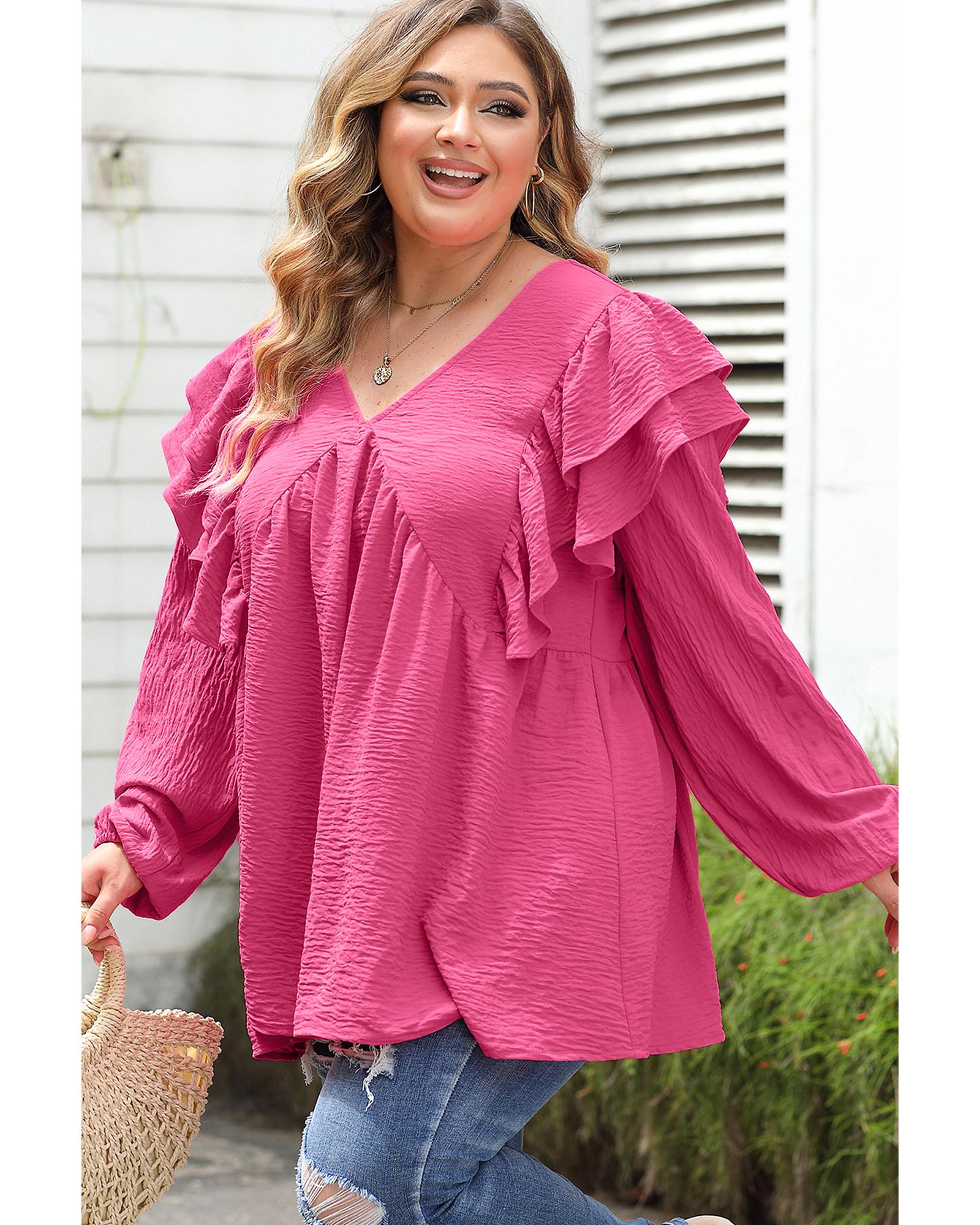 Pink Crinkle Ruffled V Neck Plus Size Blouse - 2X Original price was: $68.99.Current price is: $36.99.