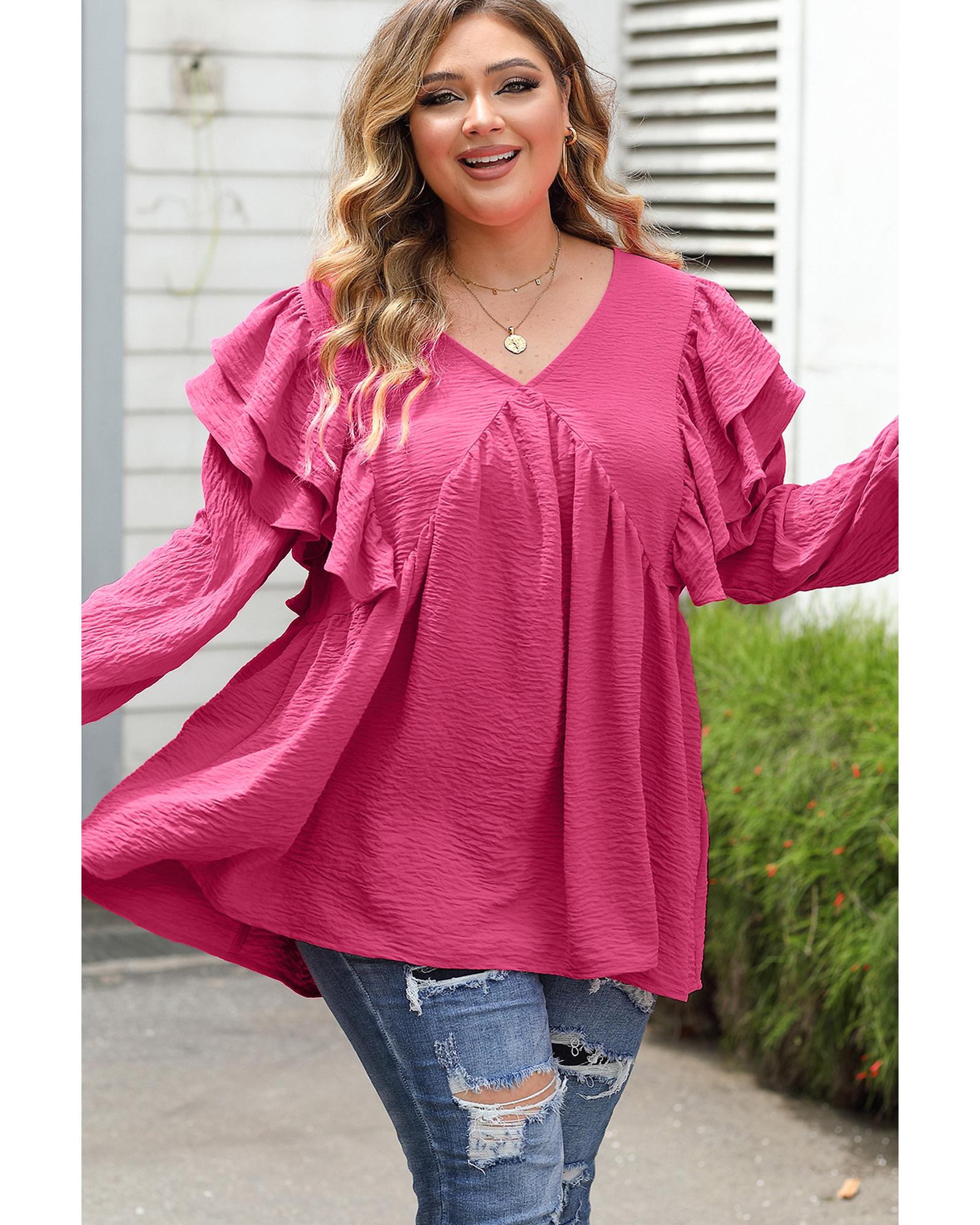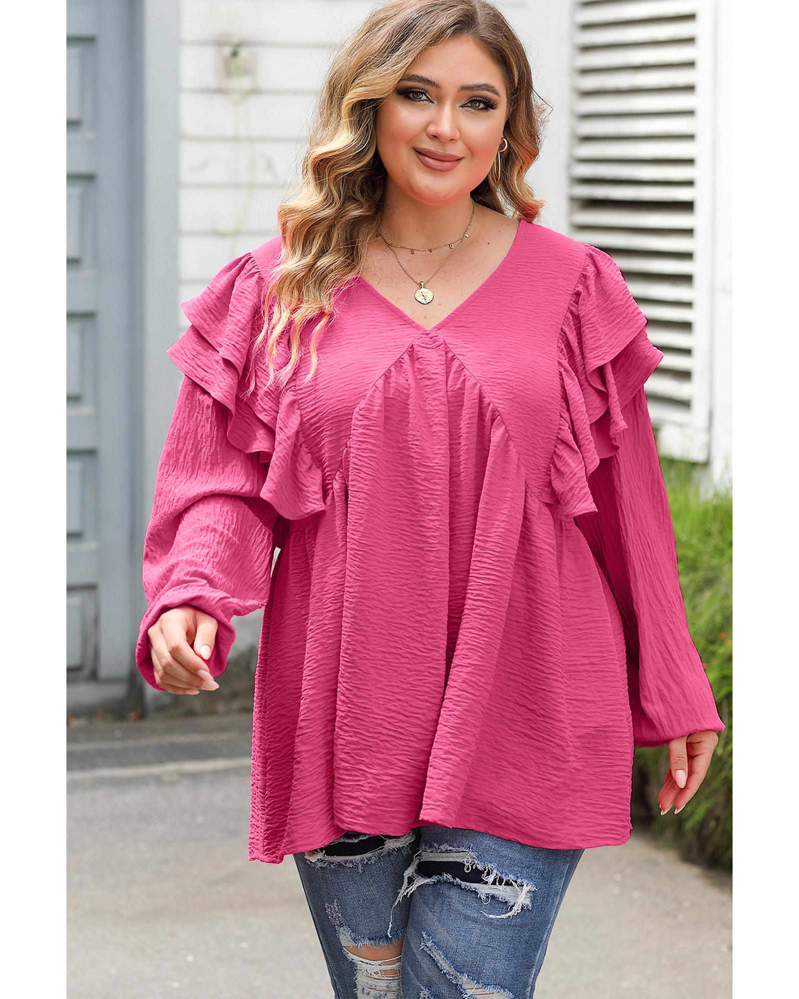 Pink Crinkle Ruffled V Neck Plus Size Blouse - 1X