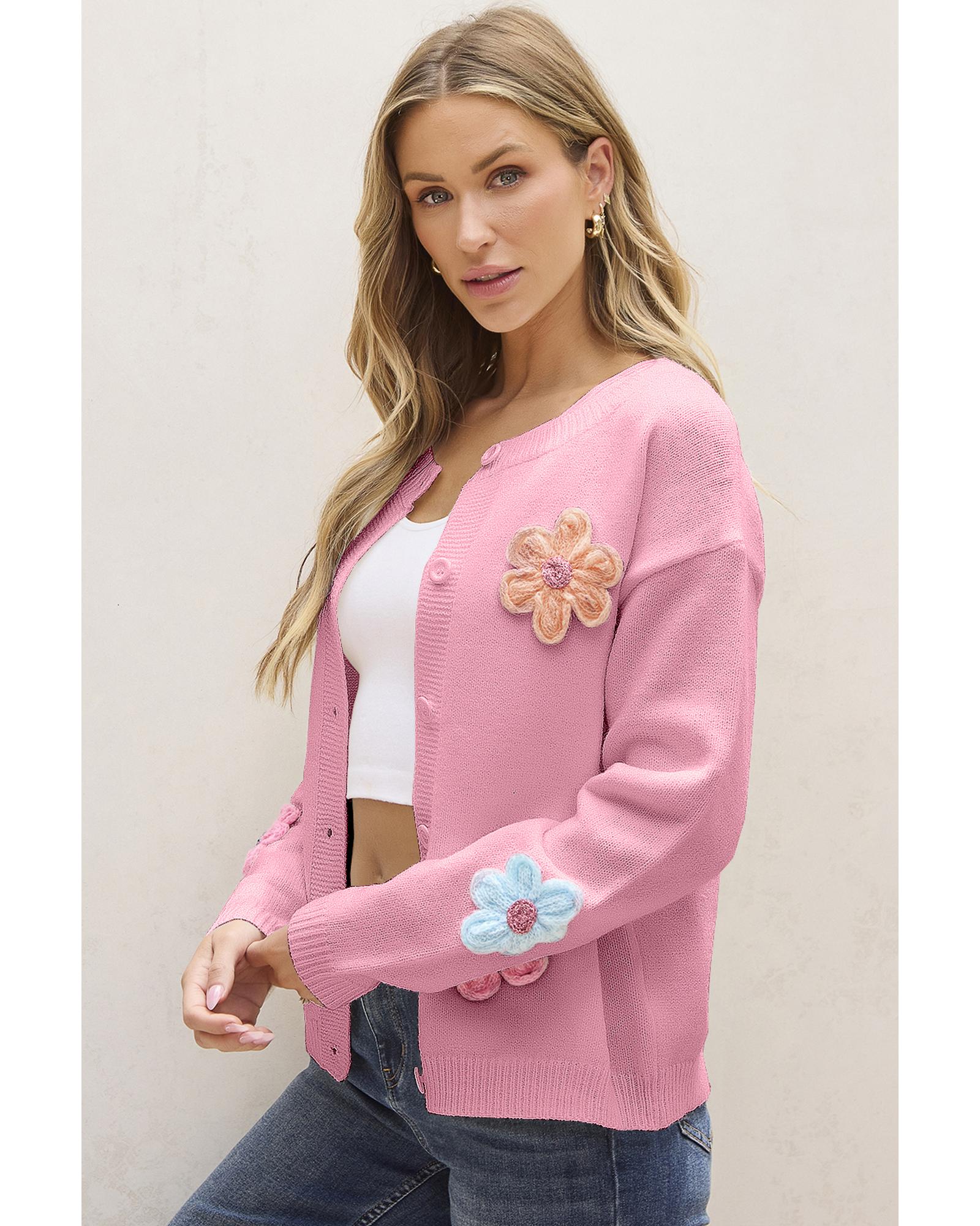 Pink Cute Knitted Floral Pattern Button Up Cardigan – L