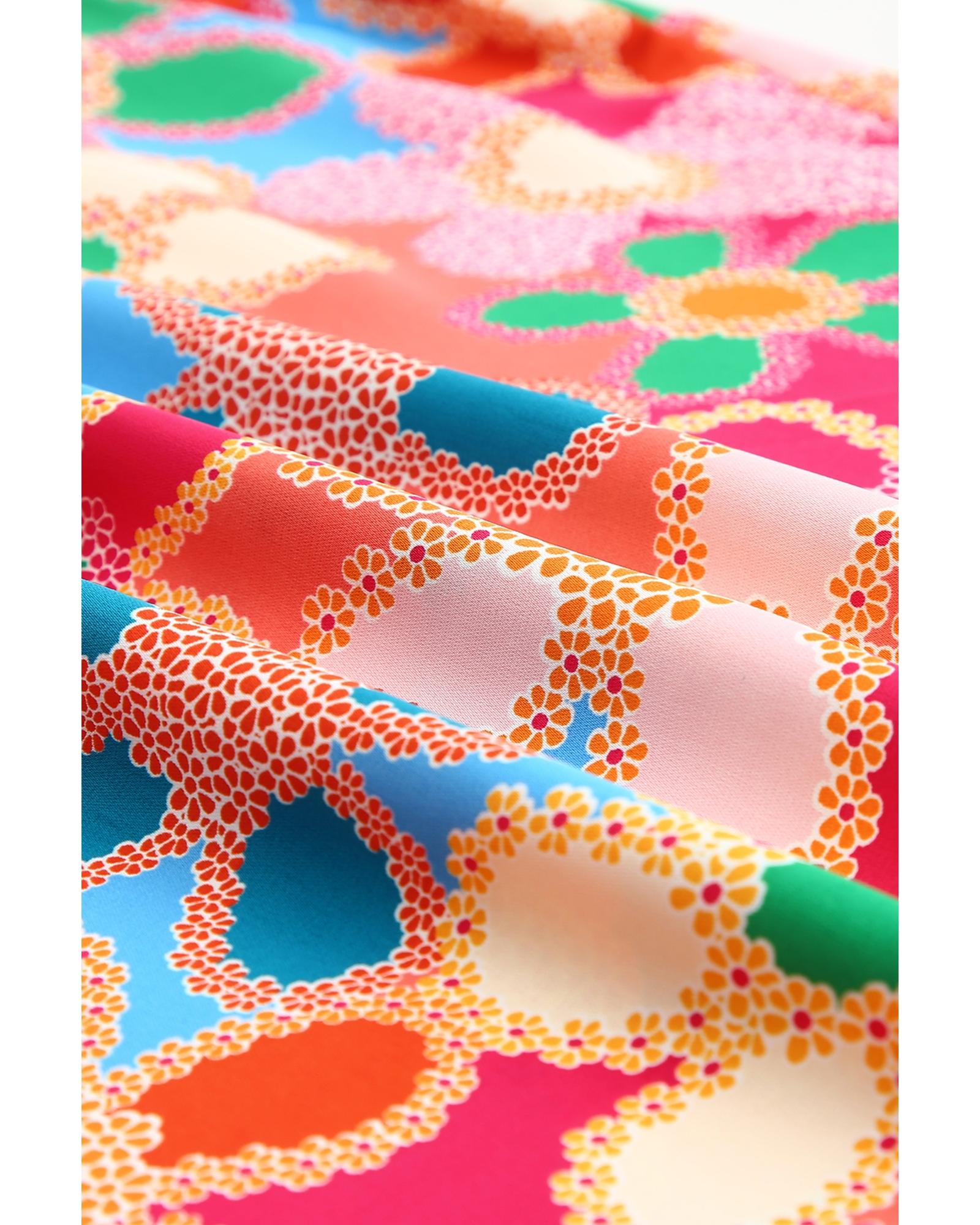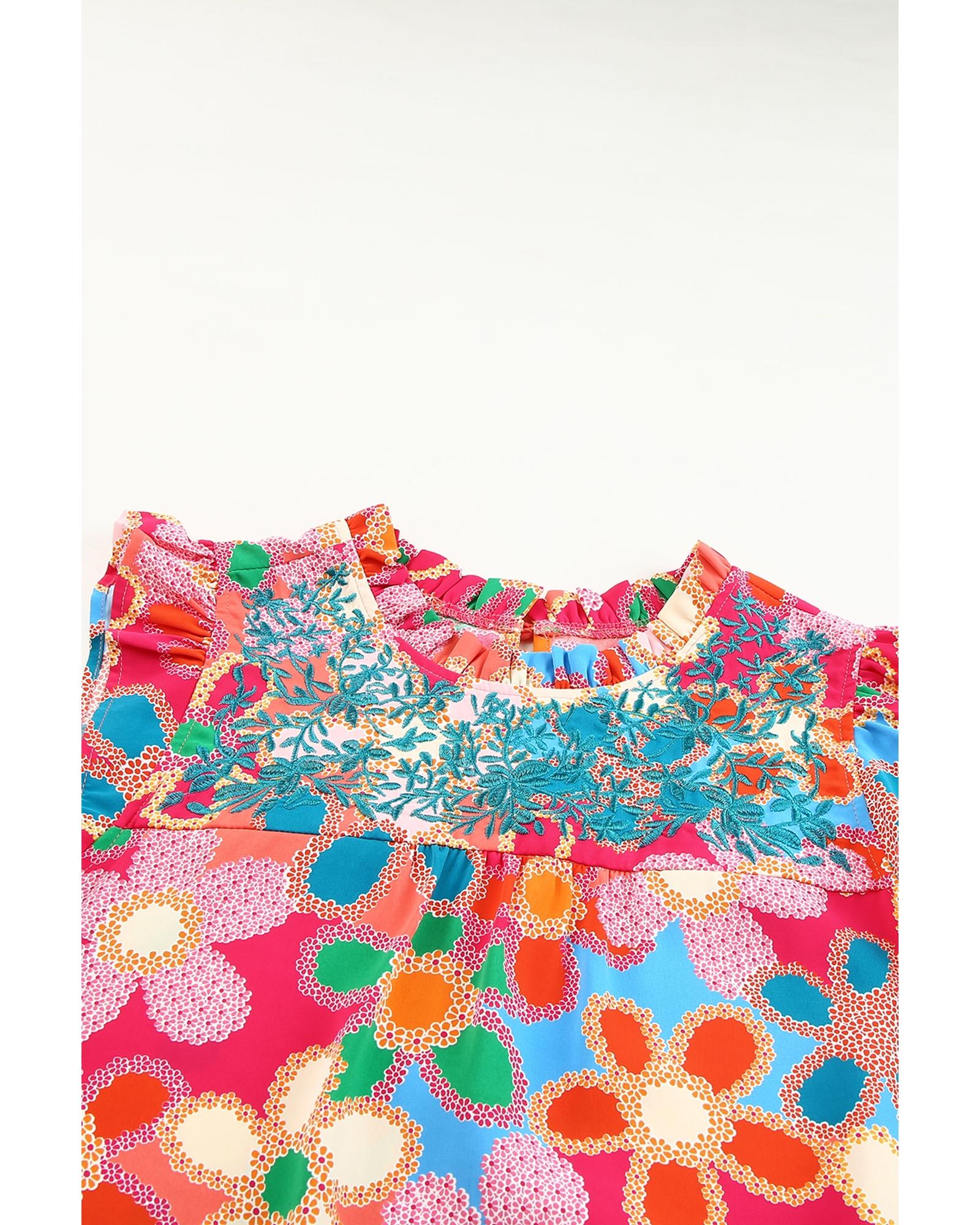 - Pink Embroidered Detail Floral Print Ruffle Trim Tank Top