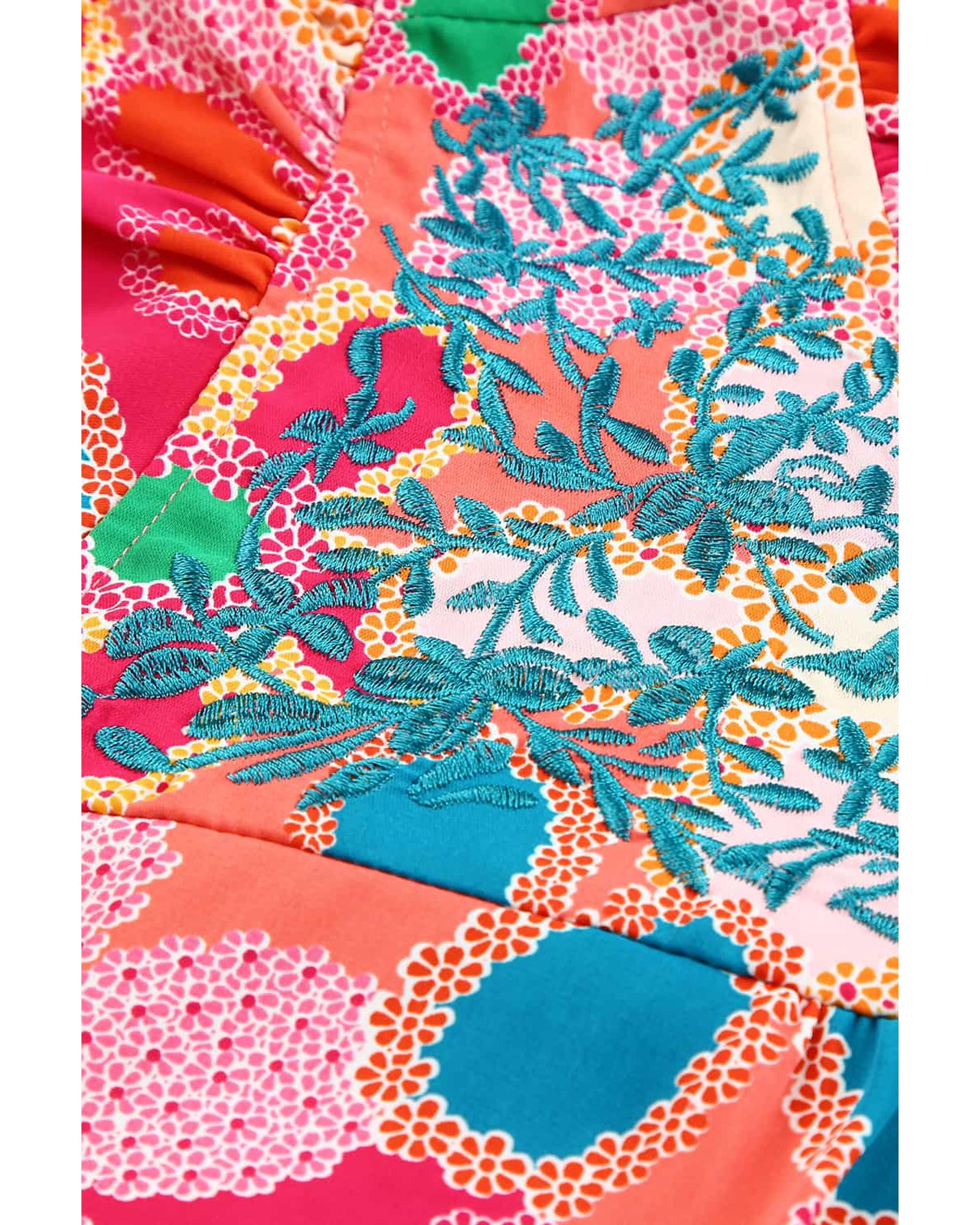 - Pink Embroidered Detail Floral Print Ruffle Trim Tank Top