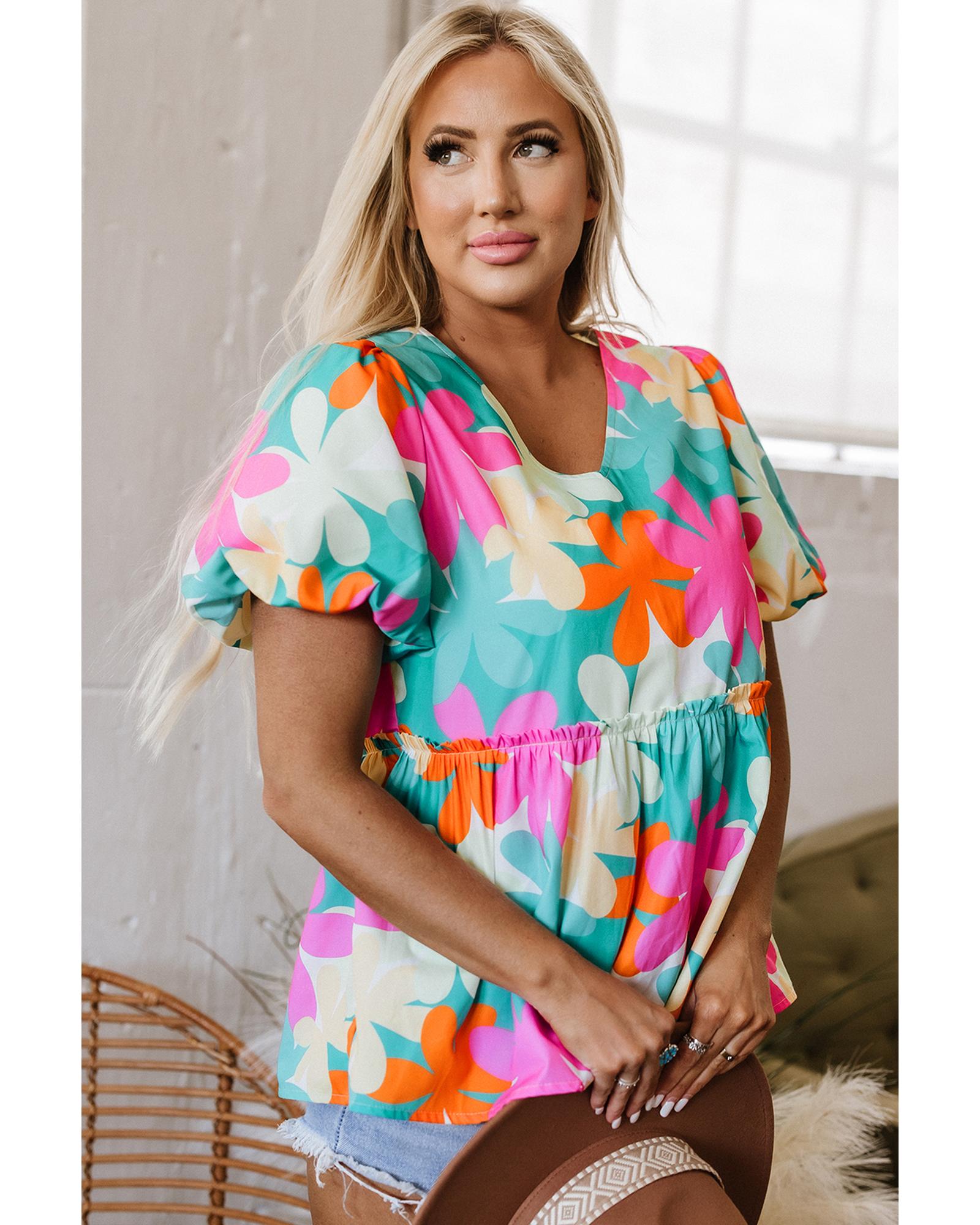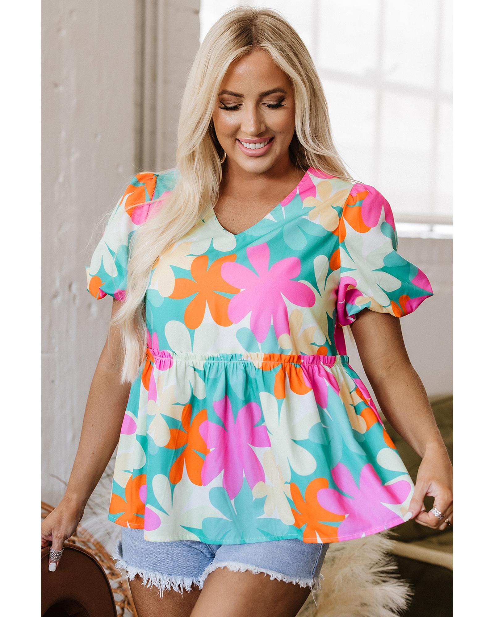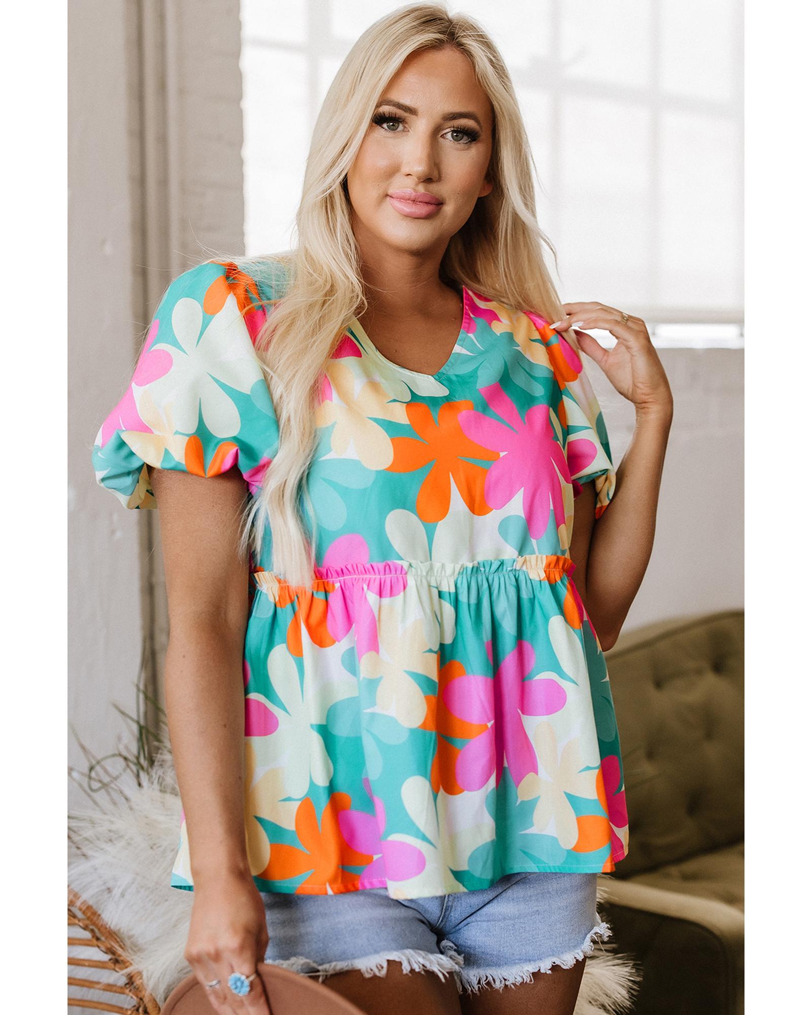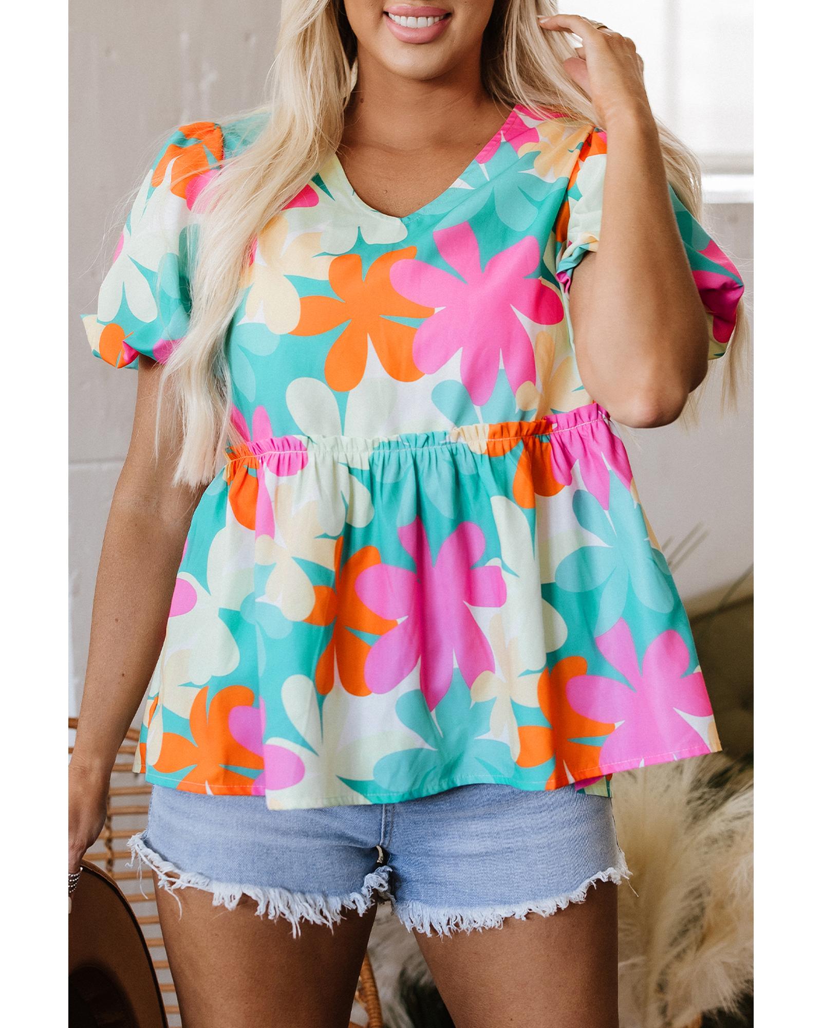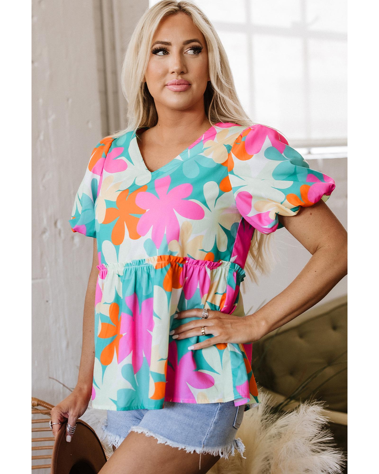 - Pink Floral Print Bubble Sleeve V Neck Peplum Blouse