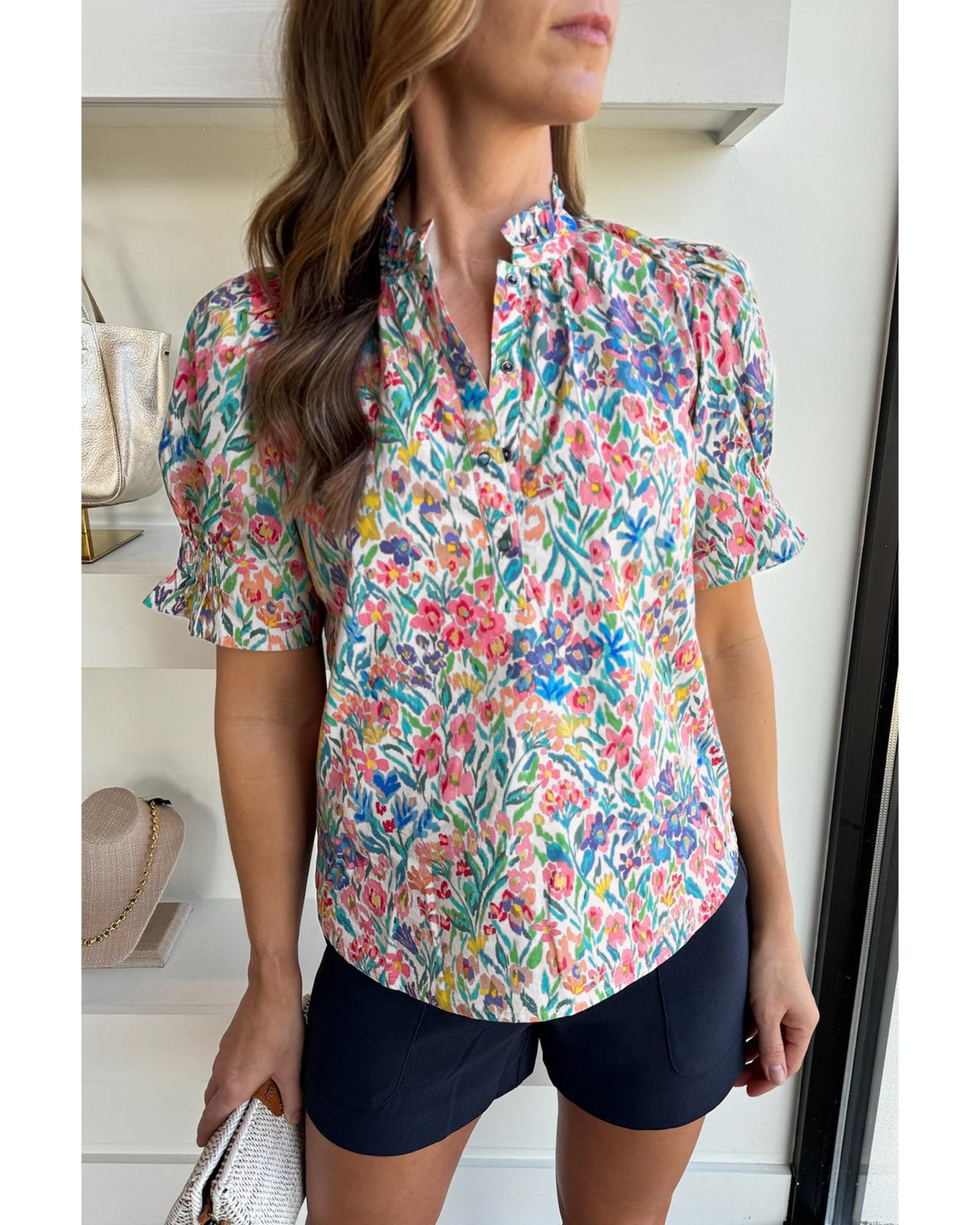 Pink Floral Print Button Split Neck Puff Sleeve Blouse – 2XL
