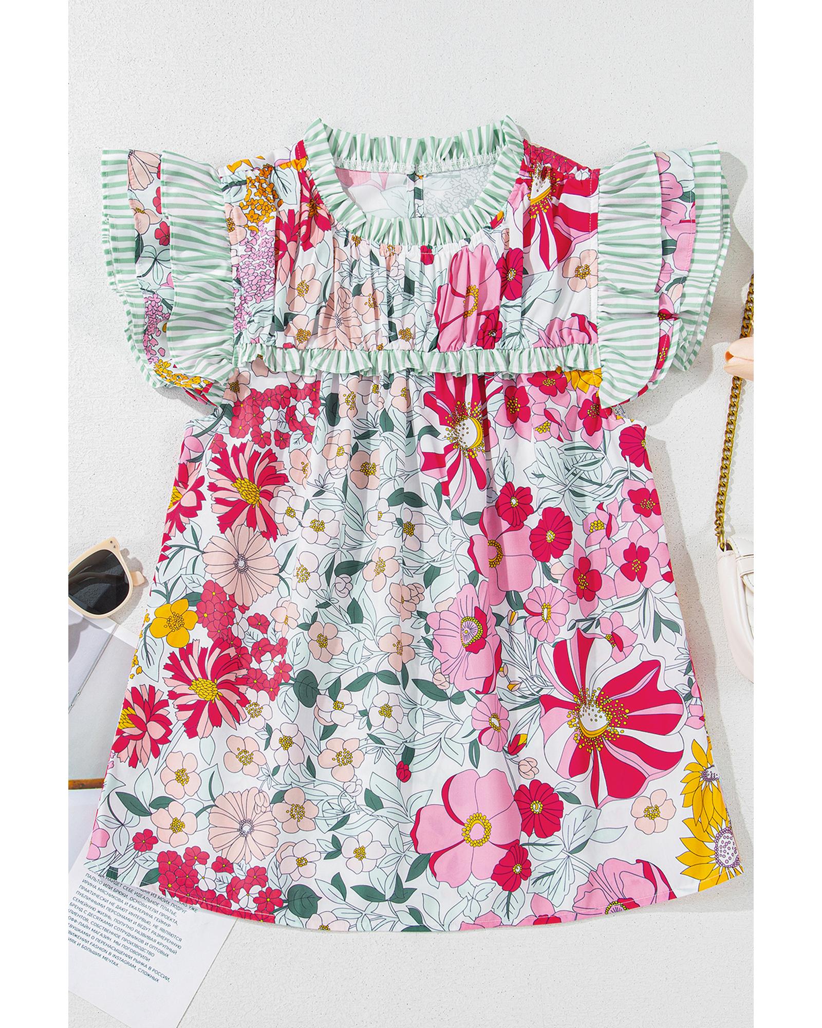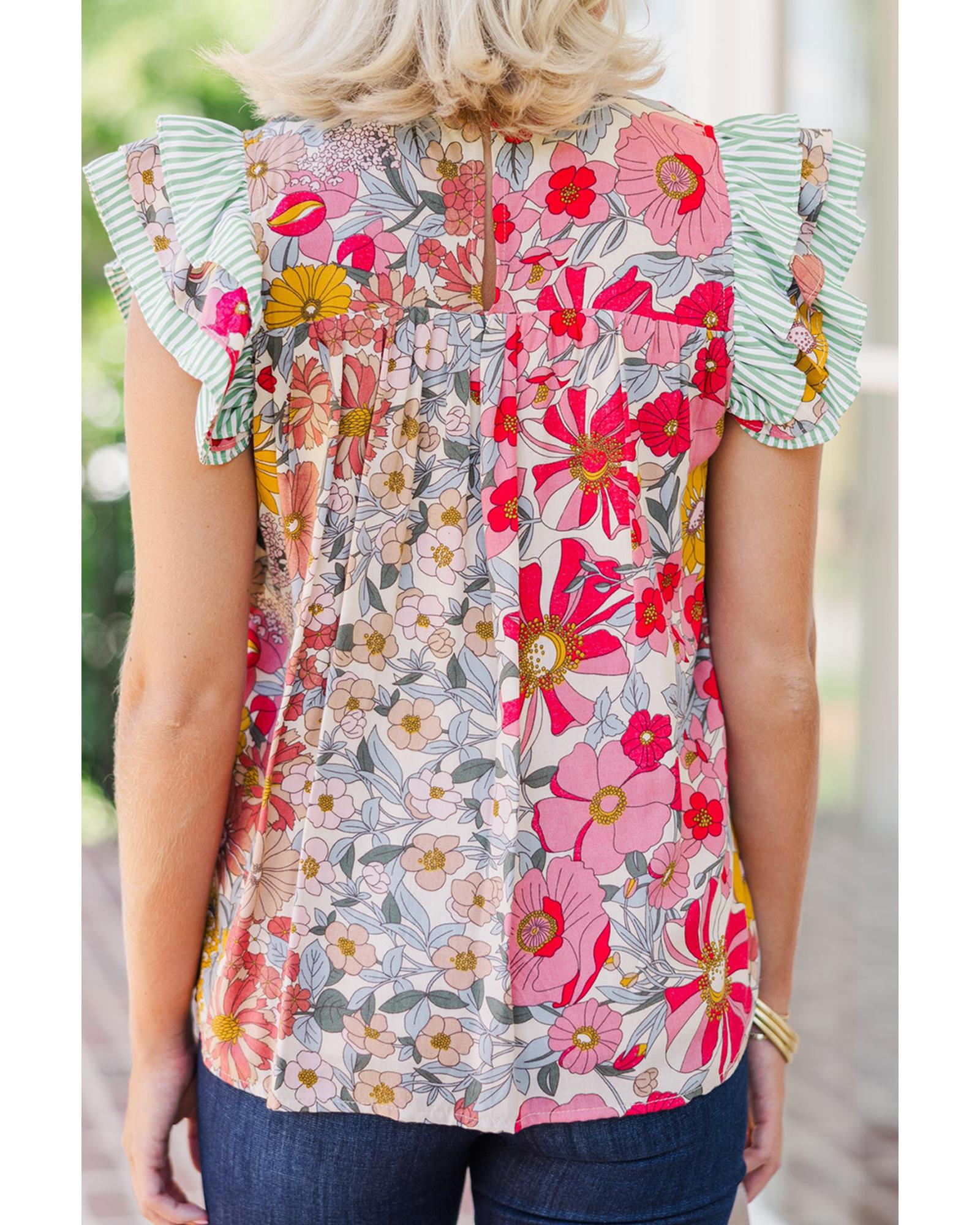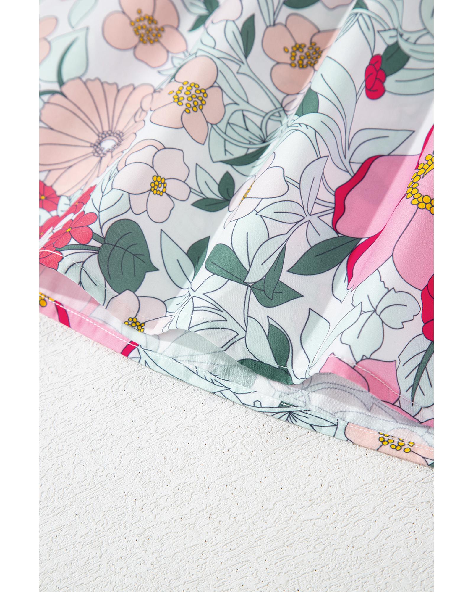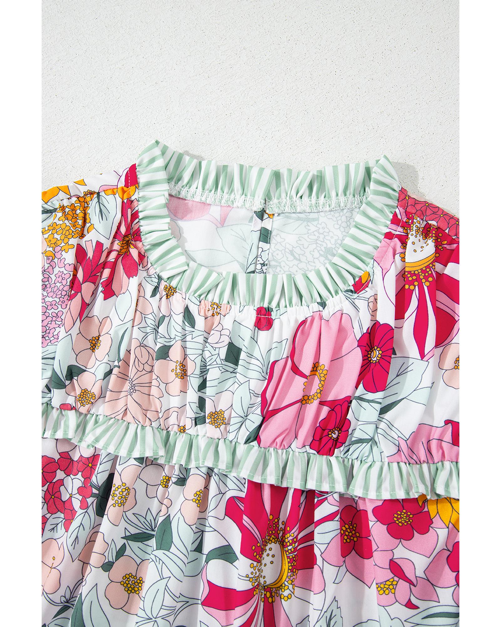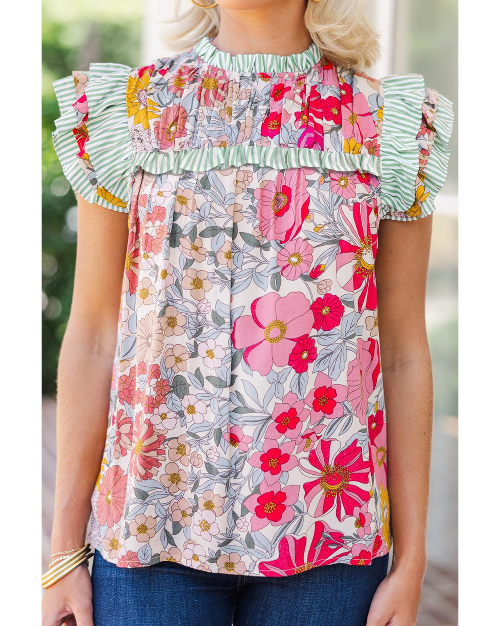 Pink Floral Print Contrast Ruffle Trim Short Sleeve Blouse – L