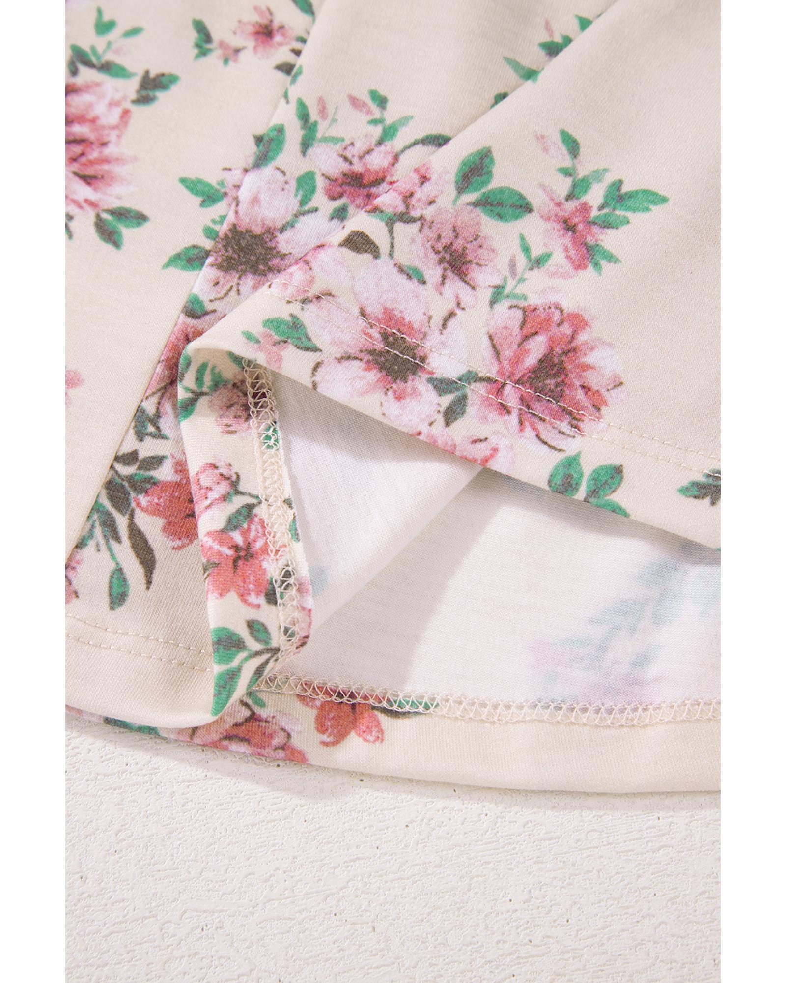 Pink Floral Print Pleated U Neck Loose Fit Blouse – L